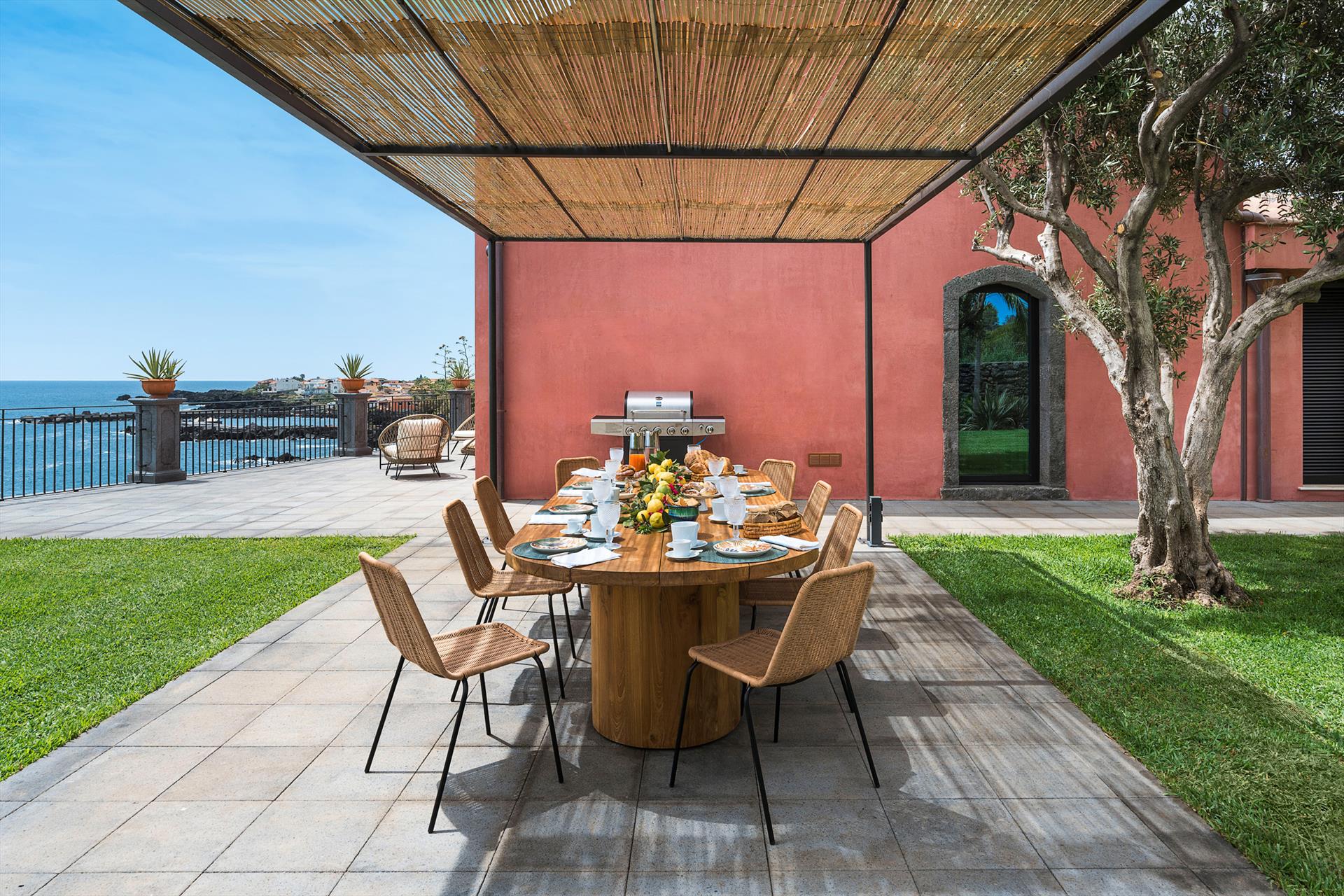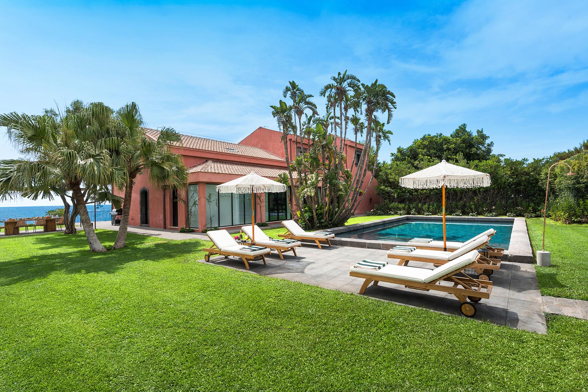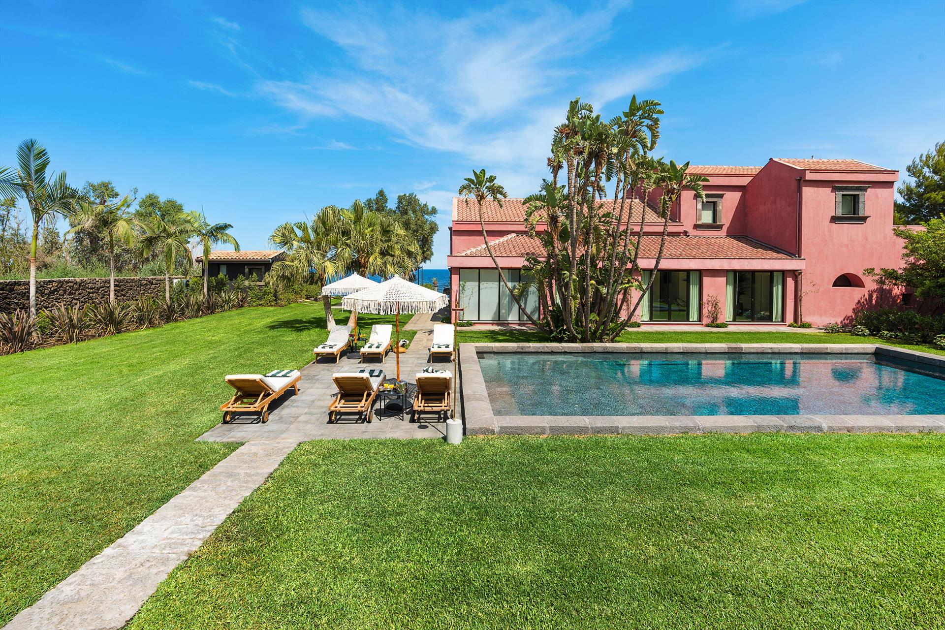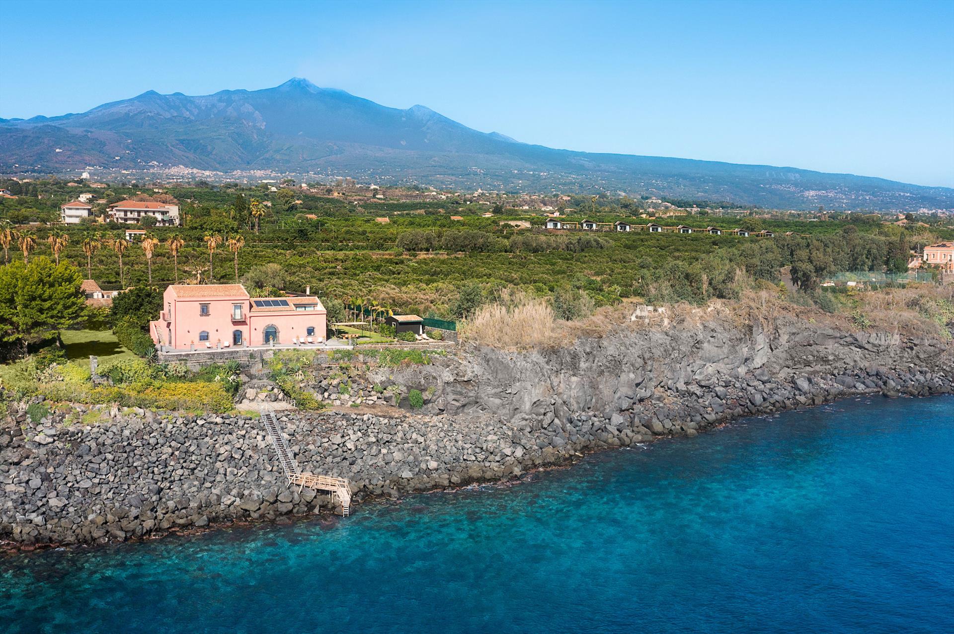 Villa Rosa Nero ist eine elegante und komfortable Villa mit Swimmingpool in Pozzillo, in der Nähe von Acireale, in herrlicher Lage direkt am Meer. Die Villa, die über einen schönen Swimmingpool mit Sonnenterrasse verfügt, ist von einem gepflegten mediterranen Garten und großen möblierten Terrassen umgeben, die an das Meer grenzen. Die exklusiven und gemütlichen Innenräume verteilen sich auf zwei Etagen und umfassen: im Erdgeschoss ein großes Wohnzimmer (TV), eine moderne und gut ausgestattete Küche, ein Esszimmer, ein Badezimmer, eine Waschküche und ein Doppelzimmer mit eigenem Bad/Dusche; im ersten Stock vervollständigen drei weitere Doppelzimmer, alle mit eigenem Bad/Dusche, den Schlafbereich. Die Residenz ist auch mit den besten Annehmlichkeiten ausgestattet, wie Klimaanlage (in allen Zimmern), Wi-Fi, 2 Smart-TVs, Waschmaschine, Trockner, Geschirrspüler, Elektroherd und Mikrowelle, Espresso- und amerikanische Kaffeemaschinen, Weinkeller, Eismaschine und Privatparkplatz. Die Villa Rosa Nero eignet sich perfekt für Familien und Gruppen von Freunden und ist ein idealer Ausgangspunkt, um die Wunder des östlichen Siziliens zu erkunden, darunter Taormina, den Ätna-Park, Acireale, Aci Trezza, Aci Castello und Catania.