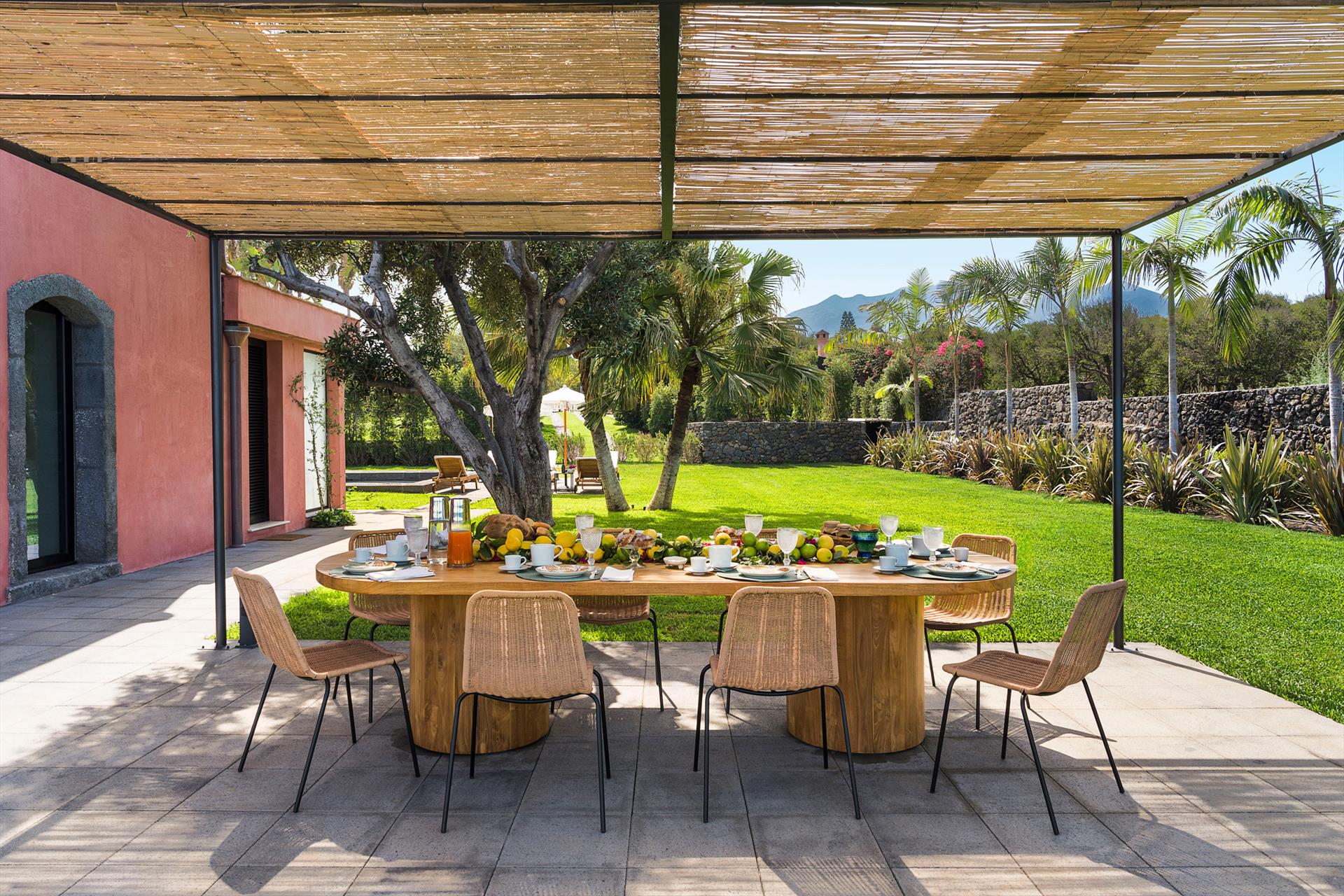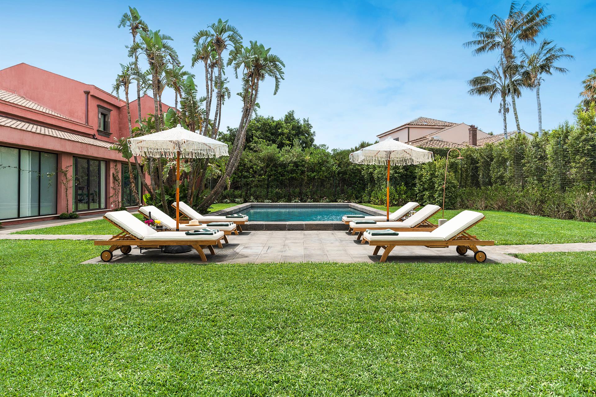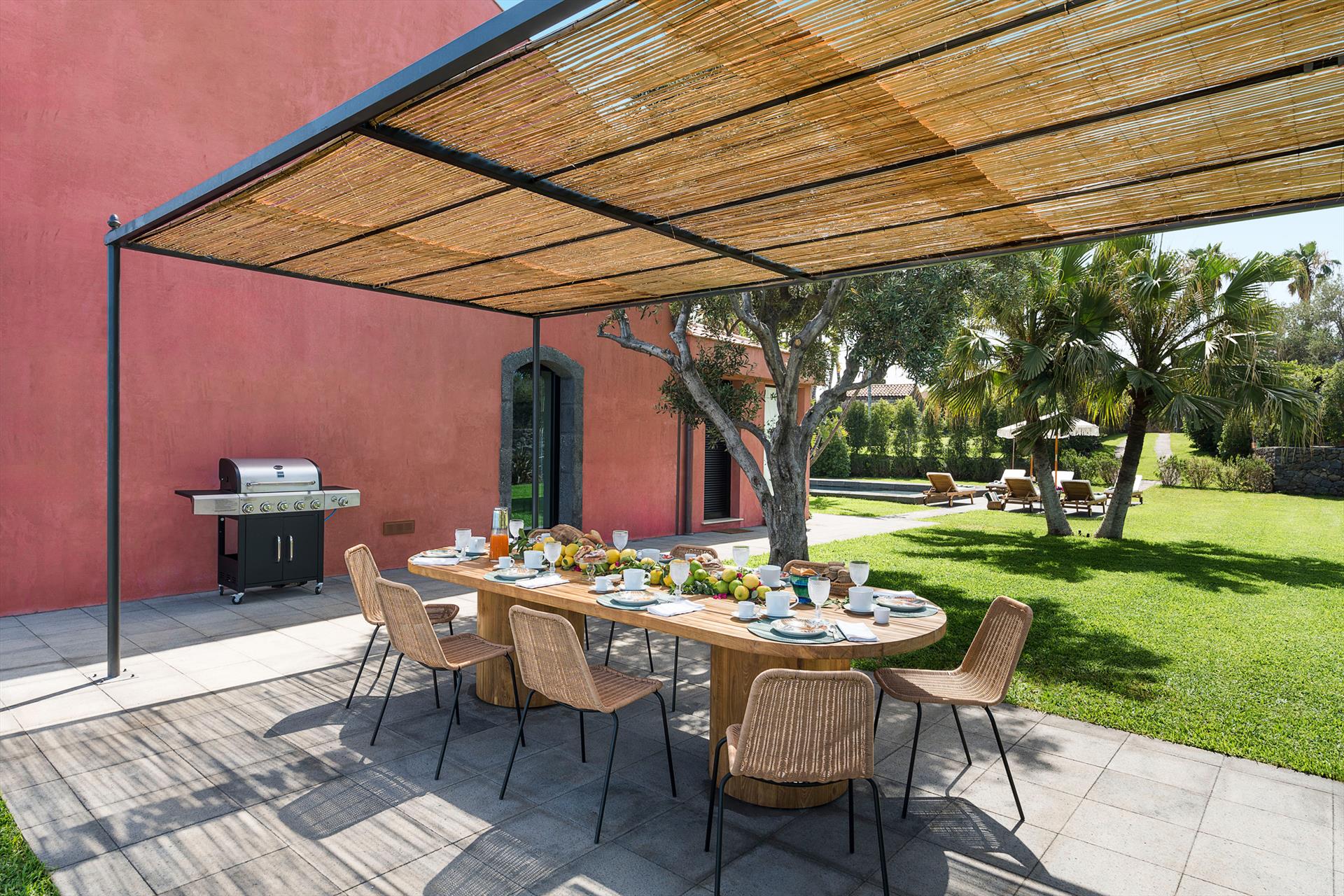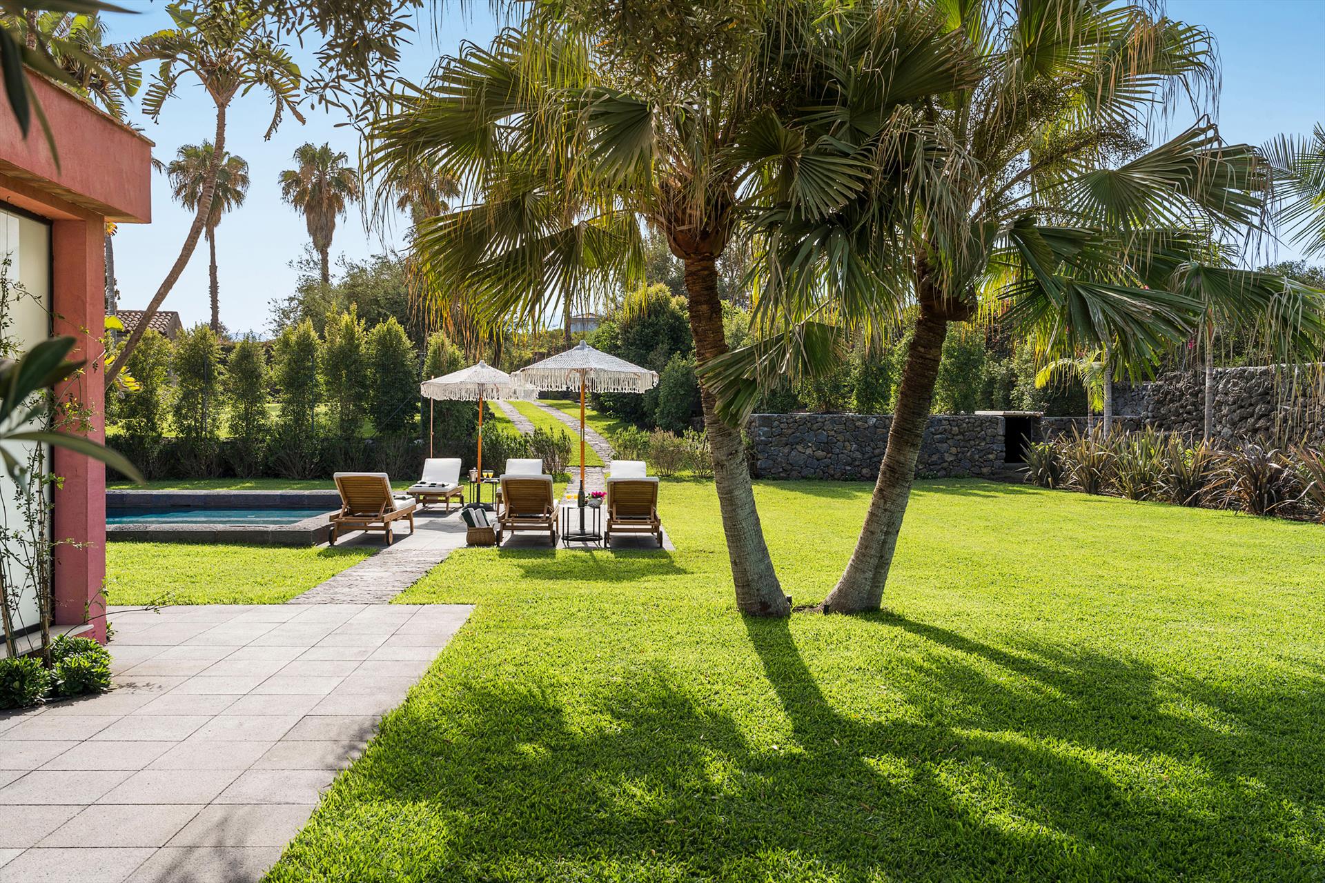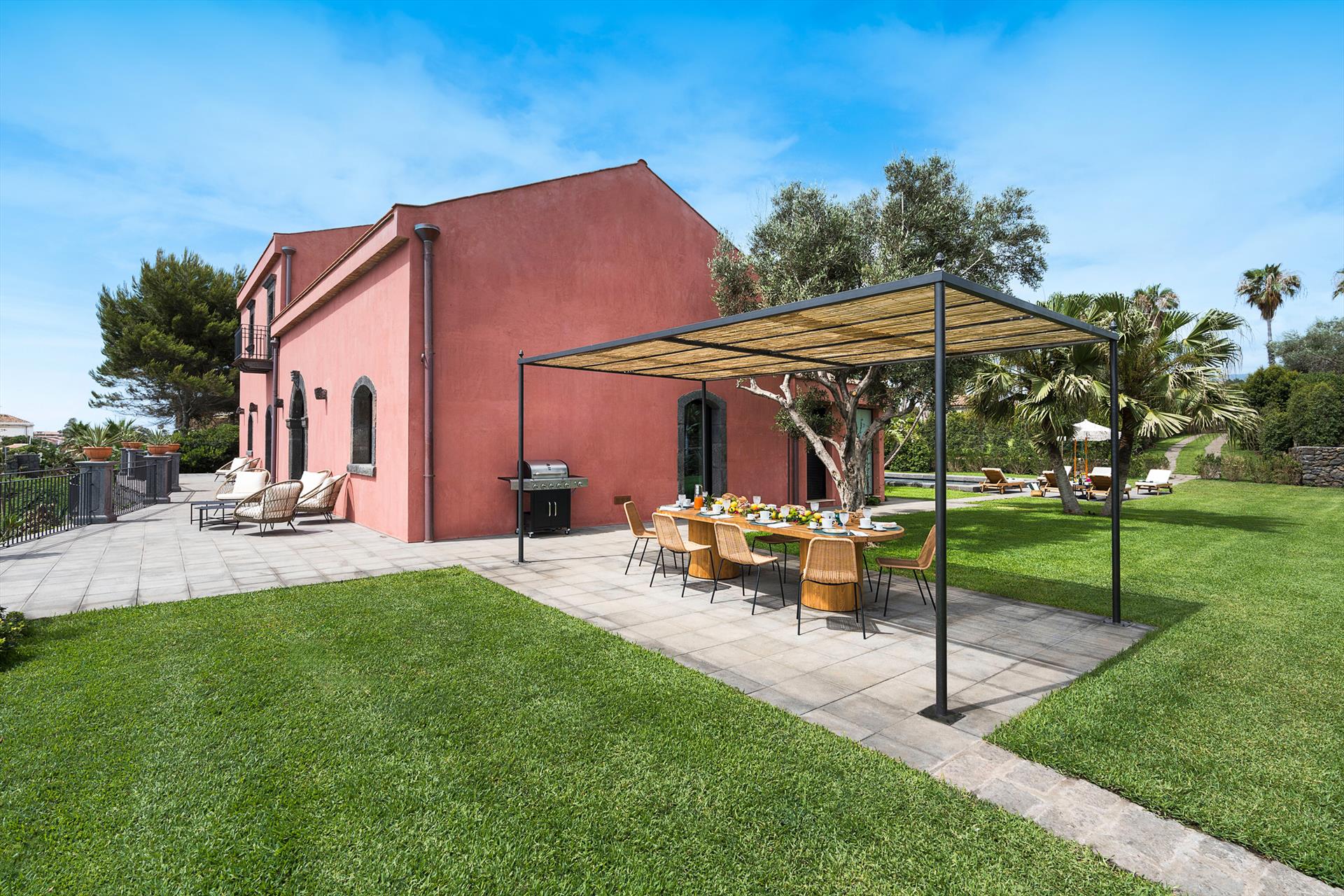 Villa Rosa Nero ist eine elegante und komfortable Villa mit Swimmingpool in Pozzillo, in der Nähe von Acireale, in herrlicher Lage direkt am Meer. Die Villa, die über einen schönen Swimmingpool mit Sonnenterrasse verfügt, ist von einem gepflegten mediterranen Garten und großen möblierten Terrassen umgeben, die an das Meer grenzen. Die exklusiven und gemütlichen Innenräume verteilen sich auf zwei Etagen und umfassen: im Erdgeschoss ein großes Wohnzimmer (TV), eine moderne und gut ausgestattete Küche, ein Esszimmer, ein Badezimmer, eine Waschküche und ein Doppelzimmer mit eigenem Bad/Dusche; im ersten Stock vervollständigen drei weitere Doppelzimmer, alle mit eigenem Bad/Dusche, den Schlafbereich. Die Residenz ist auch mit den besten Annehmlichkeiten ausgestattet, wie Klimaanlage (in allen Zimmern), Wi-Fi, 2 Smart-TVs, Waschmaschine, Trockner, Geschirrspüler, Elektroherd und Mikrowelle, Espresso- und amerikanische Kaffeemaschinen, Weinkeller, Eismaschine und Privatparkplatz. Die Villa Rosa Nero eignet sich perfekt für Familien und Gruppen von Freunden und ist ein idealer Ausgangspunkt, um die Wunder des östlichen Siziliens zu erkunden, darunter Taormina, den Ätna-Park, Acireale, Aci Trezza, Aci Castello und Catania.
