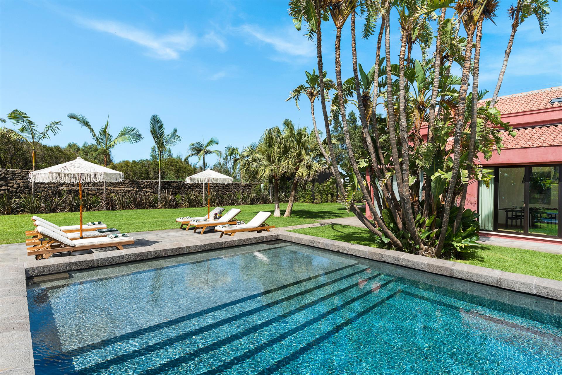 Poolhaus (Umkleideraum, Bad mit Dusche), Innenhof mit Pergola, Terrassen, Garten, Schwimmbad und Solarium.