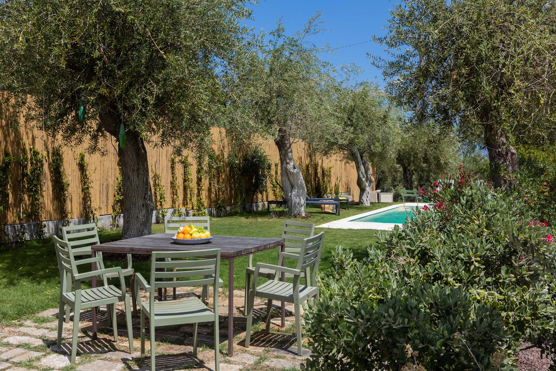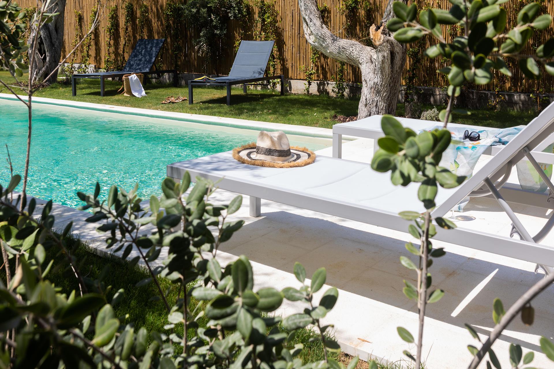 Swimmingpool (3 x 8 m), Außendusche, Sonnenterrasse, Ess- und Sitzecke, mediterraner Garten, Parkplatz.