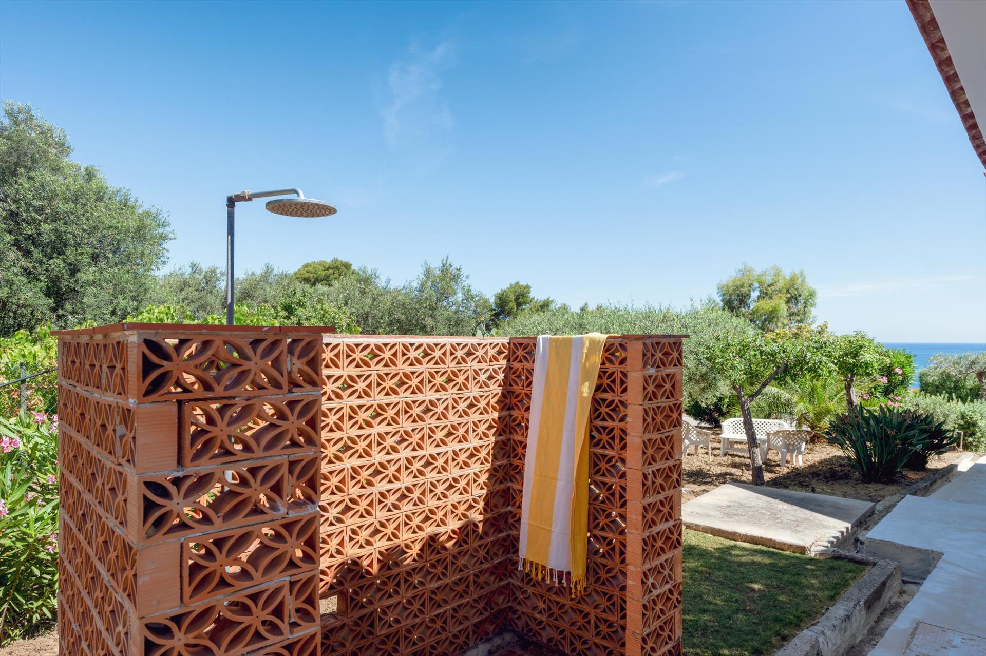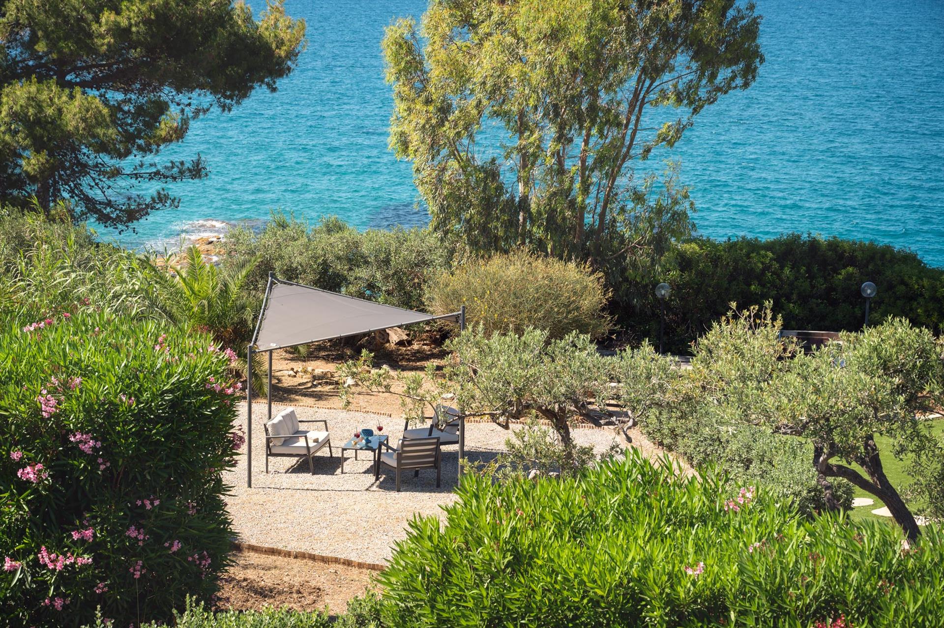 Die Villa ist von einem weitläufigen, mediterranen Garten mit Palmen, Olivenbäumen, Oleanderbüschen, Bougainville, umgeben. Niedrige Trockenmauern umgeben den neu gerichteten Sitzplatz mit einzigartigem Blick, ideal um Ihren Aperitiv zu geniessen oder einfach die Seele baumeln lassen können. Von hier aus gelangen Sie über ein privates Gartentor direkt zum unterhalb des Garten gelegenen Felsstrands. Der Sandstrand befindet sich rund 5 Gehminuten von der Villa.