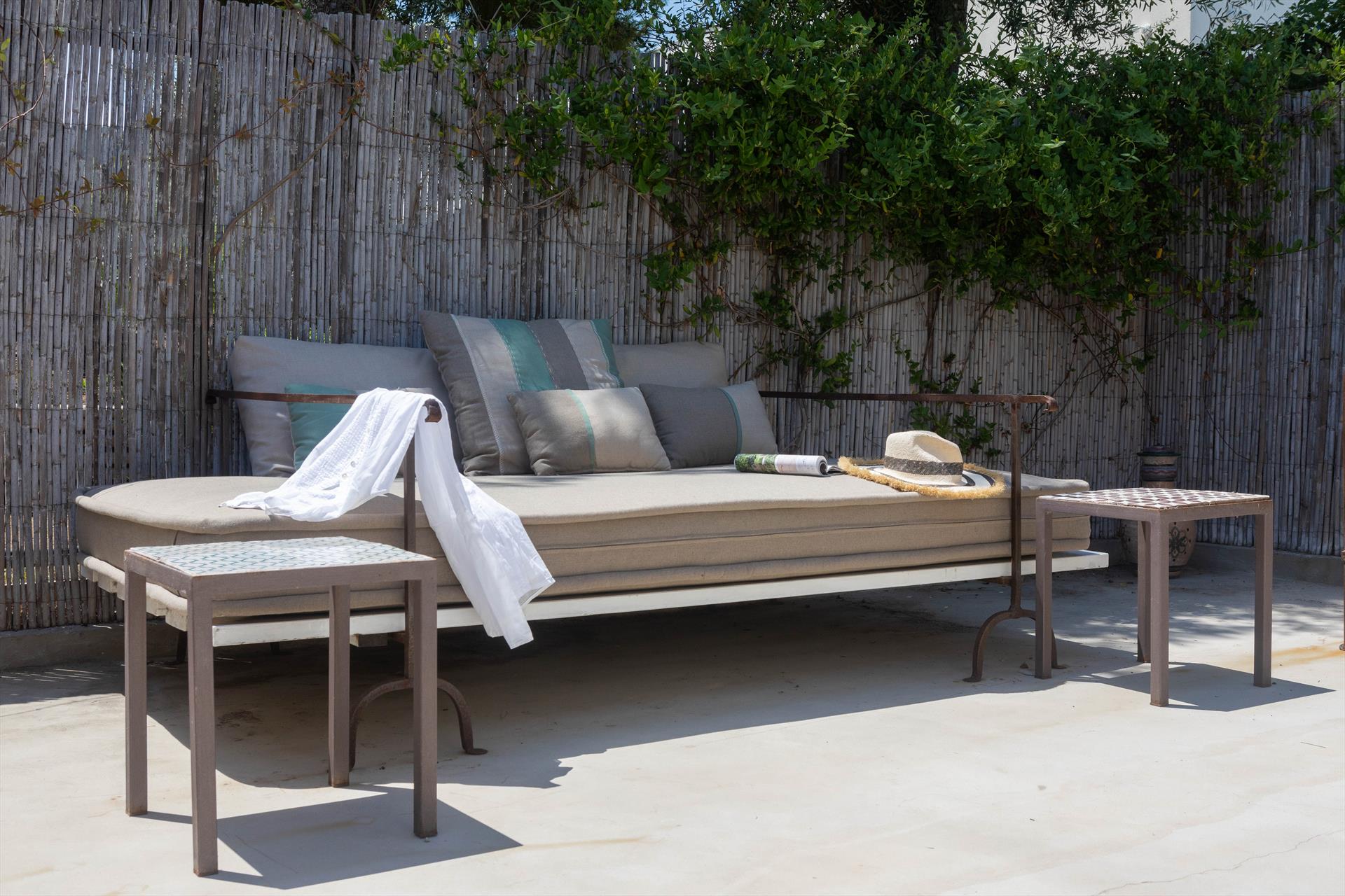 Swimmingpool (3 x 8 m), Außendusche, Sonnenterrasse, Ess- und Sitzecke, mediterraner Garten, Parkplatz.