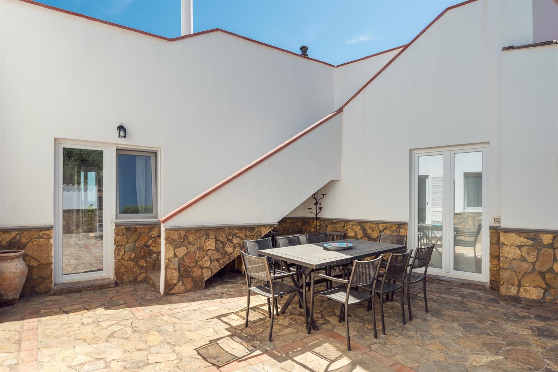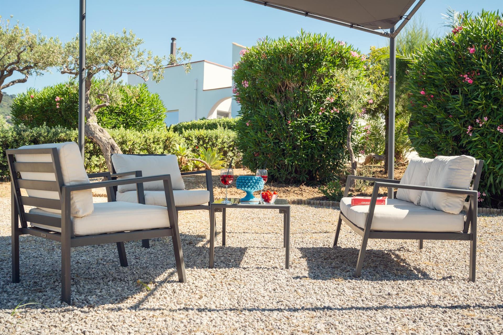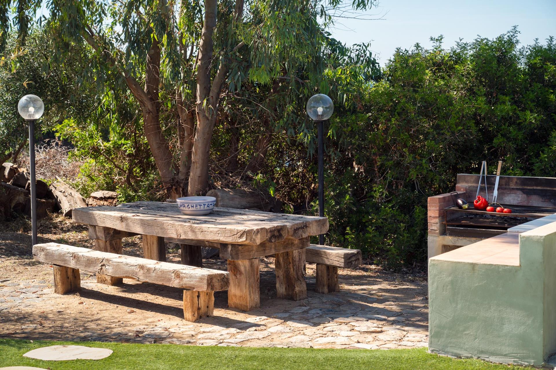 Die Villa ist von einem weitläufigen, mediterranen Garten mit Palmen, Olivenbäumen, Oleanderbüschen, Bougainville, umgeben. Niedrige Trockenmauern umgeben den neu gerichteten Sitzplatz mit einzigartigem Blick, ideal um Ihren Aperitiv zu geniessen oder einfach die Seele baumeln lassen können. Von hier aus gelangen Sie über ein privates Gartentor direkt zum unterhalb des Garten gelegenen Felsstrands. Der Sandstrand befindet sich rund 5 Gehminuten von der Villa.