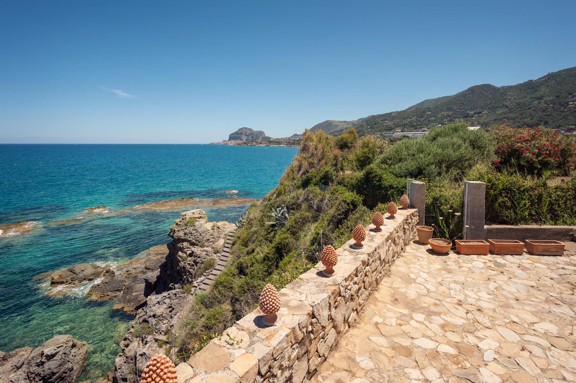 Sowohl von der Terrasse als auch von der Villa aus können Sie den Blick über das Meer und die malerische Küste, sowie auf die 'Skyeline' von Cefalu mit dem Rocca-Felsen und den Zwillingstürmen des normannischen Doms geniessen.