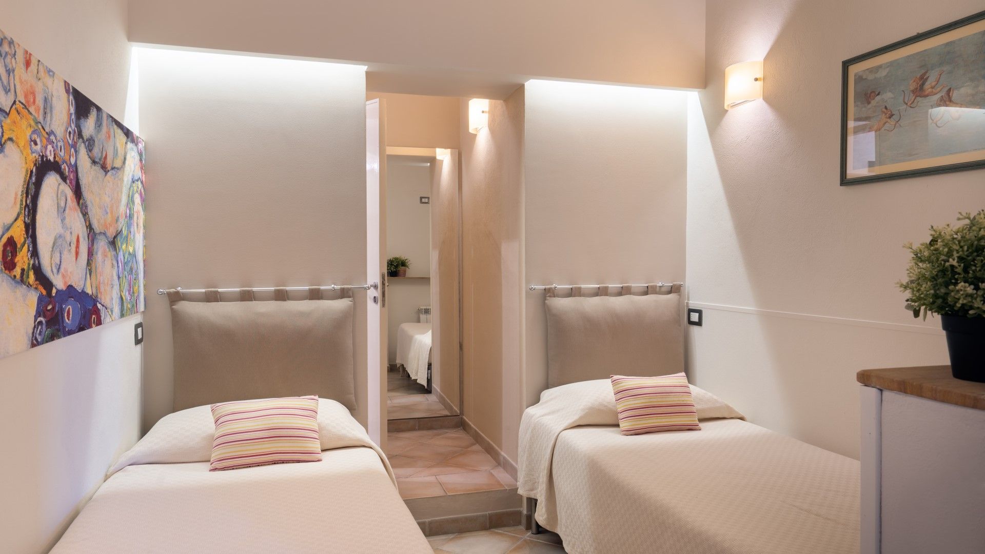 Der zentrale Teil der Villa bietet Platz für bis zu sechs Personen in zwei Doppelzimmern und einem Zweibettzimmer mit eigenem Bad. Ein großes Wohnzimmer mit Küche, Essbereich und Sitzecke öffnet sich zur Hauptterrasse. Sie ist schattig und mit einem Esstisch ausgestattet und eignet sich perfekt für ein Treffen der gesamten Gruppe zu jeder Tageszeit.