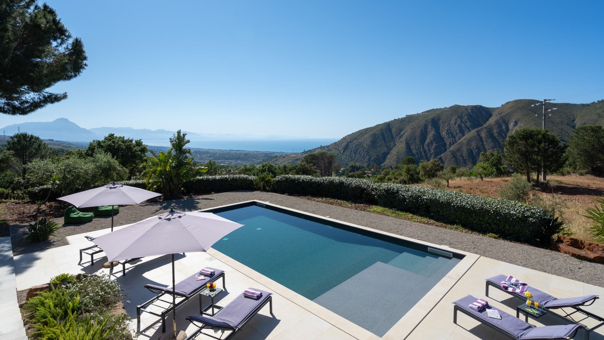 Auf einem Hügel gelegen, ist die Villa Vittoria von Bergen umgeben und das Meer der Bucht von Palermo liegt direkt vor dem Garten. Draußen gibt es eine große überdachte Terrasse, einen 12-Meter-Pool und eine Außendusche, um sich abzukühlen, bevor man sich um den Grill versammelt und Mahlzeiten zubereitet, die im Freien geteilt werden.