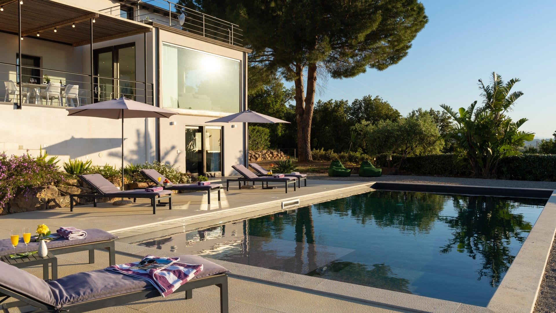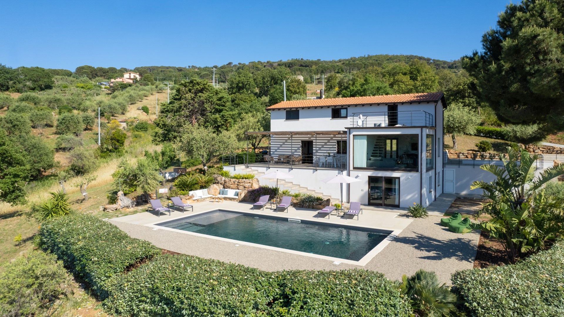 Der einfache, essentielle, komfortable und moderne Stil der Wohnküche setzt sich auch in den Schlafzimmern und Bädern fort. In der Etage unter der Wohnküche befinden sich ein Badezimmer mit Dusche, ein Doppelzimmer und ein Zweibettzimmer mit Fenster zum Poolbereich. Im Obergeschoss befinden sich ein Badezimmer, ein Doppelschlafzimmer und ein Zweibettzimmer. Erster Stock: Doppelschlafzimmer mit Klimaanlage, Zweibettzimmer mit Klimaanlage, Gemeinschaftsbad mit Dusche und Badewanne. Mittlere Ebene: Offenes Wohnzimmer mit Sofa, Küche, Esstisch, Gästebad, Waschküche und Zugang zu einer möblierten Terrasse für Mahlzeiten im Freien. Pool-Ebene: Doppelzimmer mit Klimaanlage, ein Badezimmer mit Dusche, Zweibettzimmer mit Klimaanlage.