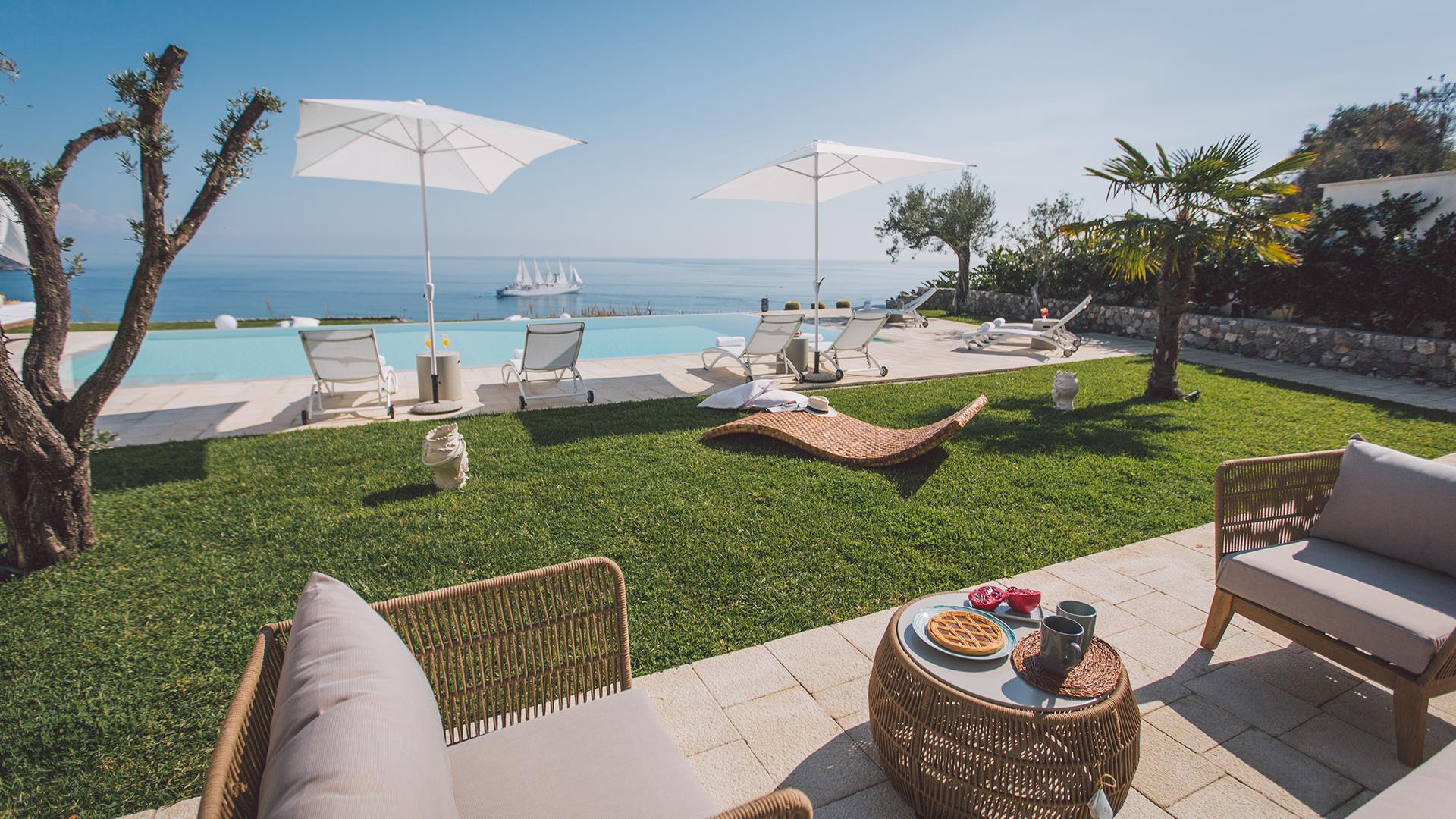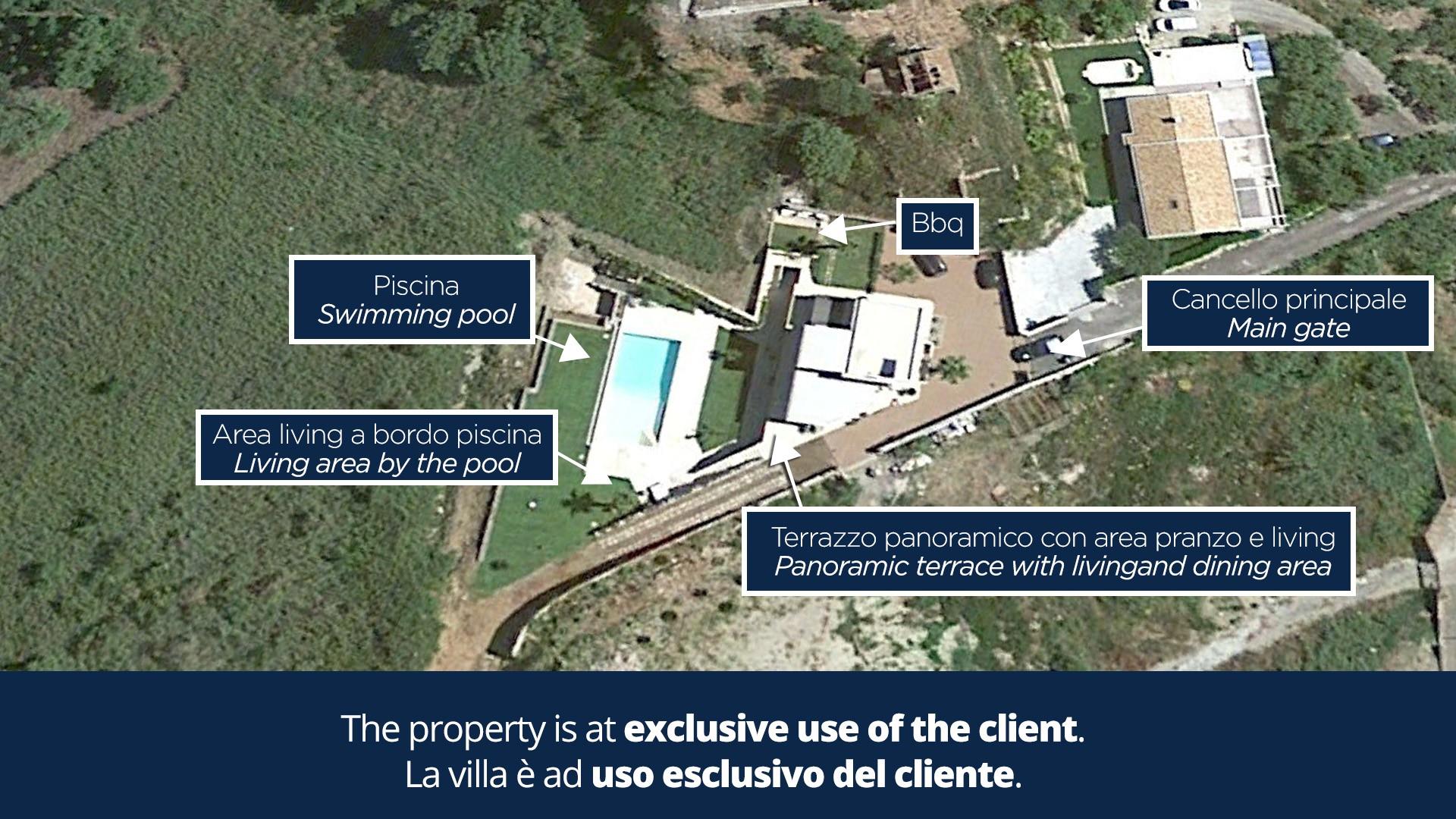 Der Außenbereich des Anwesens zeichnet sich durch ein ca. 2000 qm großes Grundstück aus, zu dem ein Parkplatz gehört, der bequem Platz für bis zu 3 Autos bietet. Der Hauptteil des Gartens befindet sich auf der Panoramaseite des Grundstücks, wo sich auch der Swimmingpool befindet. Dieser Bereich ist mit Rasen kultiviert, mit der Anwesenheit auch von Hecken von Sträuchern und typischen mediterranen Pflanzen. Die große Terrasse auf der Hauptetage, mit einem spektakulären Blick auf das Meer von Giardini Naxos, ist mit einem Außenwohnbereich, einem Essbereich und einem Grill ausgestattet.