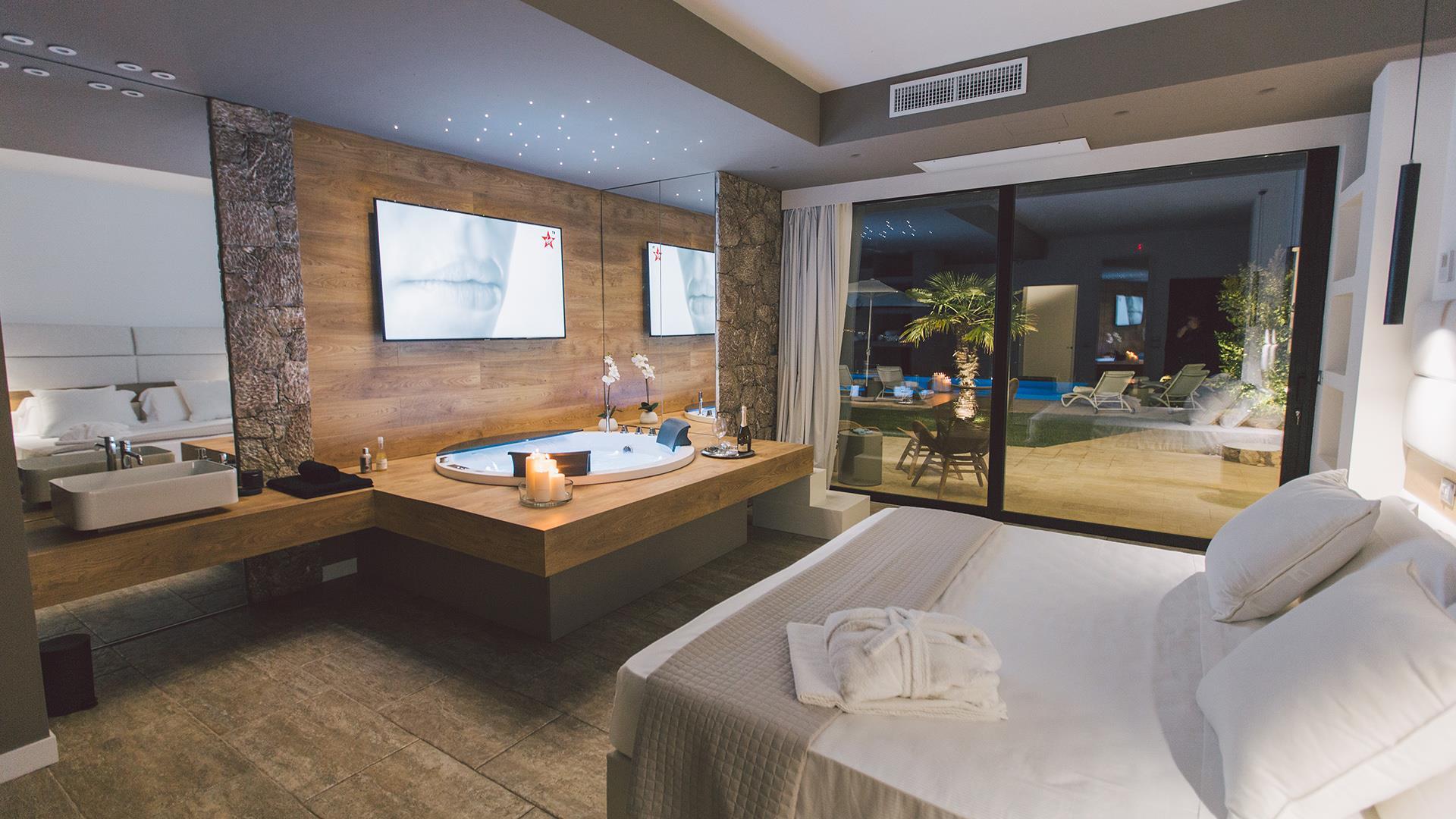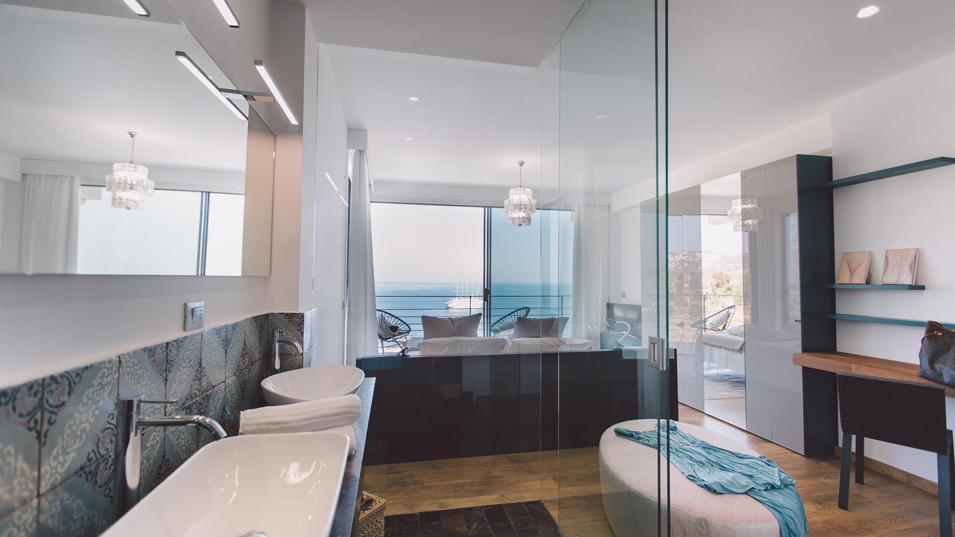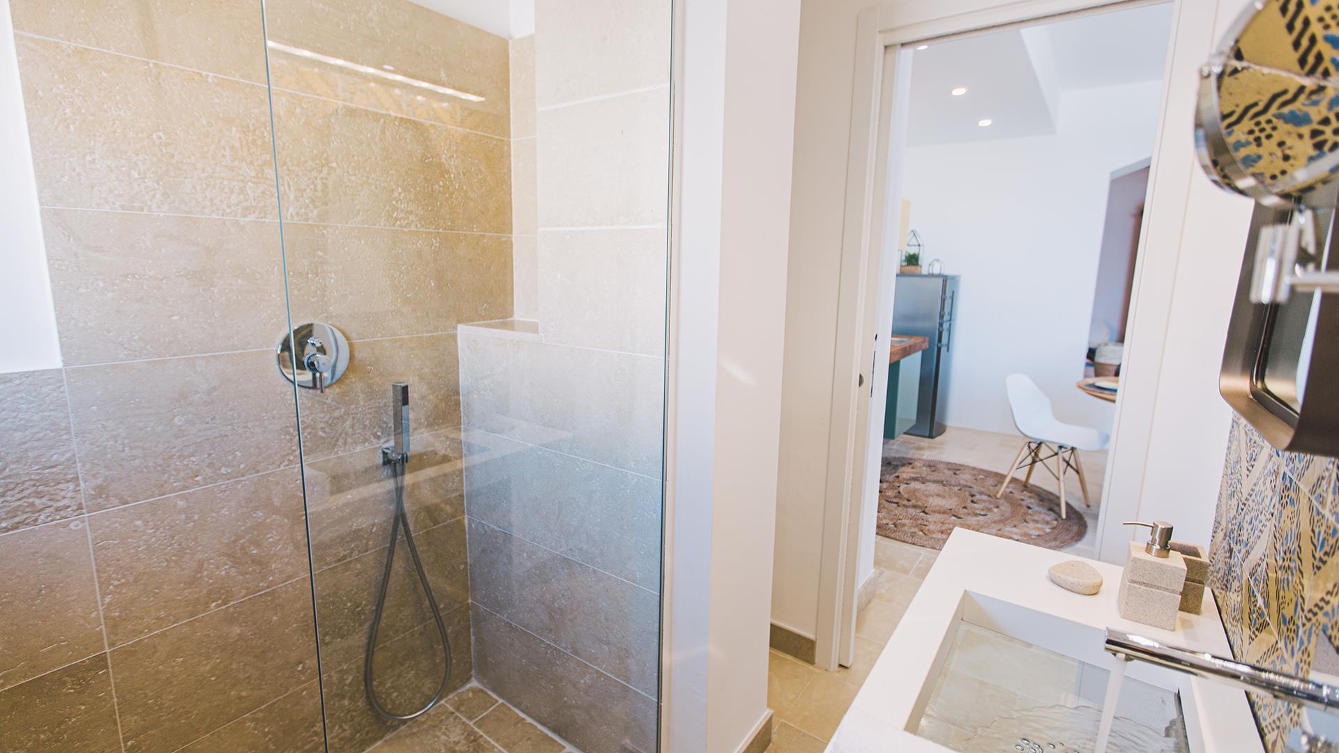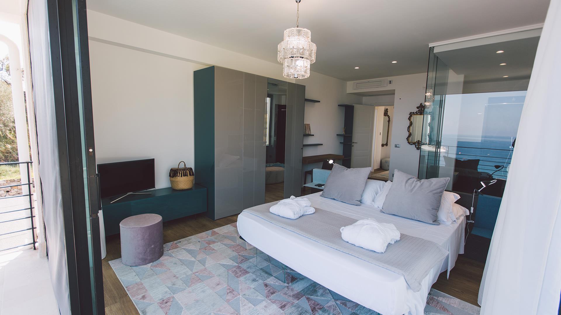 Das Anwesen besteht aus einem Hauptgebäude von ca. 300 qm, das sich auf drei Ebenen verteilt. Der Eingang führt in das Erdgeschoss, wo sich ein großer offener Raum mit einem Wohnzimmer, Esszimmer und Küche befindet. Die Etage wird durch ein Schlafzimmer mit Doppelbett und ein Badezimmer mit Dusche vervollständigt. Wenn man die Treppe vom Erdgeschoss in den ersten Stock hinaufsteigt, befinden sich dort zwei Schlafzimmer mit eigenem Bad mit Dusche und Meerblick. Wenn man die Treppe vom Erdgeschoss in das Untergeschoss hinuntersteigt, befinden sich dort zwei große Suiten mit Bad mit Dusche, von denen eine über eine Whirlpool-Badewanne und die andere über eine kleine Küchenzeile und ein Rundbett verfügt. Die Zimmer im Erdgeschoss und im ersten Stock haben alle Zugang zu Terrassen, während die beiden Zimmer im Untergeschoss auch direkten Zugang zum Poolbereich haben.