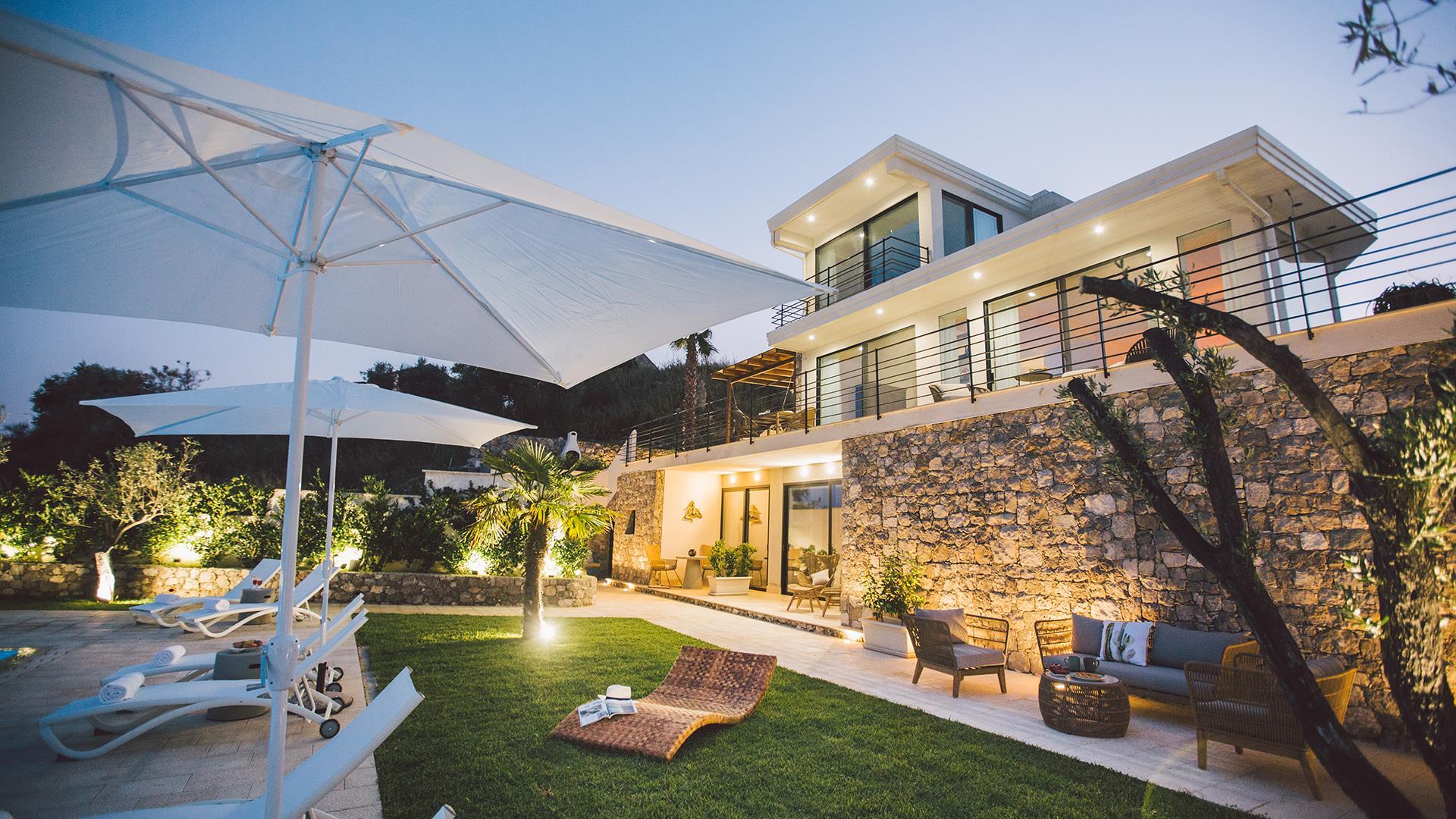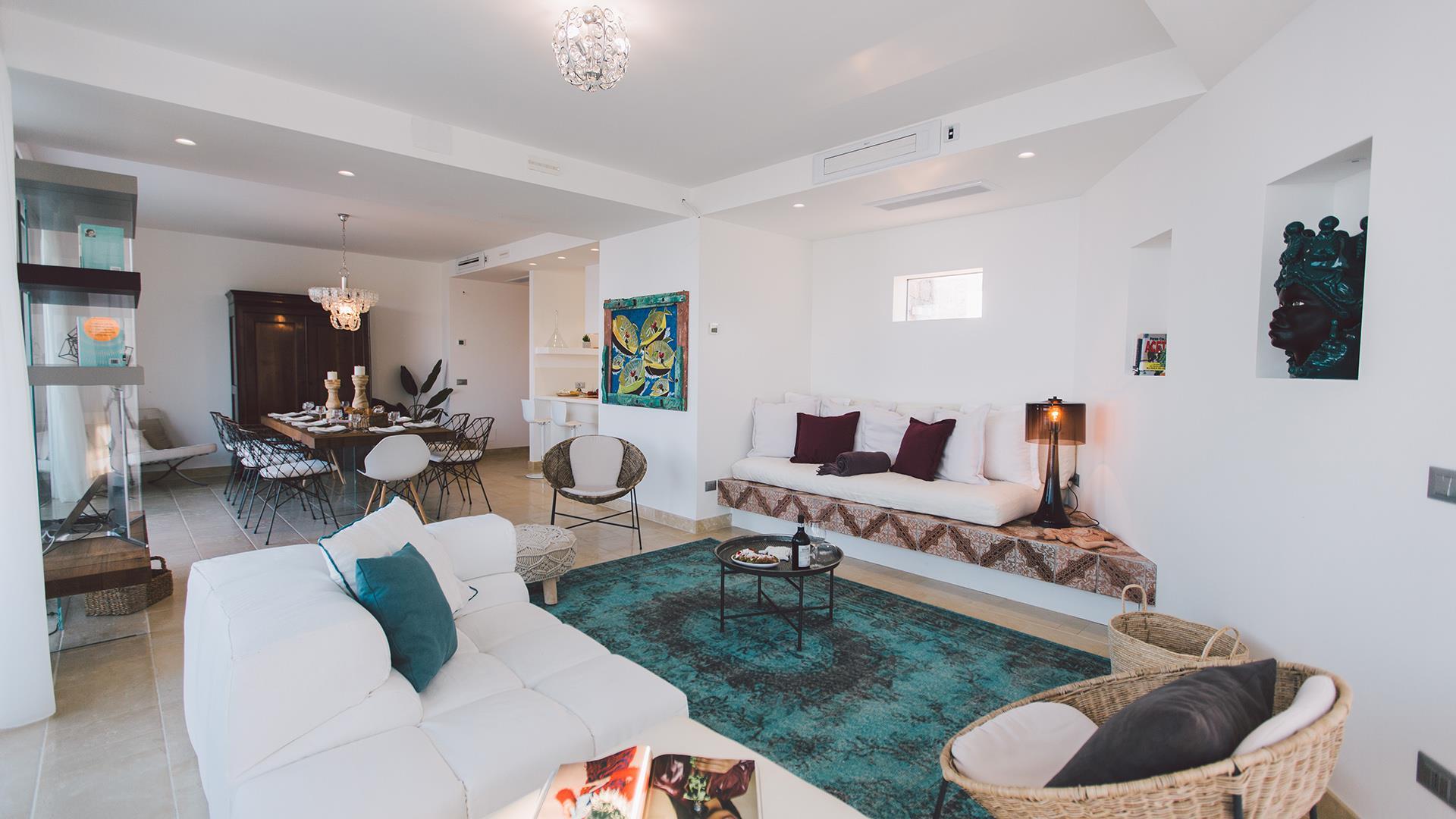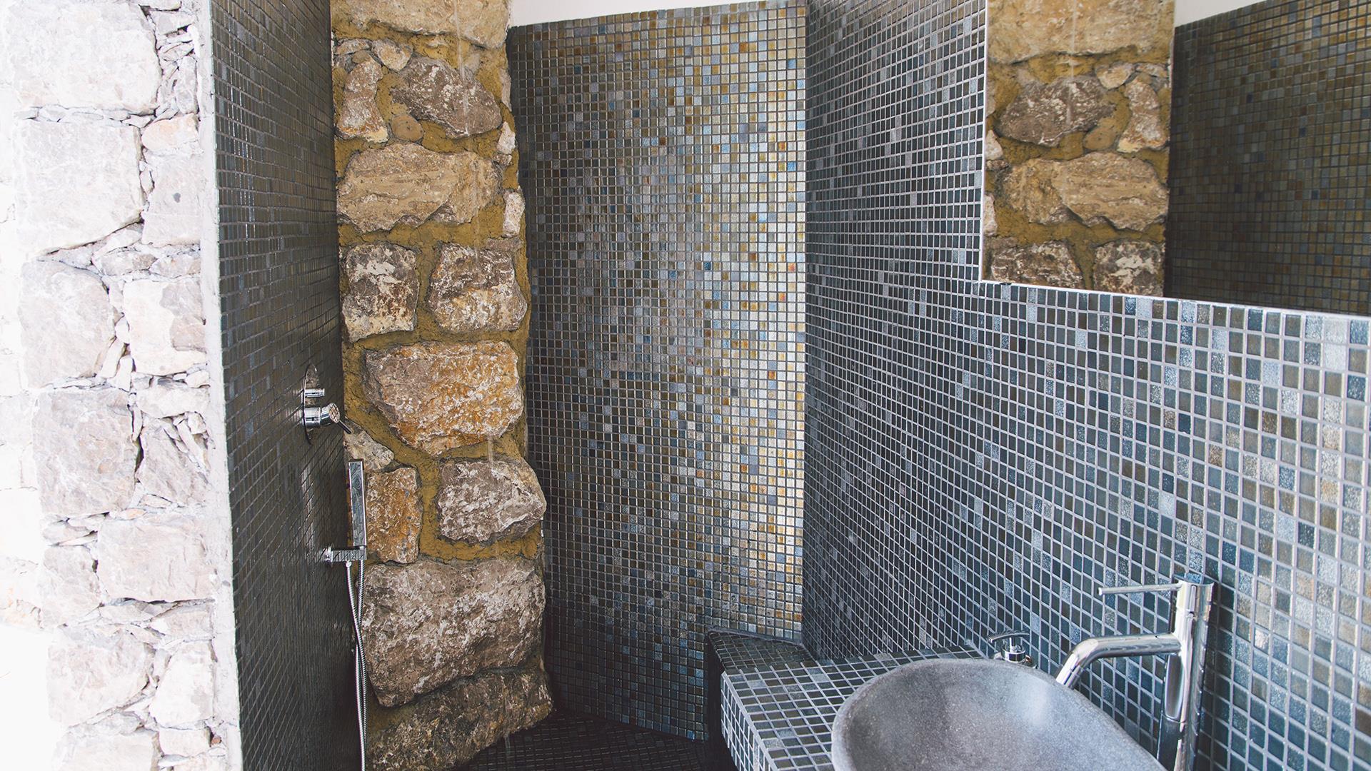 Das Anwesen besteht aus einem Hauptgebäude von ca. 300 qm, das sich auf drei Ebenen verteilt. Der Eingang führt in das Erdgeschoss, wo sich ein großer offener Raum mit einem Wohnzimmer, Esszimmer und Küche befindet. Die Etage wird durch ein Schlafzimmer mit Doppelbett und ein Badezimmer mit Dusche vervollständigt. Wenn man die Treppe vom Erdgeschoss in den ersten Stock hinaufsteigt, befinden sich dort zwei Schlafzimmer mit eigenem Bad mit Dusche und Meerblick. Wenn man die Treppe vom Erdgeschoss in das Untergeschoss hinuntersteigt, befinden sich dort zwei große Suiten mit Bad mit Dusche, von denen eine über eine Whirlpool-Badewanne und die andere über eine kleine Küchenzeile und ein Rundbett verfügt. Die Zimmer im Erdgeschoss und im ersten Stock haben alle Zugang zu Terrassen, während die beiden Zimmer im Untergeschoss auch direkten Zugang zum Poolbereich haben.