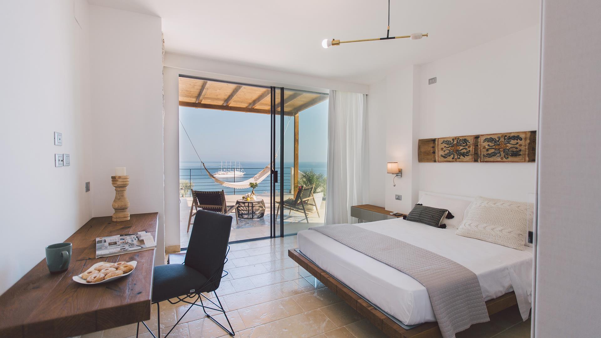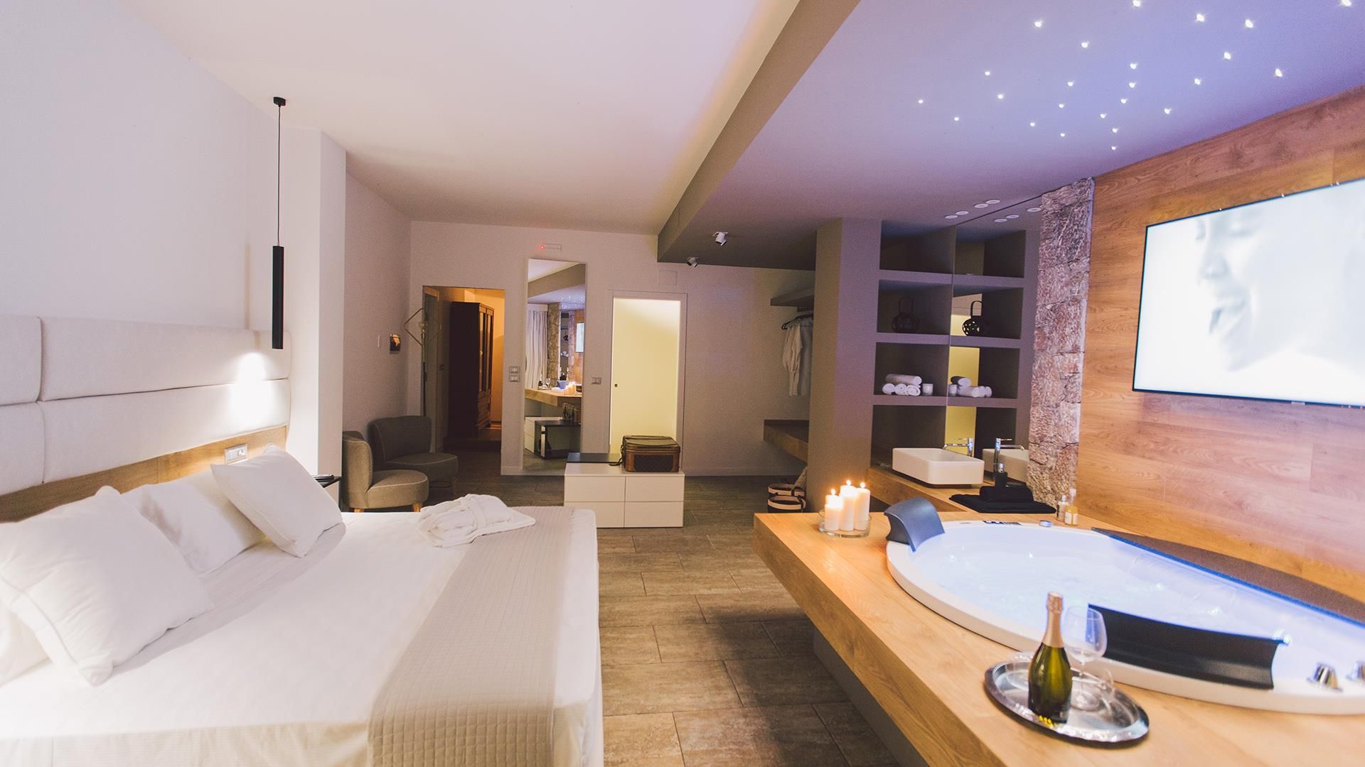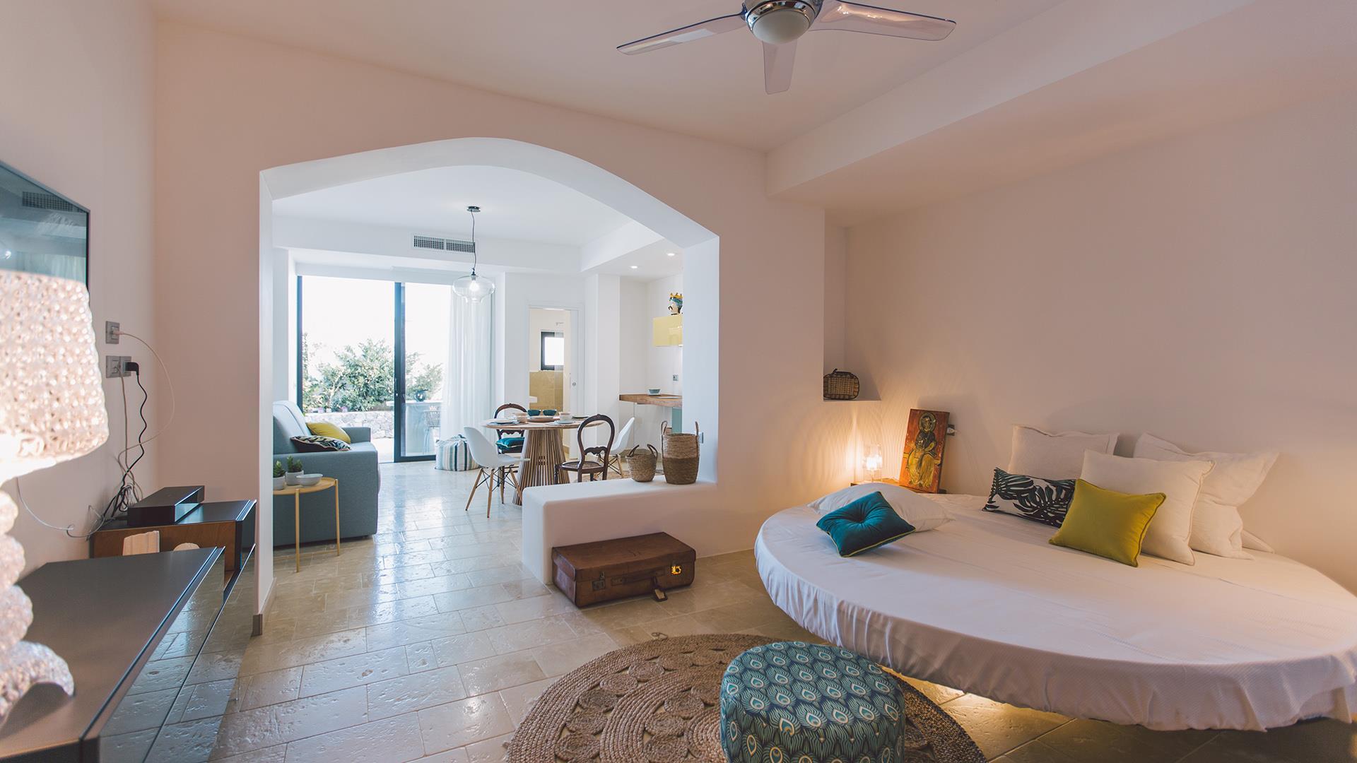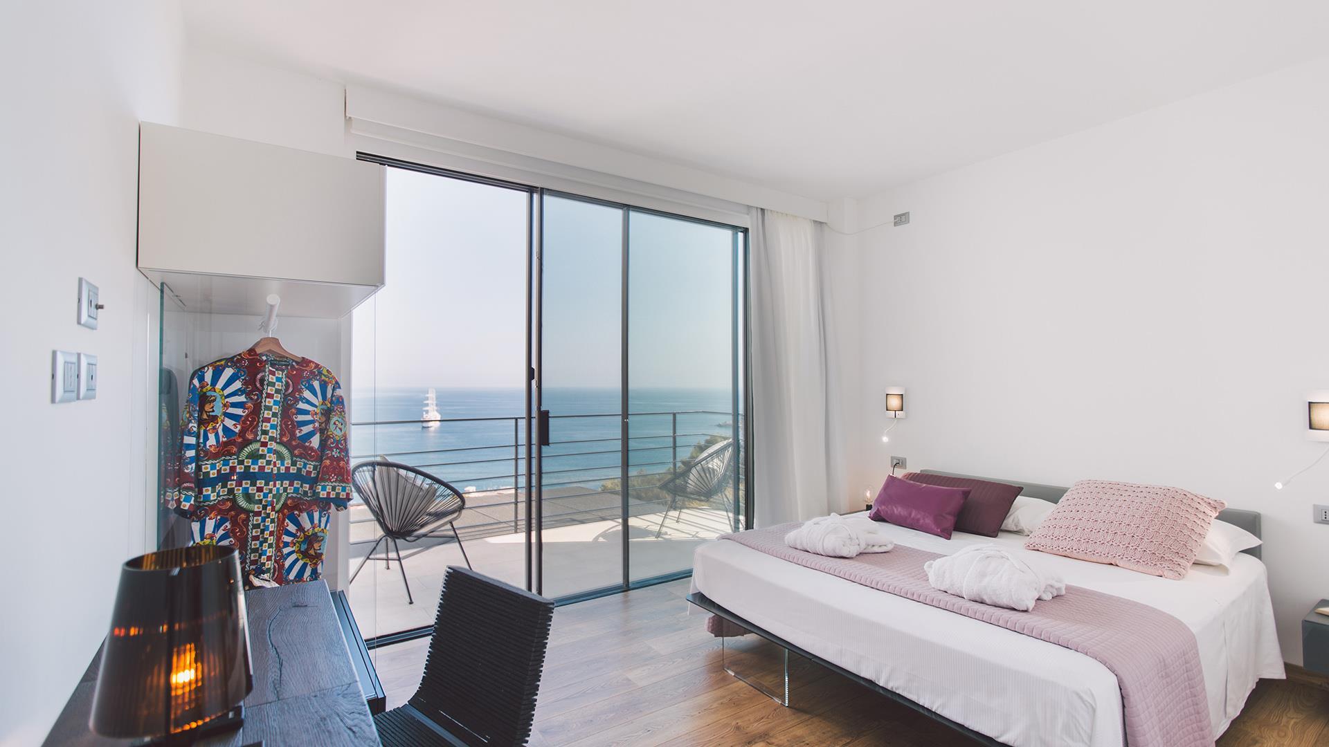 Das Anwesen besteht aus einem Hauptgebäude von ca. 300 qm, das sich auf drei Ebenen verteilt. Der Eingang führt in das Erdgeschoss, wo sich ein großer offener Raum mit einem Wohnzimmer, Esszimmer und Küche befindet. Die Etage wird durch ein Schlafzimmer mit Doppelbett und ein Badezimmer mit Dusche vervollständigt. Wenn man die Treppe vom Erdgeschoss in den ersten Stock hinaufsteigt, befinden sich dort zwei Schlafzimmer mit eigenem Bad mit Dusche und Meerblick. Wenn man die Treppe vom Erdgeschoss in das Untergeschoss hinuntersteigt, befinden sich dort zwei große Suiten mit Bad mit Dusche, von denen eine über eine Whirlpool-Badewanne und die andere über eine kleine Küchenzeile und ein Rundbett verfügt. Die Zimmer im Erdgeschoss und im ersten Stock haben alle Zugang zu Terrassen, während die beiden Zimmer im Untergeschoss auch direkten Zugang zum Poolbereich haben.