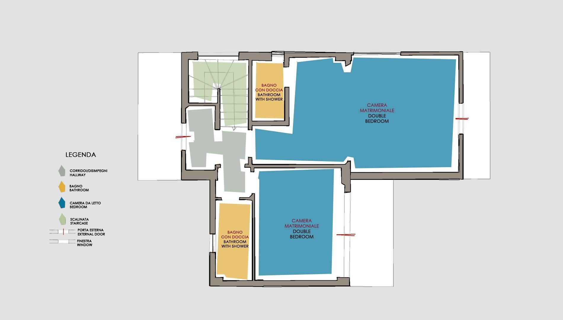 Das Schwimmbad befindet sich auf einer unteren Ebene und ist von der Villa aus über zwei seitliche Treppen erreichbar. Er ist 12 x 6 m groß, hat eine Tiefe von 1,50 bis 2,50 m, ist mit Salz gewaschen, mit PVC ausgekleidet, mit Außen- und Innenbeleuchtung und über eine römische Treppe zu erreichen. Die gepflasterte Sonnenterrasse ist mit Sonnenliegen, Tischen und einer charakteristischen Überdachung ausgestattet. Der Poolbereich wird durch ein Bad mit Dusche vervollständigt.