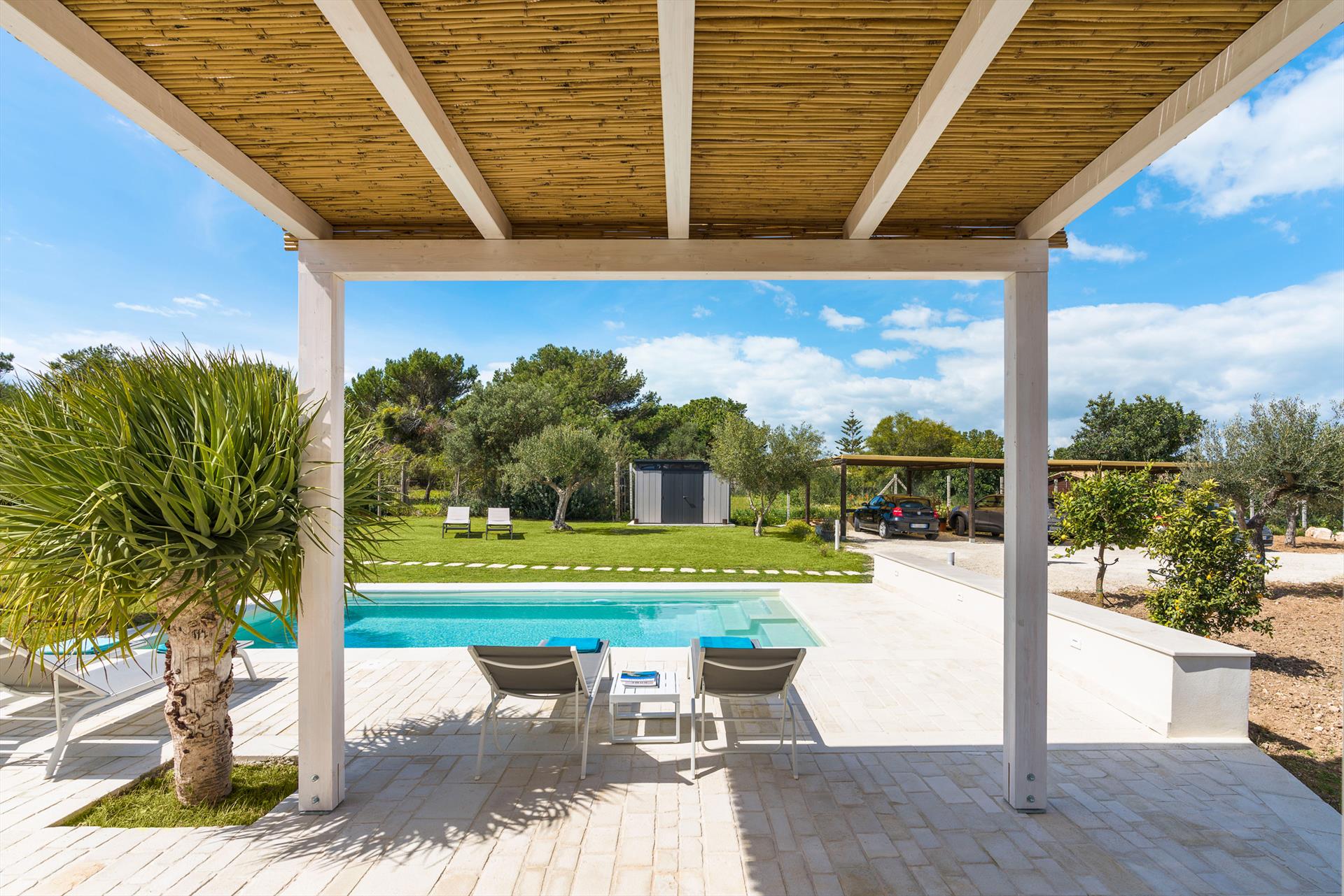 Terrasse mit Pergola (Essbereich, Außenküche und Grill), Innenhof, Garten, Swimmingpool, Sonnenterrasse.