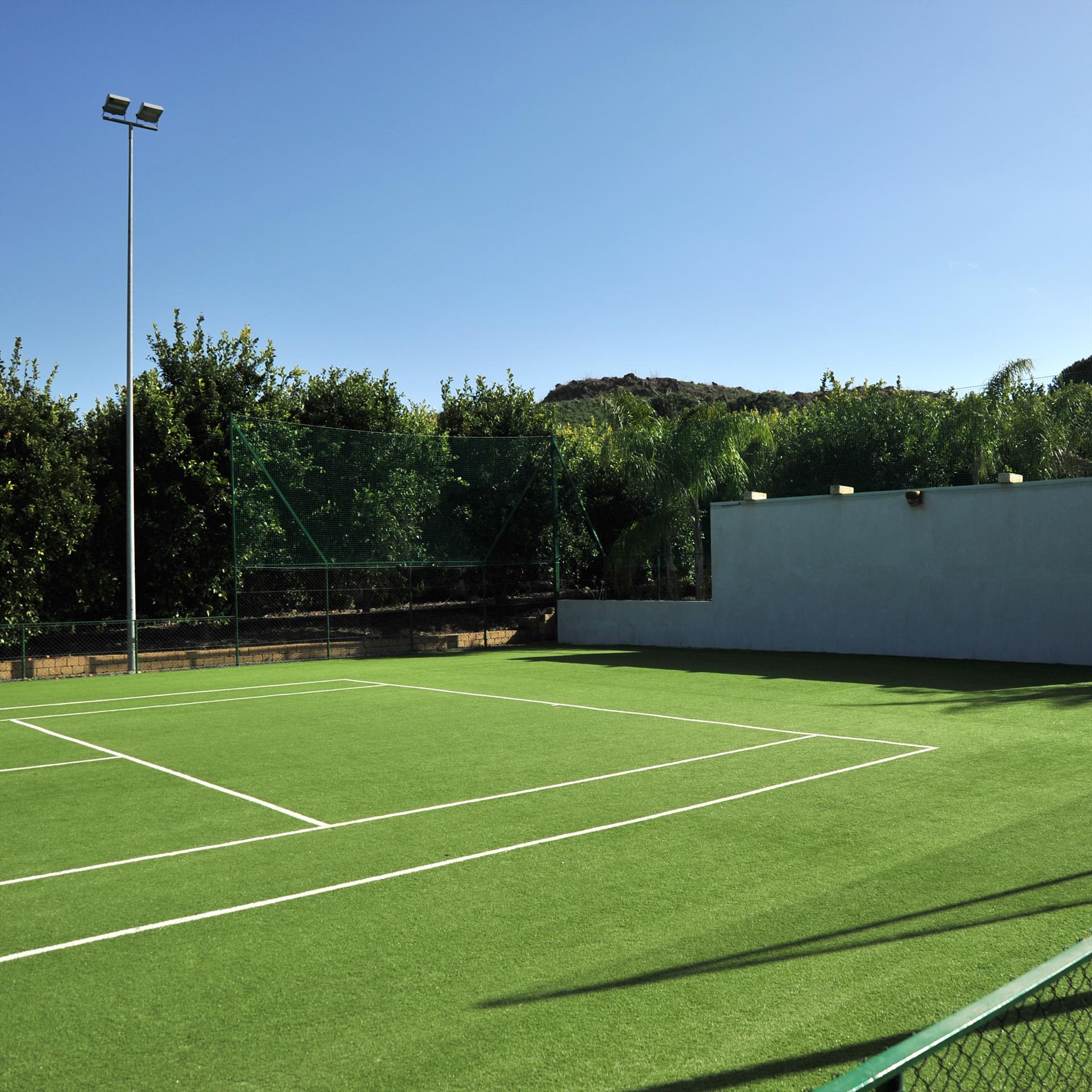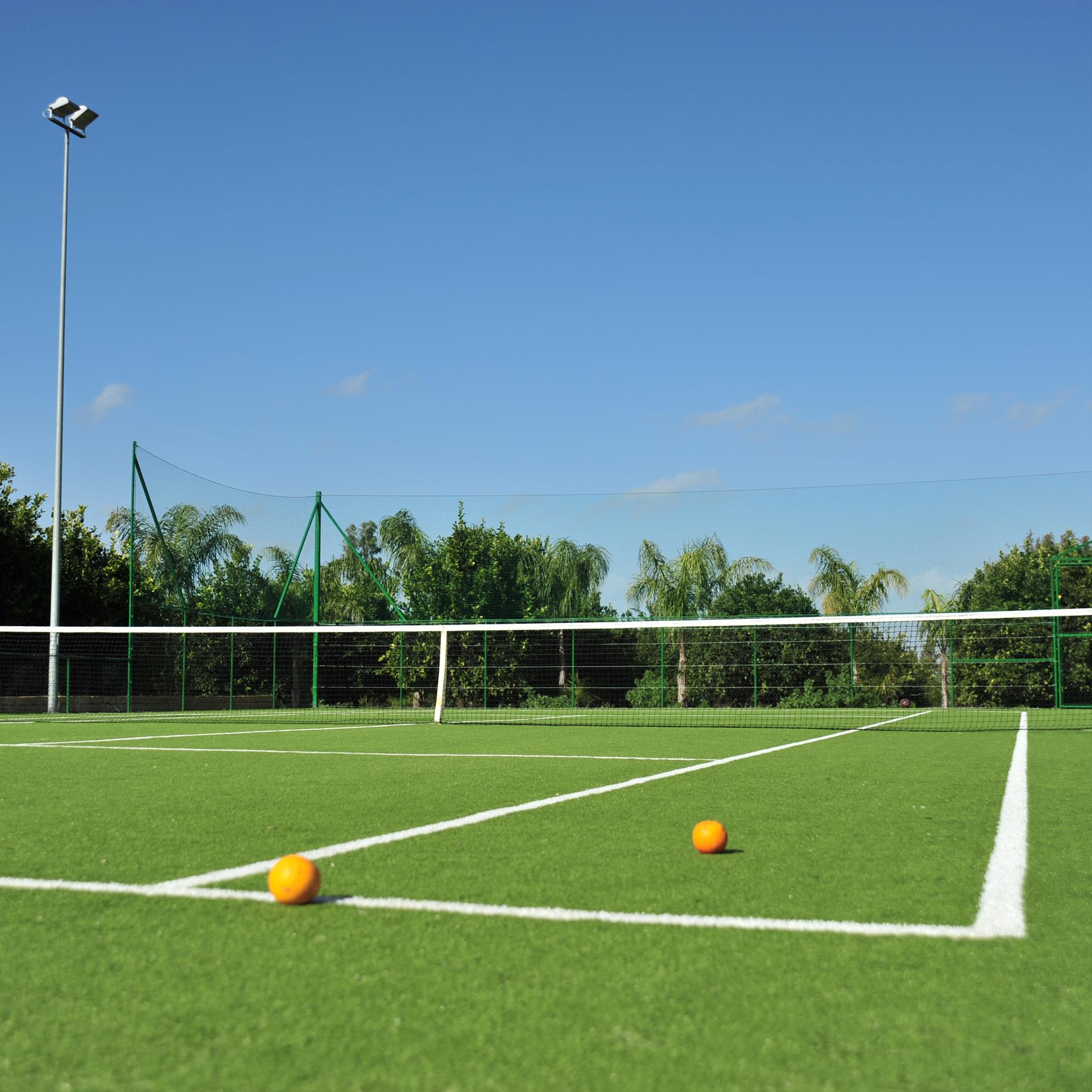 Wer Bewegung sucht, findet auf dem hauseigenen Tennisplatz, eingebettet in Orangenhaine, ideale Bedingungen – mit Kunstrasen-Sand-Belag und Beleuchtung für spontane Abendpartien unter dem Sternenhimmel.
