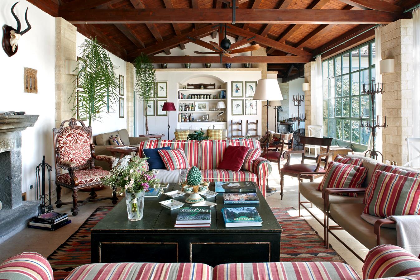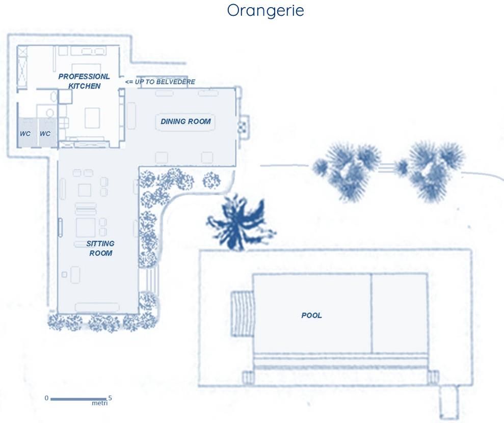 Die Orangerie. Die elegante und großzügige Orangerie bietet einen einladenden Rahmen für Gespräche, zum Lesen oder einfach, um den Blick durch die weitläufigen Fenster auf die Gärten zu genießen. Angrenzend befindet sich das Speisezimmer – ein intimer, zugleich vielseitiger Raum, der bis zu sechzig Gäste zu privaten Feierlichkeiten oder besonderen Anlässen aufnehmen kann. Geschmückt mit Biedermeier-Antiquitäten, Familienporträts, einer charmanten Sammlung alter Papageien-Stiche und sizilianischem Porzellan, wird jedes Mahl in der Orangerie zu einem unvergesslichen Erlebnis.