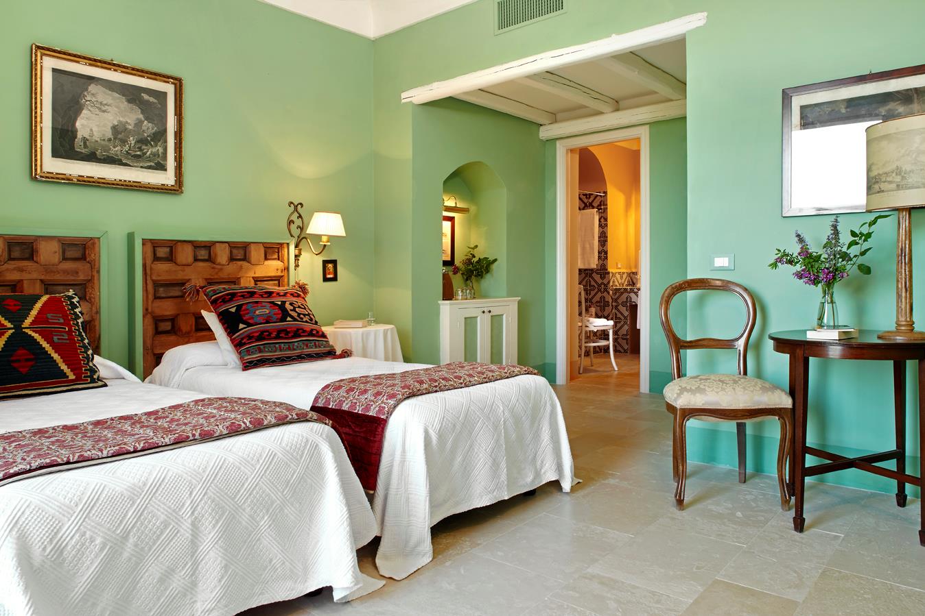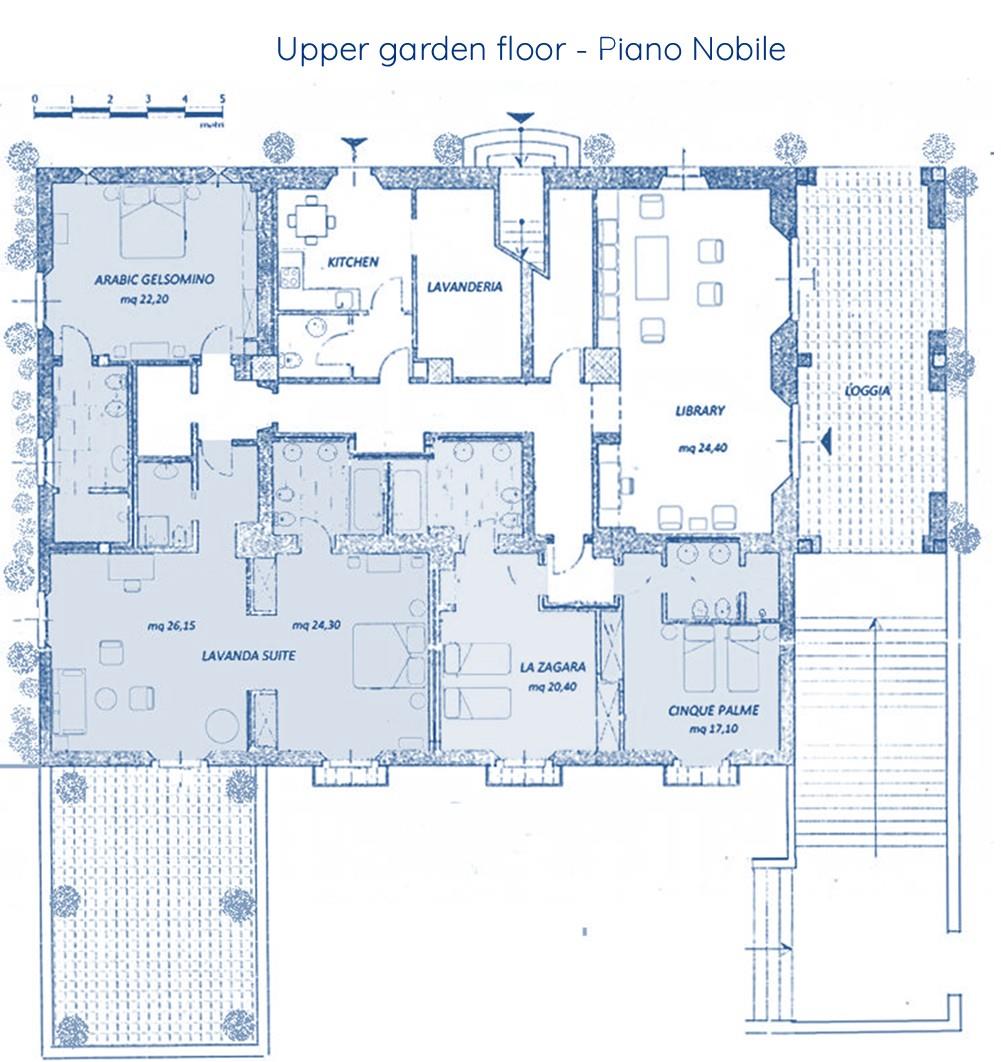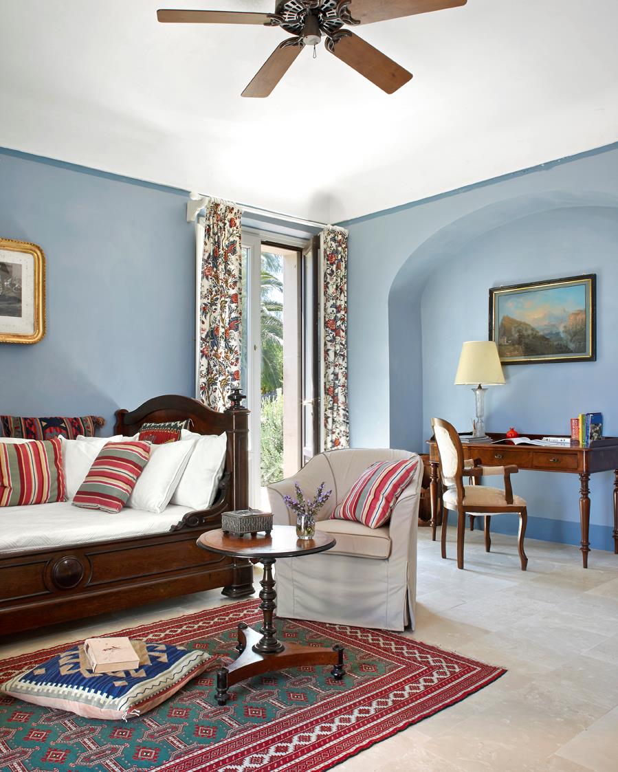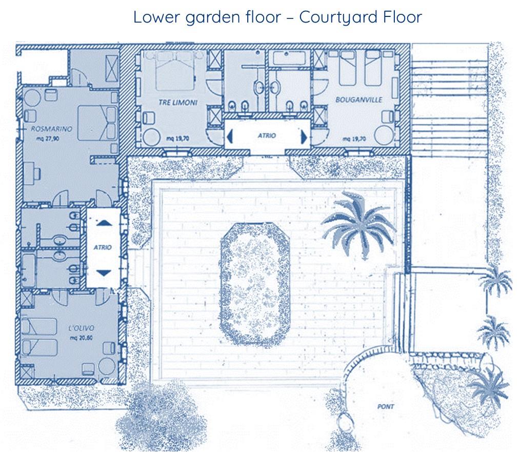 Im Herrenhaus erwarten acht exklusive Gästezimmer anspruchsvolle Besucher. Vier befinden sich auf der oberen Gartenebene, die übrigen öffnen sich direkt zur unteren Gartenterrasse. Jedes Zimmer ist mit erlesenen Antiquitäten und kunstvollen Vintage-Einrichtungsstücken ausgestattet und bietet entweder einen privaten Balkon oder direkten Zugang zu den ruhigen Gärten der Villa.