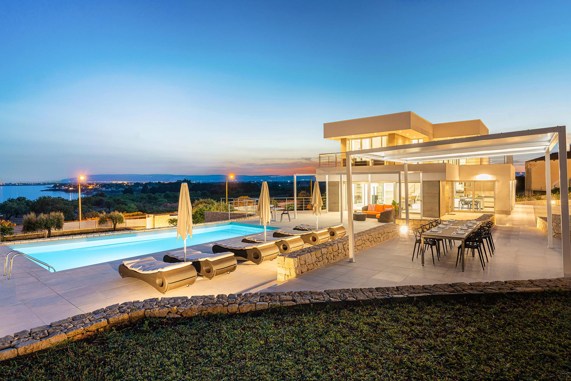 Villa Pillirina: Luxuriöse Residenz im Herzen von Plemmirio. Die Villa Pillirina ist eine luxuriöse Residenz mit Swimmingpool, die im Herzen des Meeresschutzgebiets Plemmirio, nur wenige Kilometer vom historischen Zentrum von Syrakus entfernt, liegt. Von ihrer erhöhten Panoramalage aus bietet das Anwesen einen herrlichen Meerblick, den Sie entspannt vom beheizten Pool mit seiner Sonnenterrasse, den möblierten Terrassen und dem Garten genießen können.