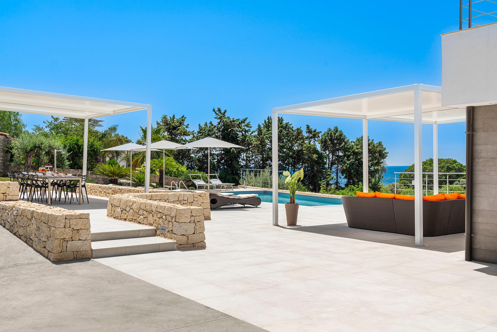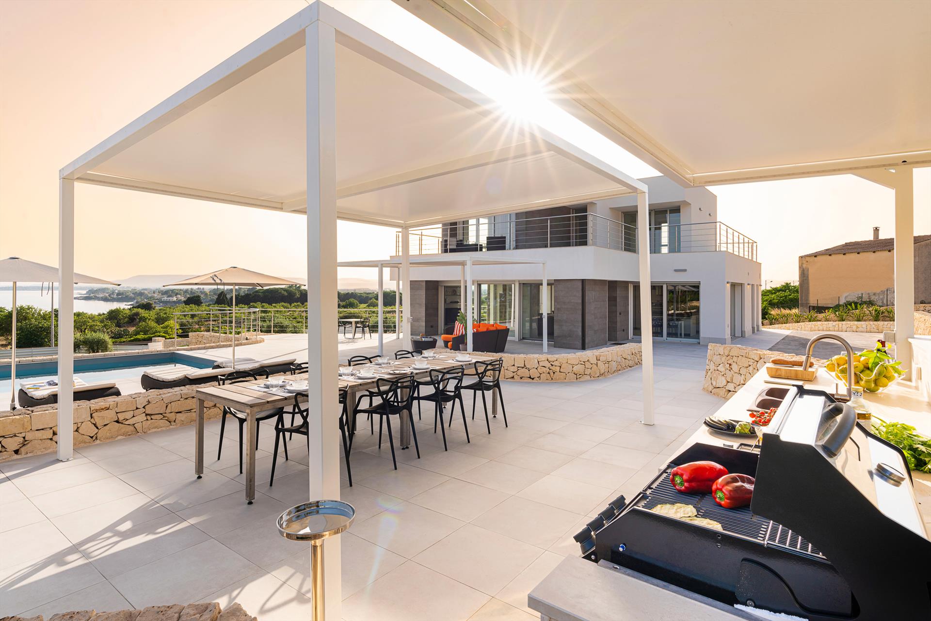 Terrassen, Außenküche, Essbereich, Garten, Swimmingpool, Sonnenterrasse.