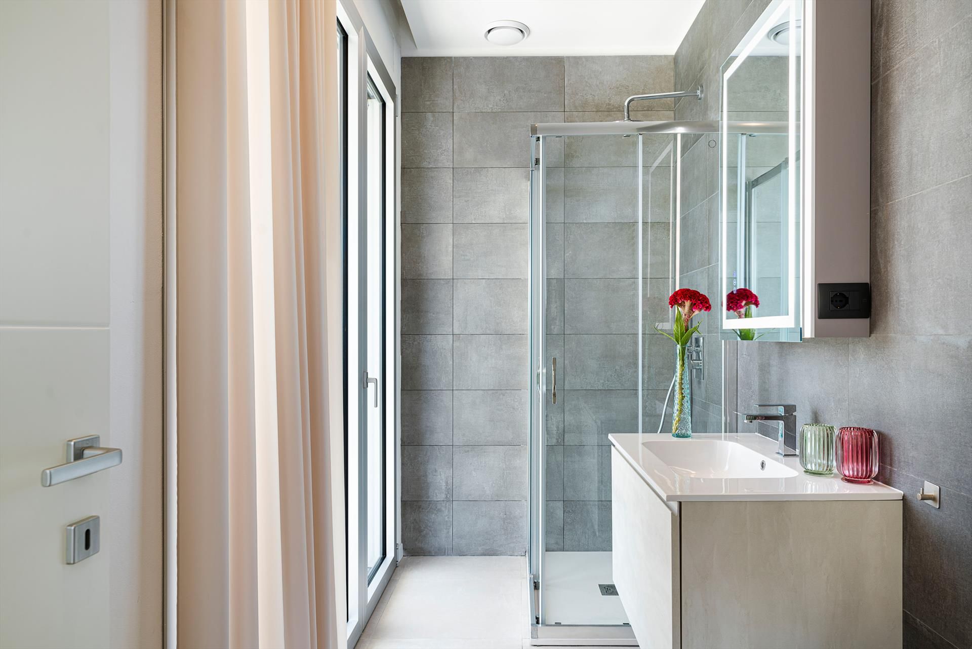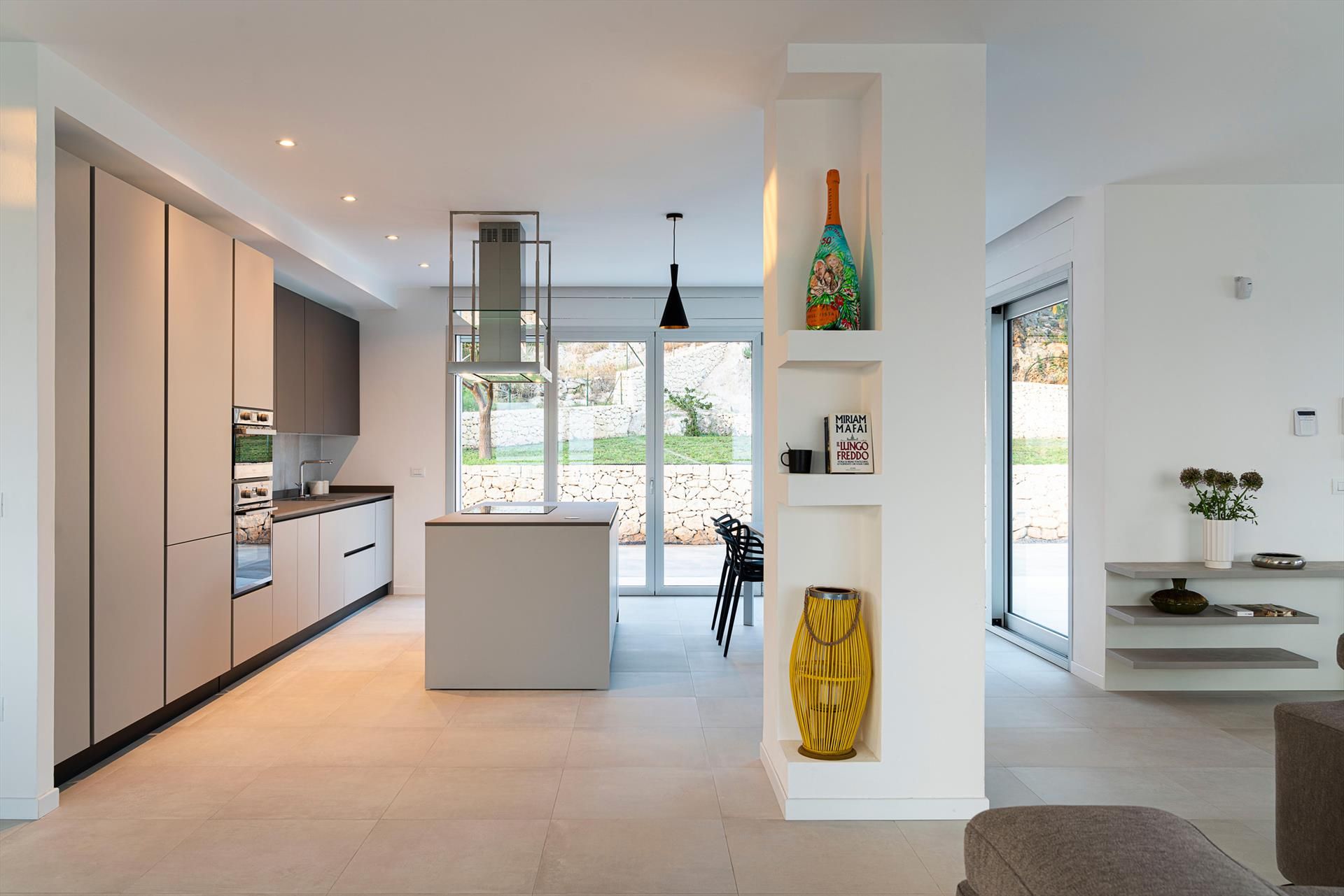 Die 2022 neu erbaute, moderne Villa erstreckt sich über großzügige 400 Quadratmeter, aufgeteilt in eine Hauptvilla und zwei einladende Nebengebäude. Im Haupthaus befindet sich auf Pool-Ebene der Wohnbereich mit einem großen Wohnzimmer samt TV, einem Esszimmer, einer Küche und einem Badezimmer. Der erste Stock umfasst das Hauptschlafzimmer mit eigenem Bad, ein Doppelschlafzimmer, ein Einzelschlafzimmer und ein weiteres Badezimmer. Das Erdgeschoss der Villa, das über einen separaten Zugang von außen erreichbar ist, verfügt über einen Wohnbereich mit Esszimmer und Küche, ein Doppelschlafzimmer und ein Badezimmer. Die beiden Nebengebäude beherbergen das fünfte und sechste Schlafzimmer, jeweils mit Patio, Minikühlschrank und eigenem Badezimmer.