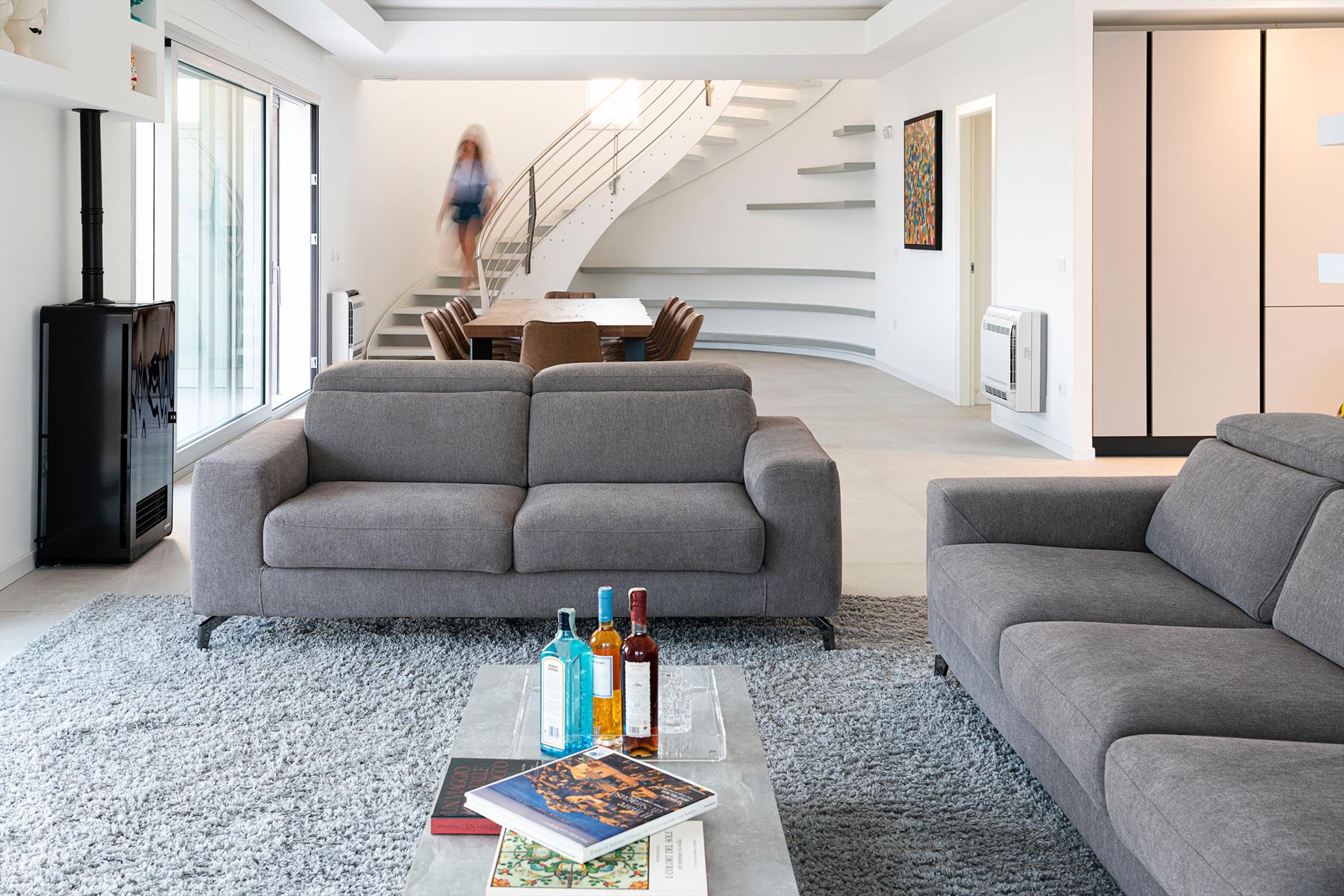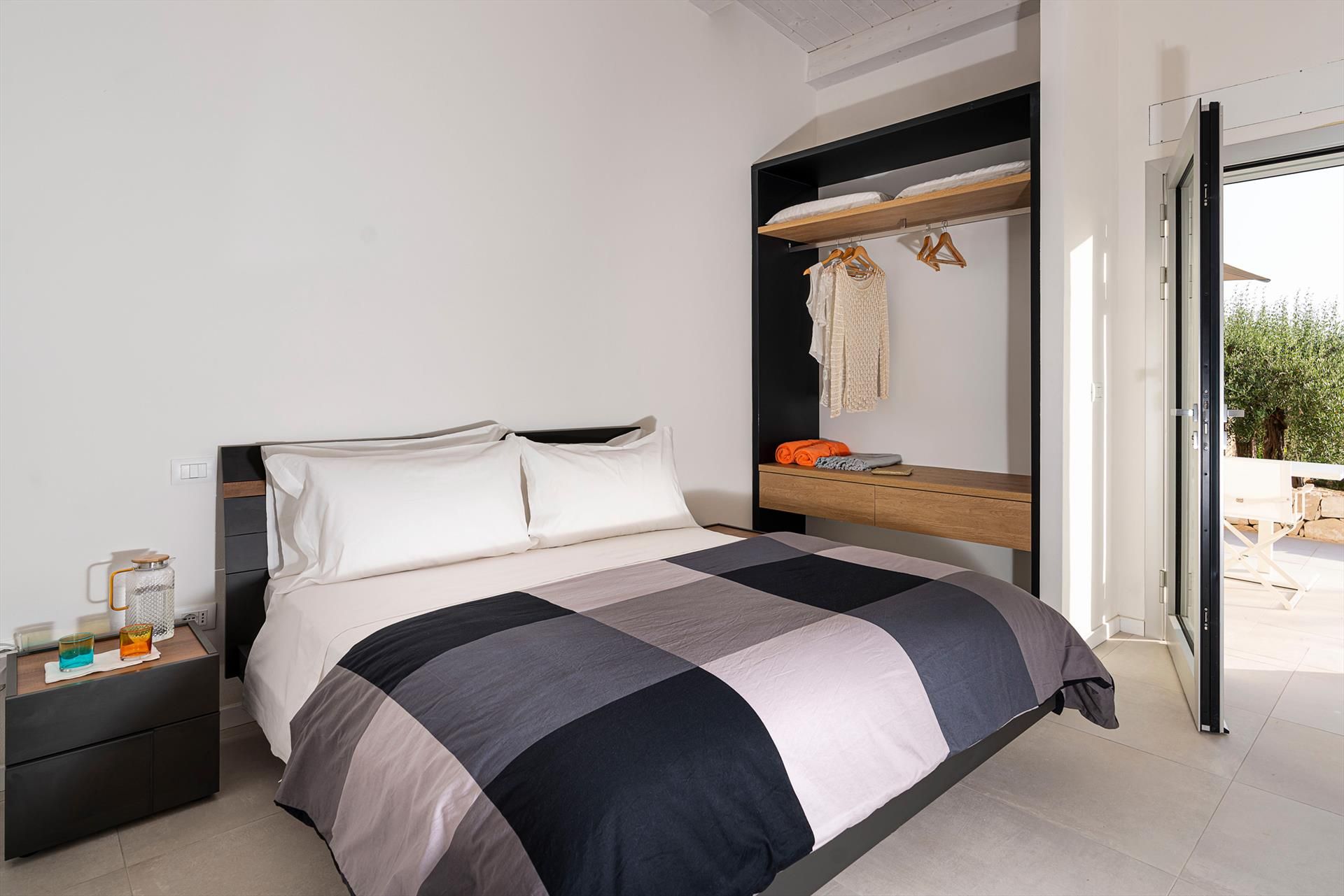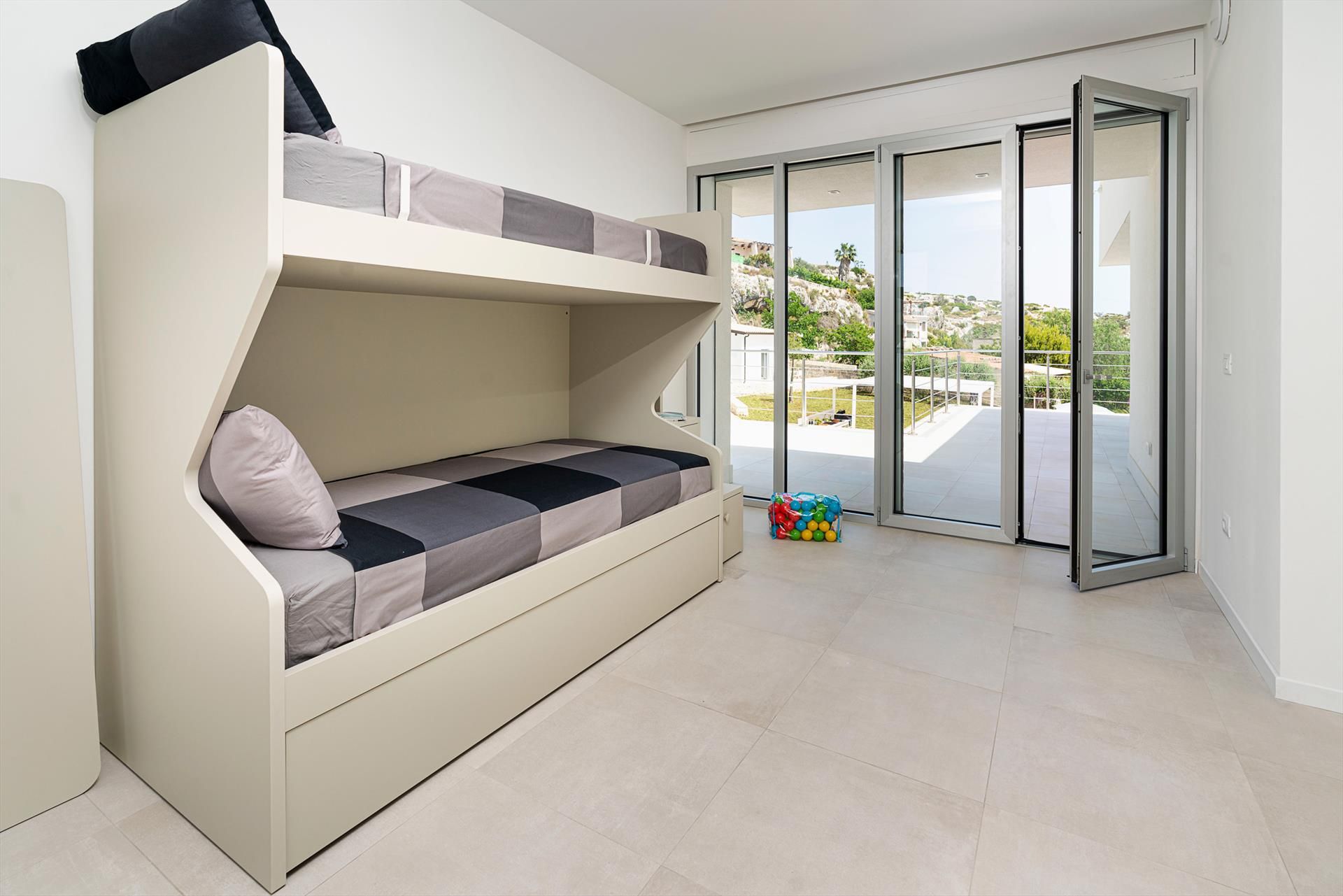 Erdgeschoss (Zugang von außen): Wohn-Esszimmer mit Schlafsofa, Küchenzeile, 1 Doppelzimmer, 1 Bad mit Dusche, Patio. 1.Obergeschoss: großzügiger Wohnbereich mit Wohnzimmer, Esszimmer und Küche, 1 Bad mit Dusche, Ankleideraum, Waschküche. 2.Obergeschoss: 1 Doppelzimmer (King-Size-Bett) mit Bad mit Dusche, 1 Doppelzimmer, 1 Zweibettzimmer (Etagenbett), 1 Bad mit Dusche, große Terrasse. NEBENHAUS 1: 1 Doppelzimmer (King-Size-Bett und Minibar), 1 Bad mit Dusche, Patio. NEBENHAUS 2: 1 Doppelzimmer (King-Size-Bett und Minibar), 1 Bad mit Dusche, Patio.