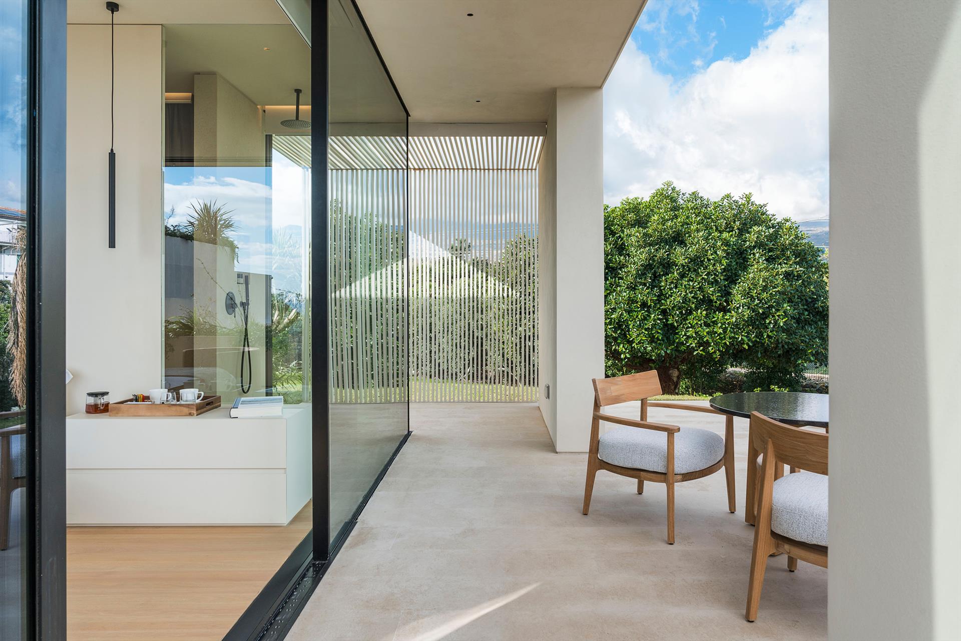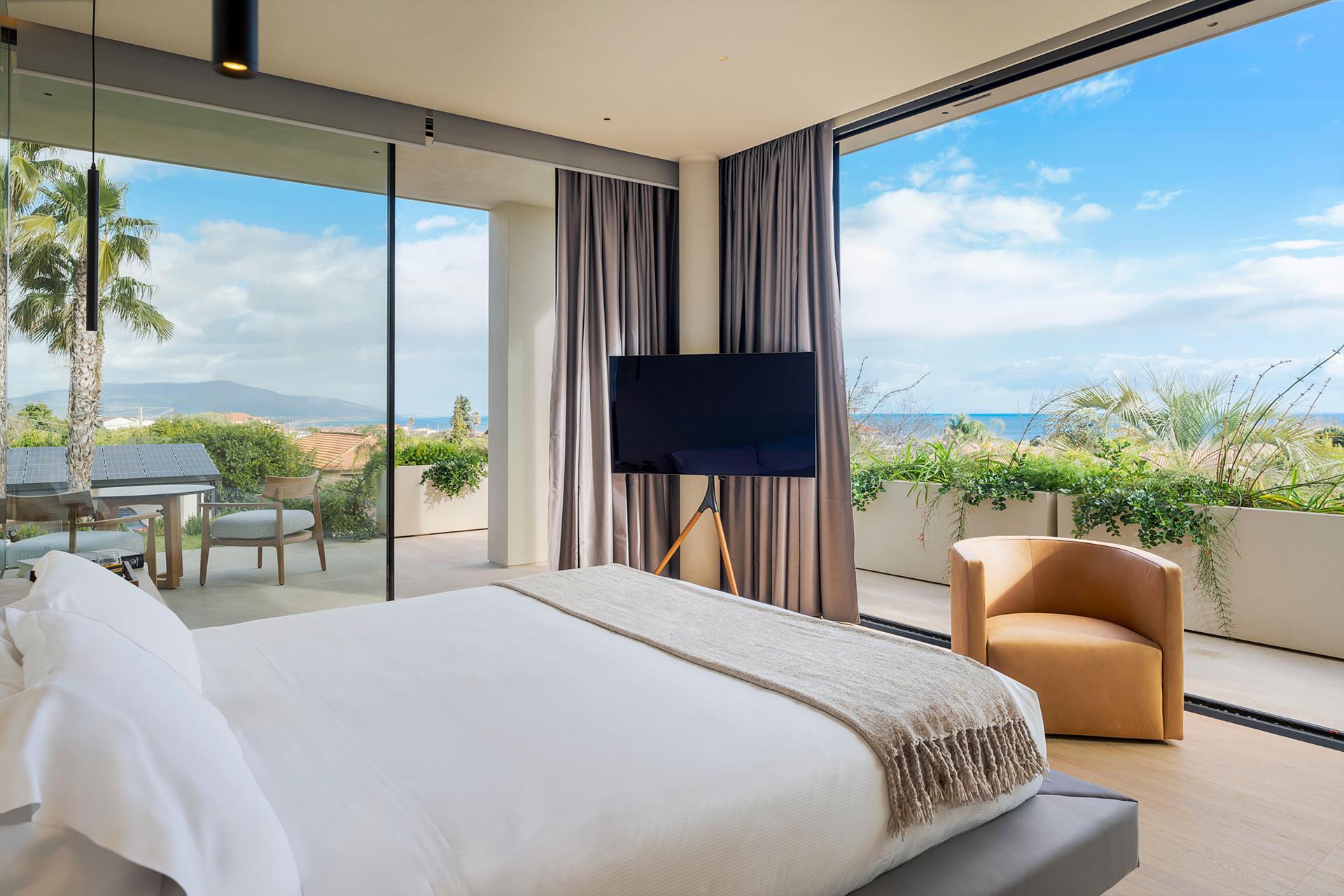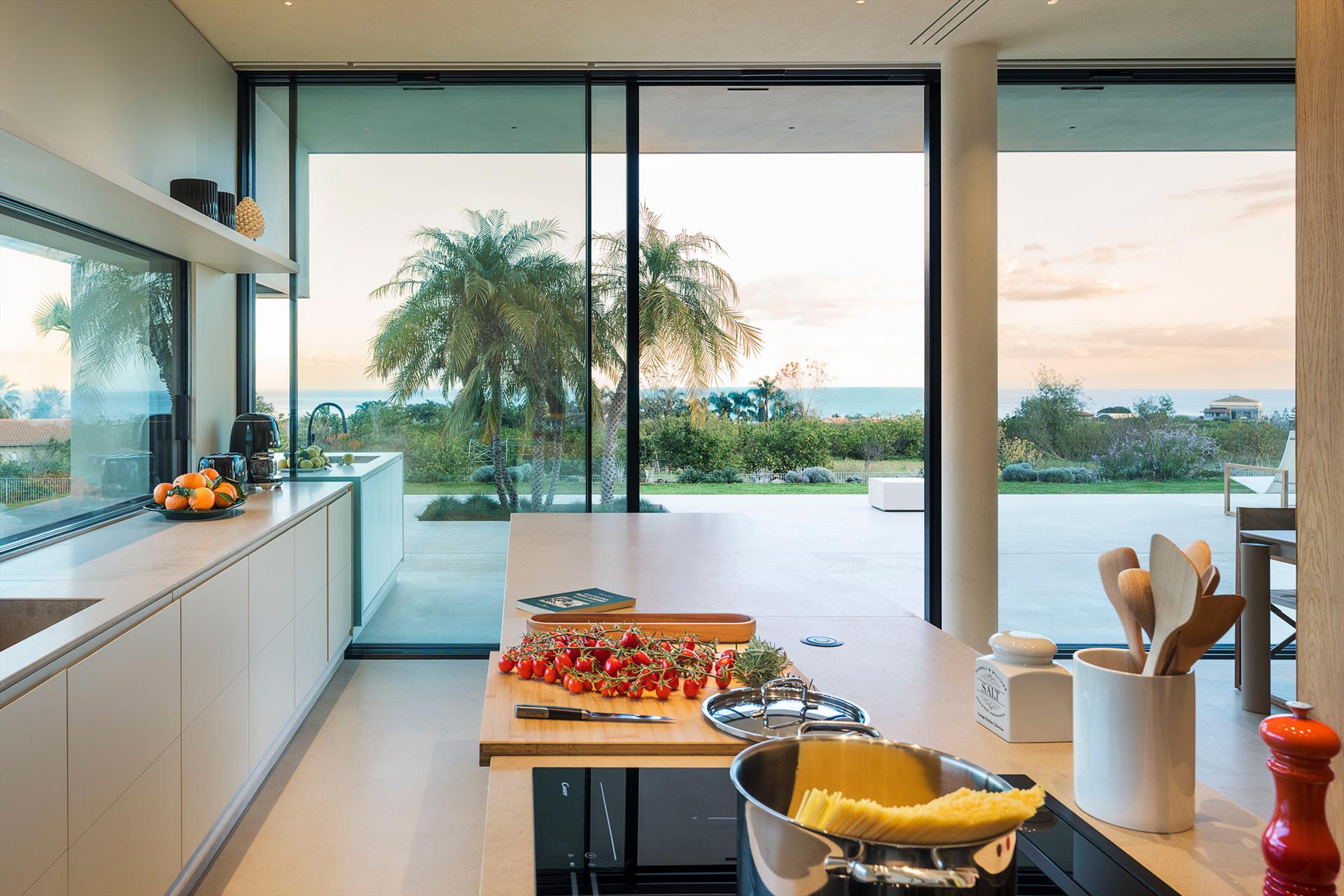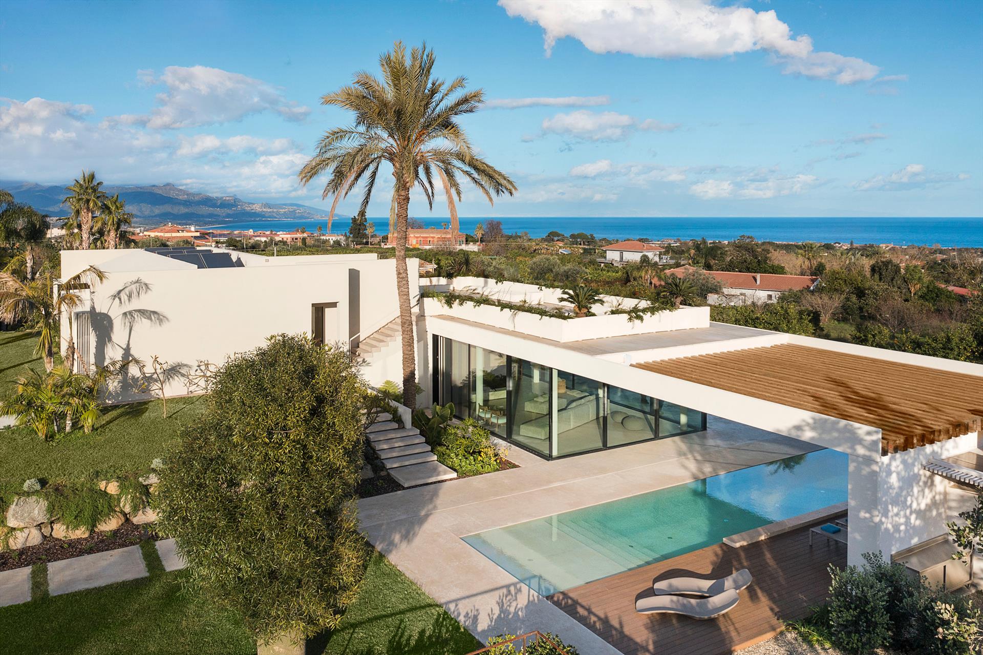 Eine luxuriöse Villa mit Swimmingpool und Wellnessbereich in ruhiger und sonniger Lage nahe Taormina. Umgeben von einem bezaubernden mediterranen Garten, bietet diese exklusive Villa einen atemberaubenden Infinity-Pool und große, gut ausgestattete Terrassen mit Blick auf die Landschaft und das Meer, wo sich der Blick bis nach Taormina und zum Ätna erstreckt. Sharbat ist eine moderne Villa, die unter voller Berücksichtigung der Umwelt mit umweltfreundlichen technologischen und baulichen Lösungen konzipiert und gebaut wurde, darunter Solarthermie- und Photovoltaikanlagen, Fußbodenheizung-Kühlsystem und Aluminiumrahmen mit Wärmebrücke. Perfekt für erholsame Ferien mit viel Platz, Luxus und Komfort, zeichnet sich die Villa Sharbat durch ihr raffiniertes, zeitgenössisches Design aus. Die Innenräume erstrecken sich über drei Ebenen, die durch eine komfortable Innentreppe verbunden sind. Im Erdgeschoss befinden sich eine super ausgestattete Küche und der große Wohnbereich, der sich durch große, bodentiefe Fenster zu den Terrassen, dem Garten und dem Swimmingpool öffnet. Im ersten Stock befindet sich der Schlafbereich mit drei Schlafzimmern, alle mit Terrasse und Bad mit Dusche. Im Untergeschoss befindet sich das vierte Schlafzimmer, ebenfalls mit eigenem Bad-Dusche, und der exklusive Wellnessbereich mit großem Whirlpool, Sauna, Türkischem Bad, Erlebnisdusche und Fitnessbereich. Die voll klimatisierte Villa ist mit bestem Komfort ausgestattet: WLAN, Smart-TV, Waschmaschine, Wäschetrockner, Geschirrspüler, Elektroofen und Mikrowelle, Espresso- und amerikanische Kaffeemaschine, Weinkeller, Eiswürfelmaschine, Grillbereich und privater Parkplatz. Sharbat ist aber auch ein idealer Ausgangspunkt, um in wenigen Autominuten den schönen Strand von Fondachello, Taormina, den Ätna und Catania zu erreichen. Weiter südlich befinden sich Syrakus, Vendicari und die stimmungsvollen Barockstädte des Val di Noto.