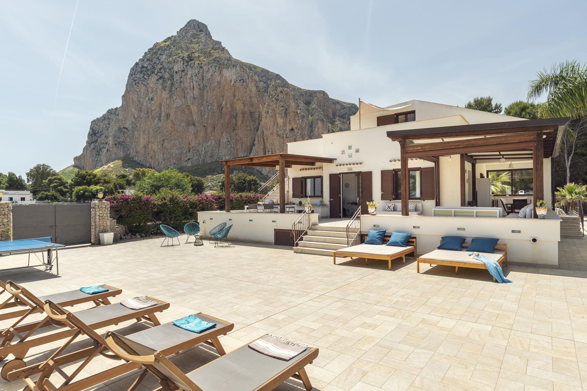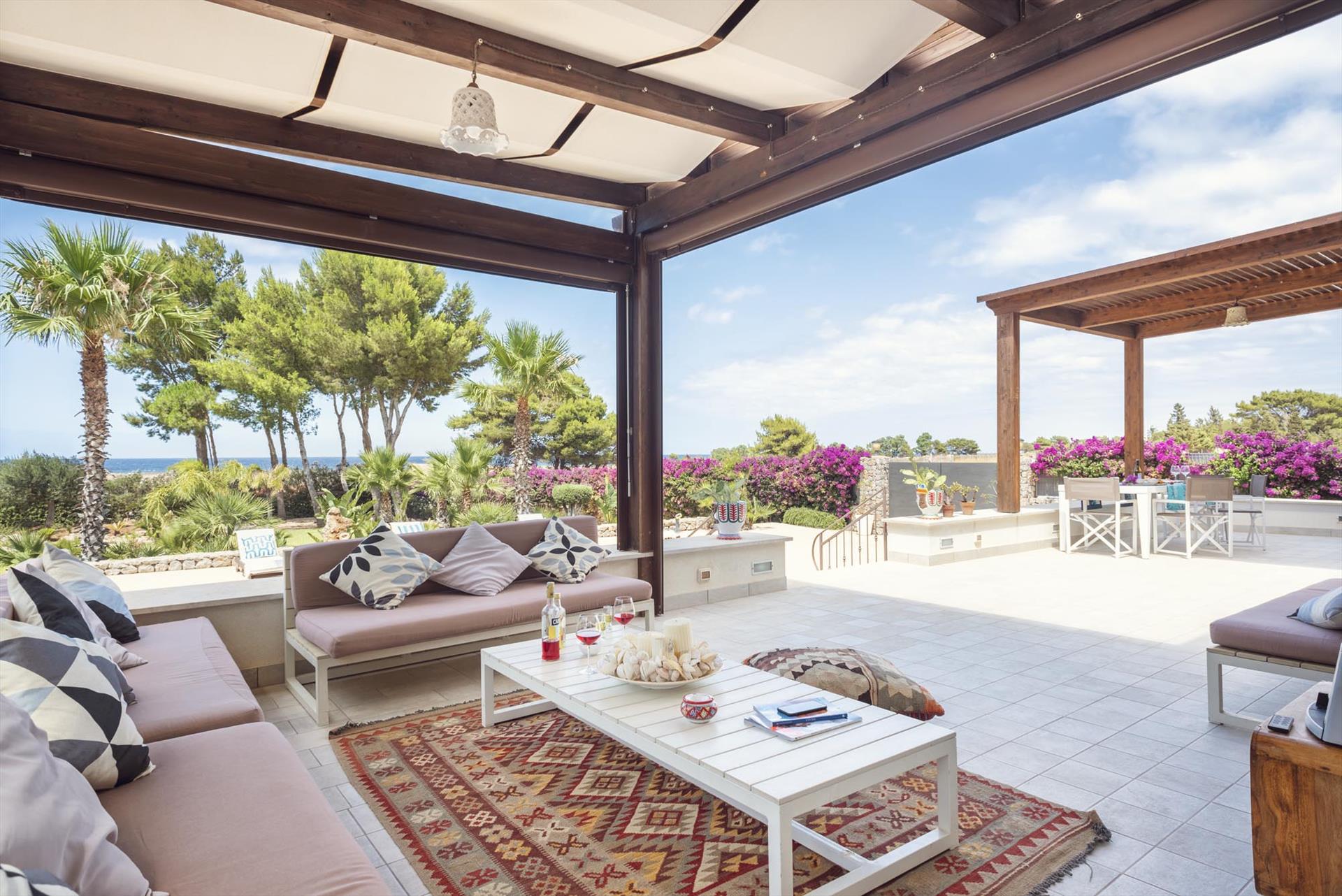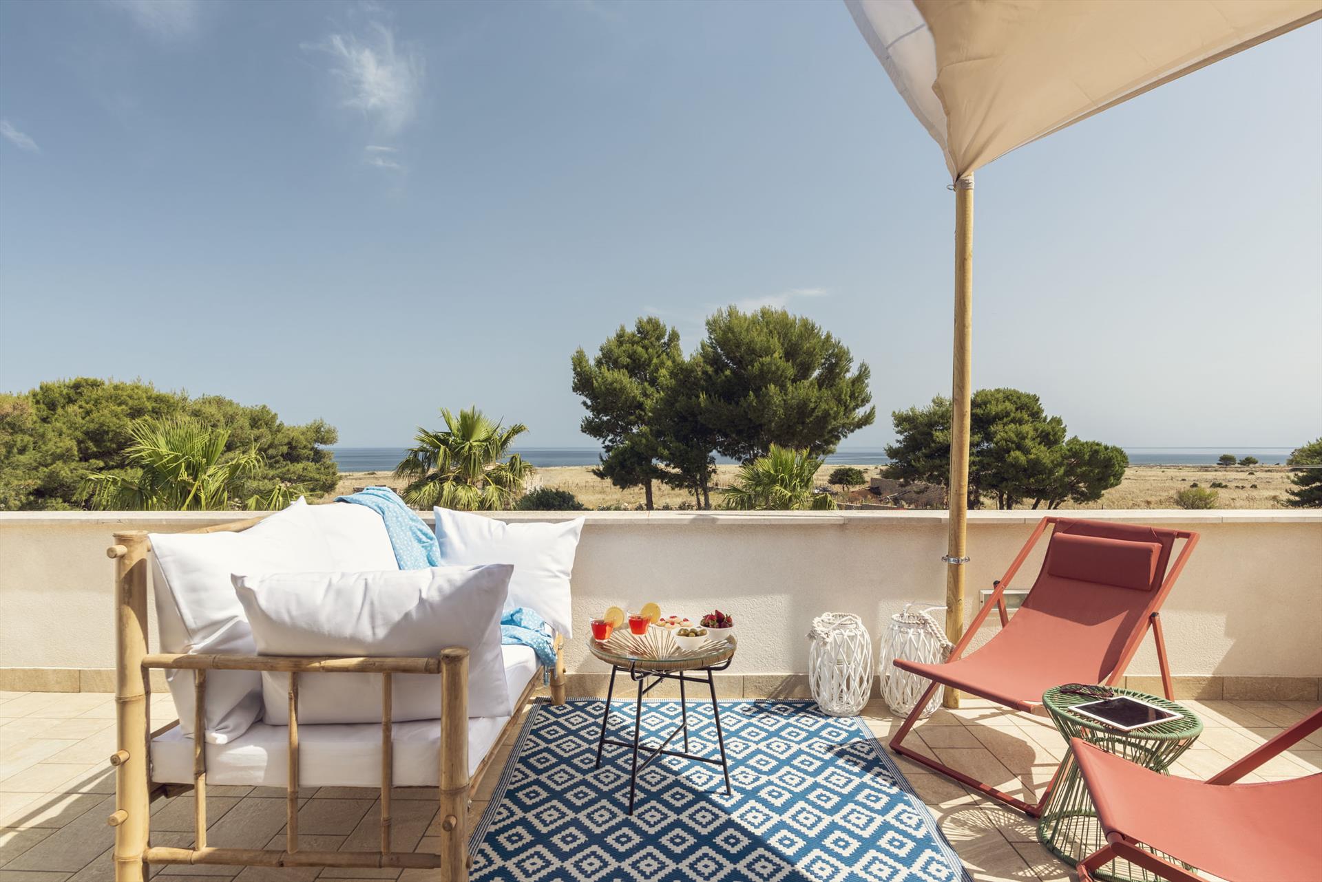 Von den Terrassen geniessen Sie einen fantastischen Meerblick und Blick auf den wichtigsten Berg San Vito lo Capo. Die untere Terrasse ist mit Sonnenschirmen ausgestattet, die obere Terrasse ist teilweise überdacht. Beide sind mit bequemen, ansprechenden Loungemöbeln ausgestattet. Im überdachten Terrassenbereich befindet sich ein grosser Esstisch und eine komfortable Aussenküche.