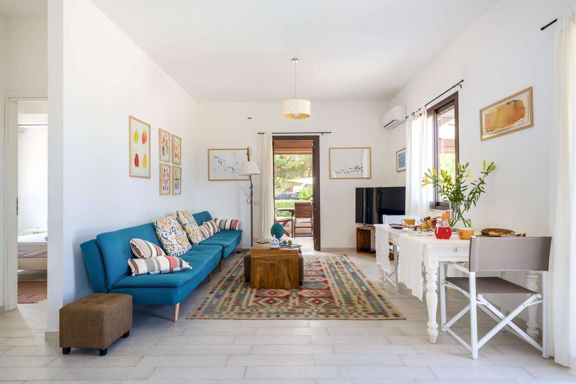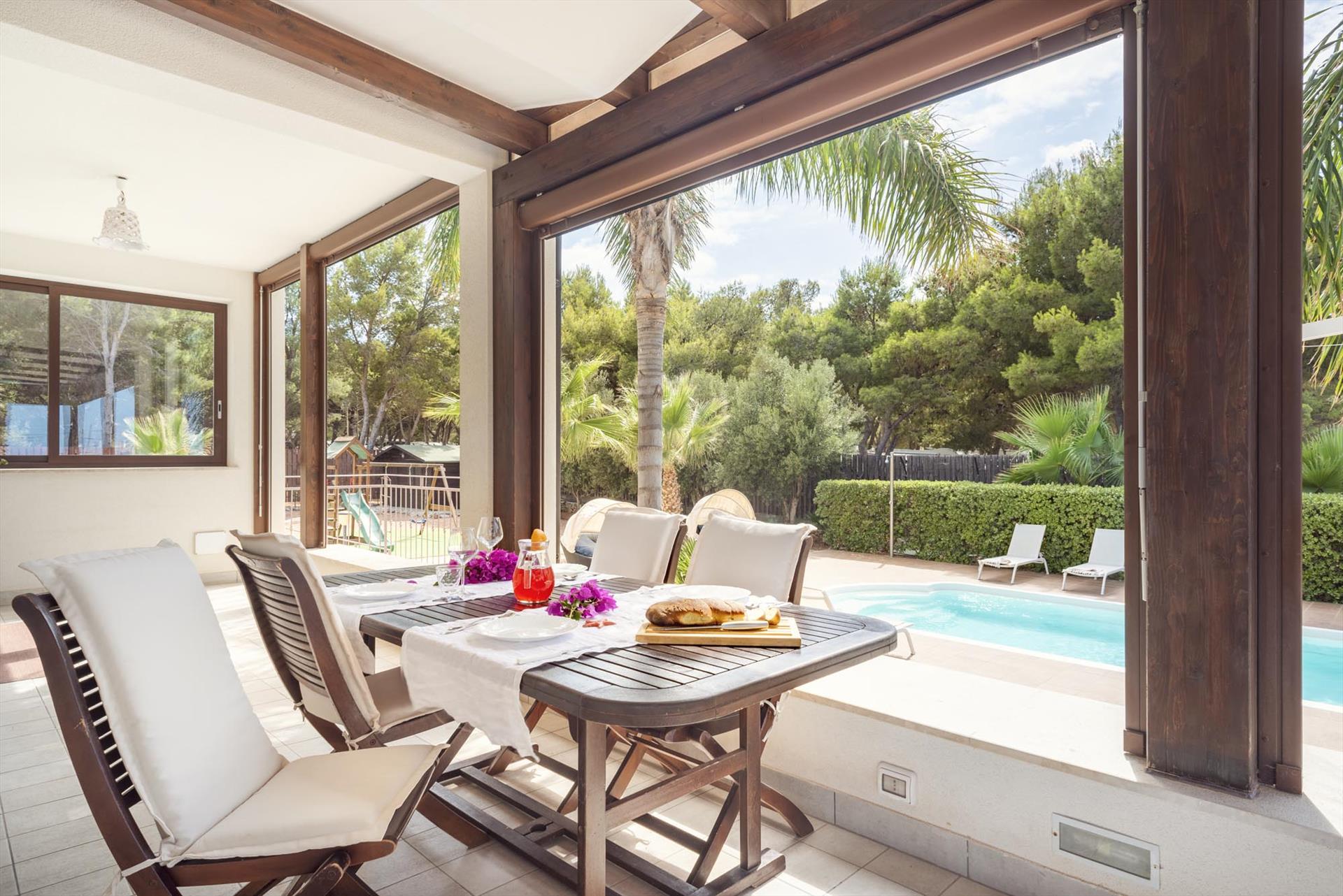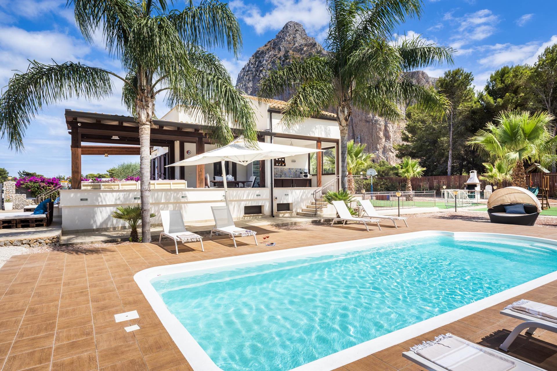 Villa Aronica ist die einzige private Villa mit Swimmingpool in San Vito Lo Capo, die zu Fuß vom Dorf aus zu erreichen ist. Die Villa ist geschmackvoll eingerichtet und befindet sich in einer besonders günstigen Lage am Rande von San Vito Lo Capo.Vom Eingangstor führt ein Weg durch den hübschen Garten mit Pinien, Palmen, Olivenbäumen und Sträuchern aller Art zu den Sonnenterrassen, dem Poolbereich und dem Eingang zur Villa.