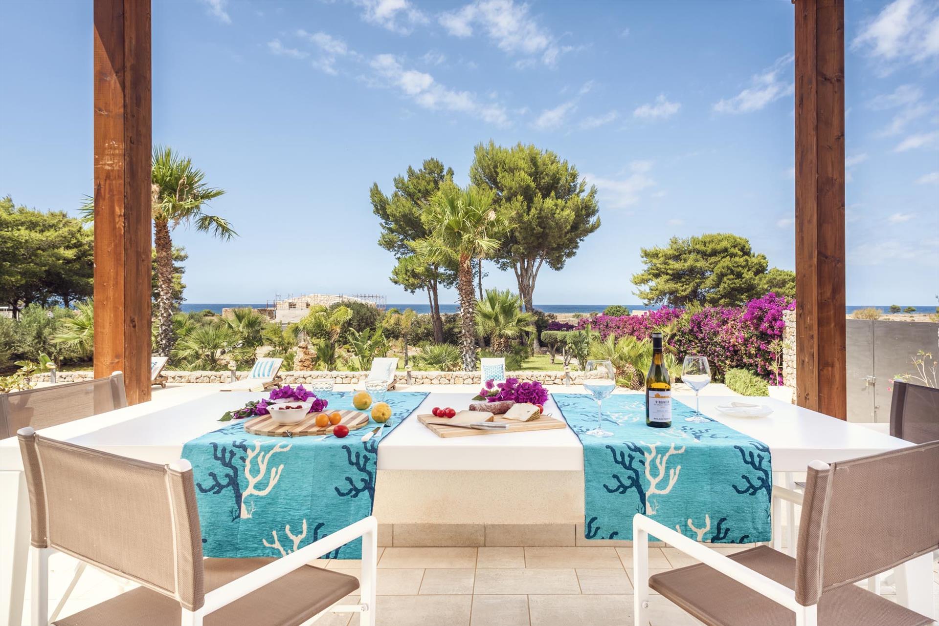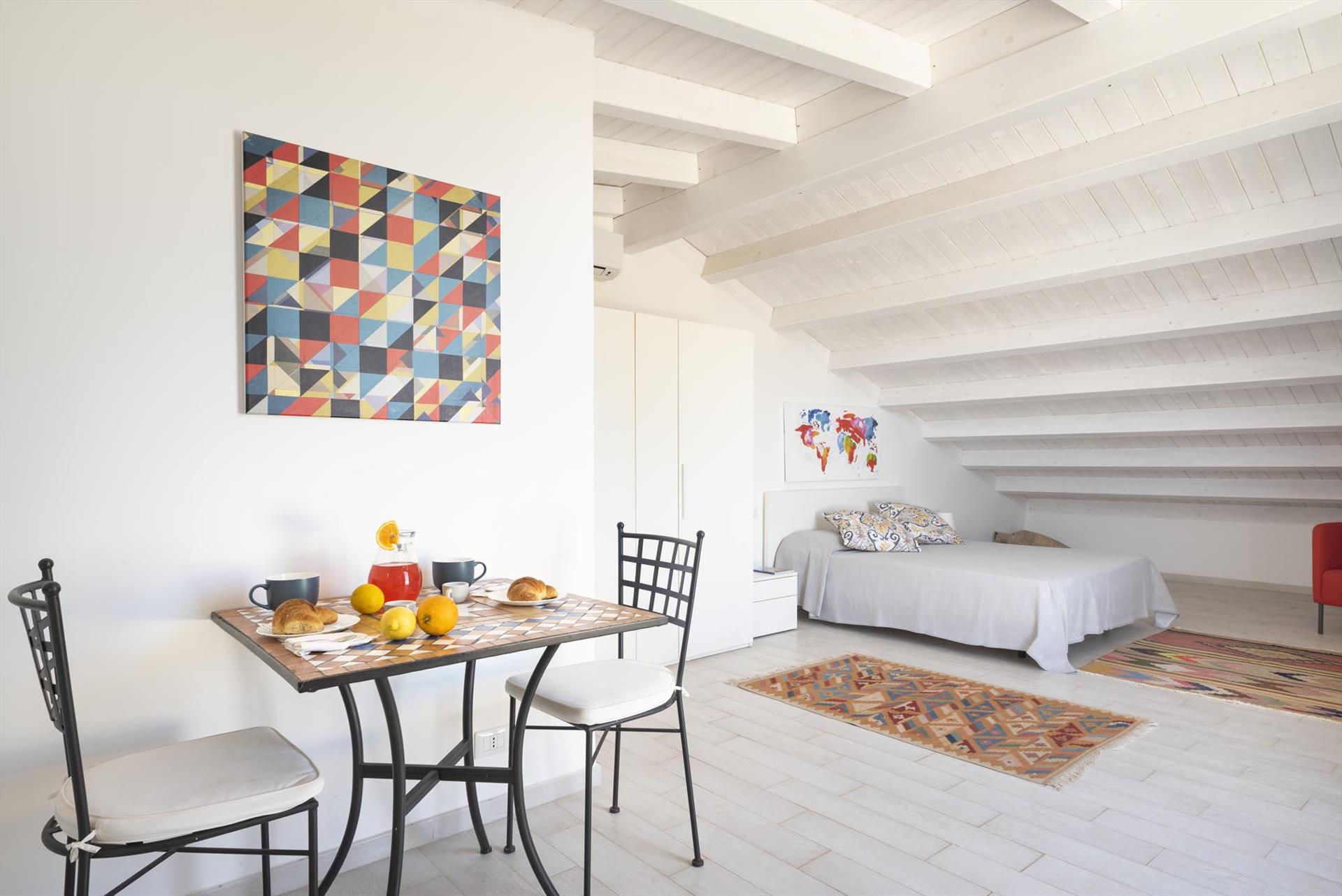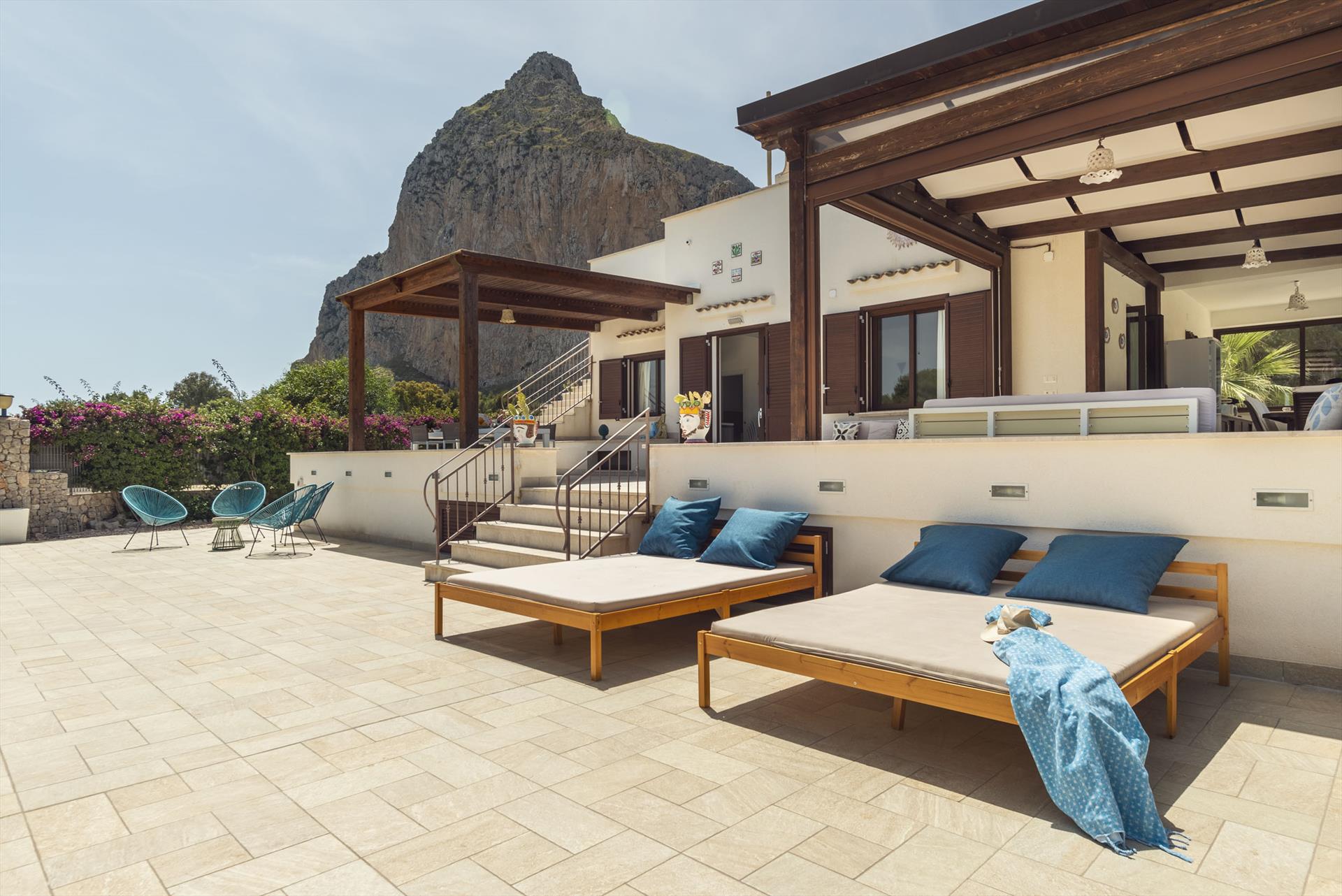 Von den Terrassen geniessen Sie einen fantastischen Meerblick und Blick auf den wichtigsten Berg San Vito lo Capo. Die untere Terrasse ist mit Sonnenschirmen ausgestattet, die obere Terrasse ist teilweise überdacht. Beide sind mit bequemen, ansprechenden Loungemöbeln ausgestattet. Im überdachten Terrassenbereich befindet sich ein grosser Esstisch und eine komfortable Aussenküche.