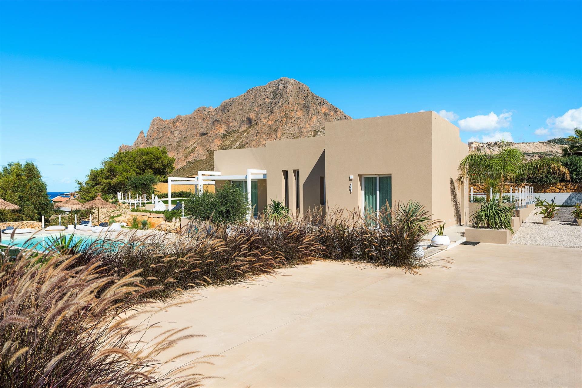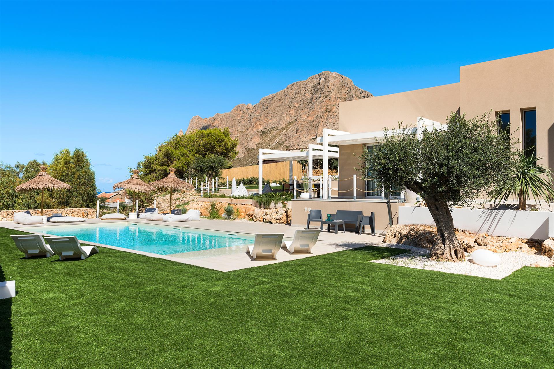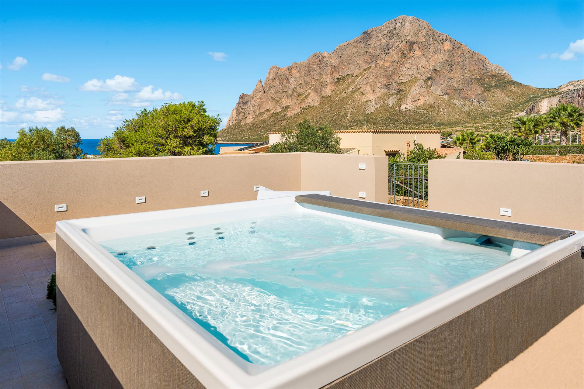 Die exklusive Residenz liegt an einer der Straßen, die von Custonaci zum Meer führen, und ist von einem weitläufigen, gepflegten Garten mit einem umweltfreundlichen Rasen umgeben. Der Garten verfügt über einen schönen Swimmingpool mit Sonnenbereich, einen Whirlpool und Panoramaterrassen, die einen bezaubernden Blick auf den Monte Cofano und das Meer bieten.