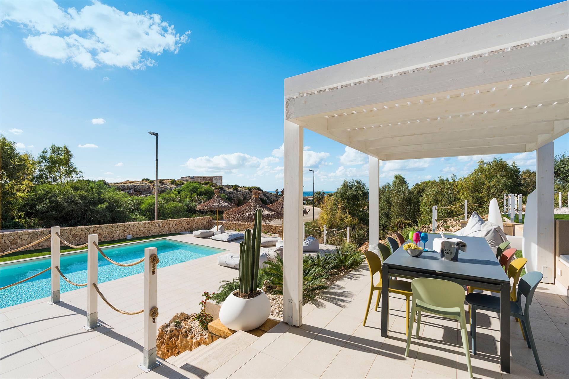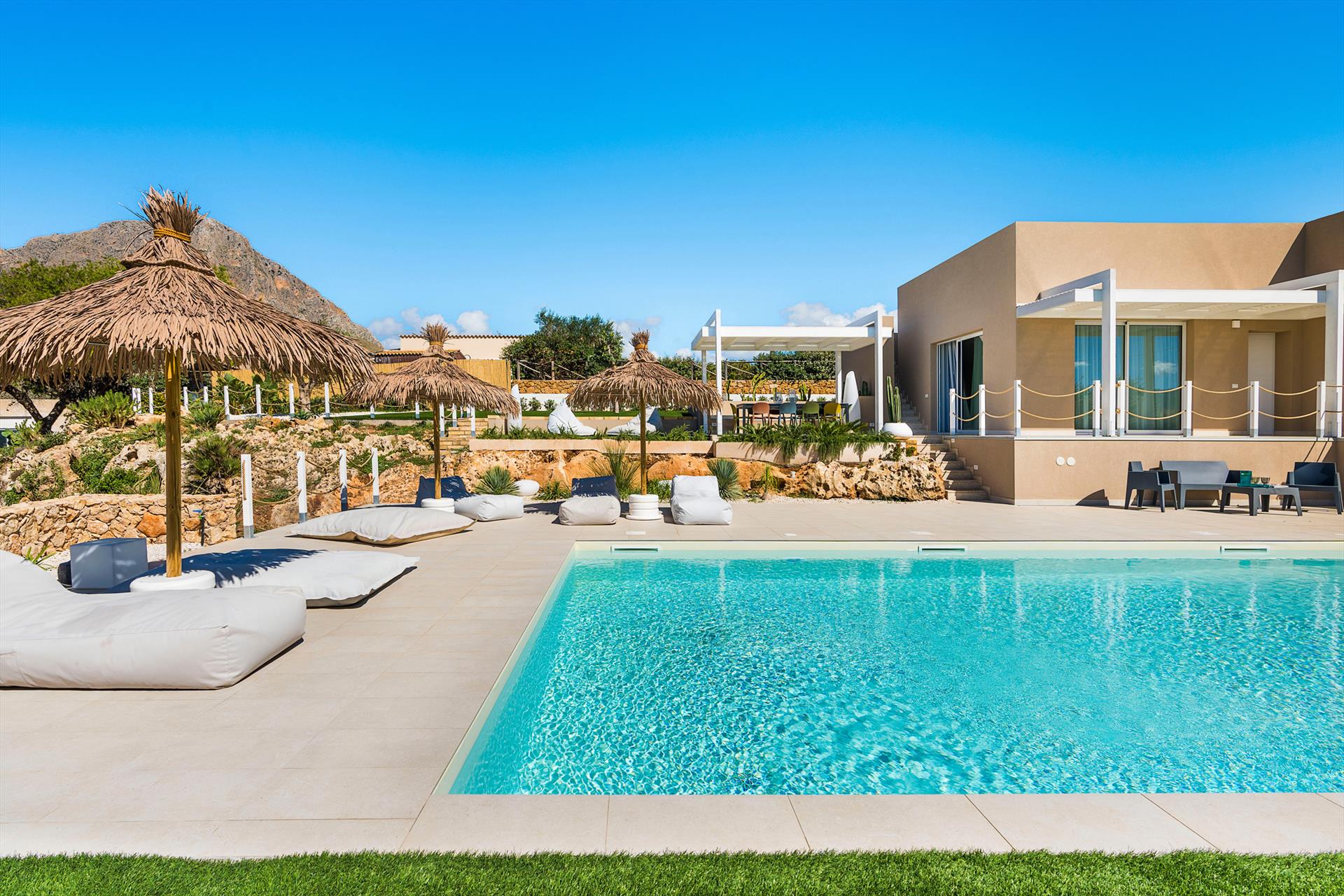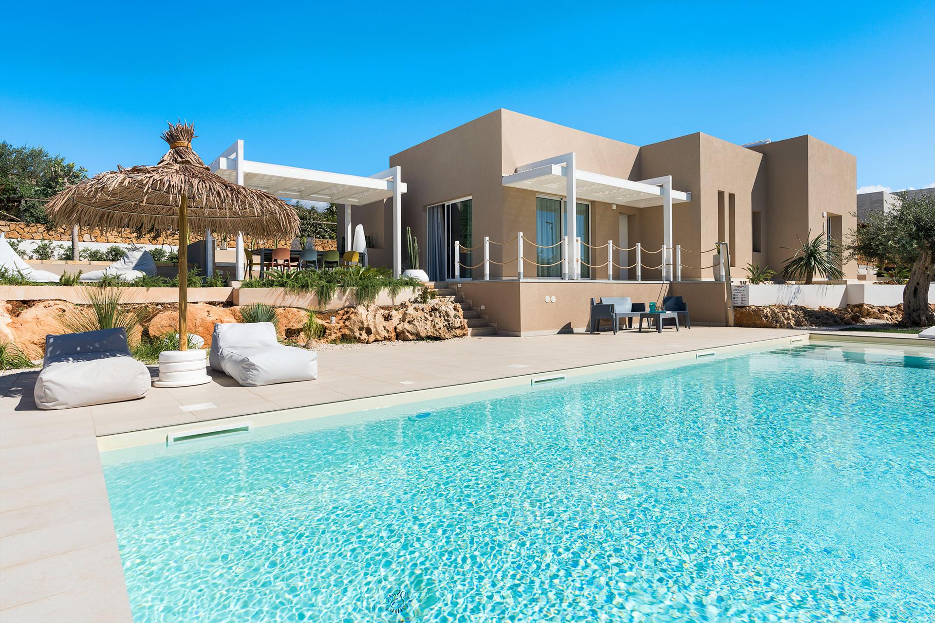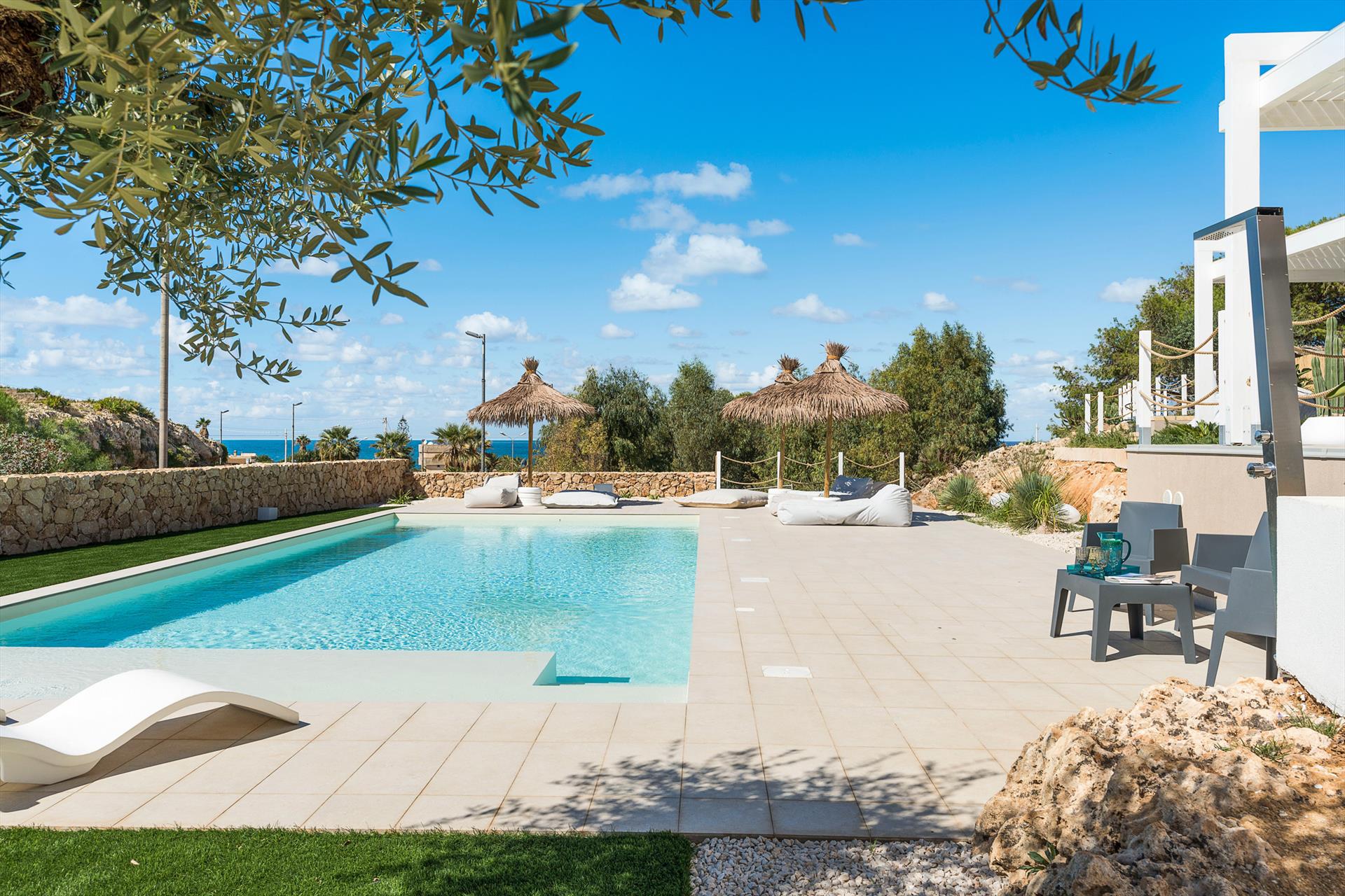 Baya Blu ist eine prächtige Villa mit Swimmingpool und Wellnessbereich in Cornino, einem bekannten Badeort in der Nähe von Trapani, Erice und San Vito Lo Capo.