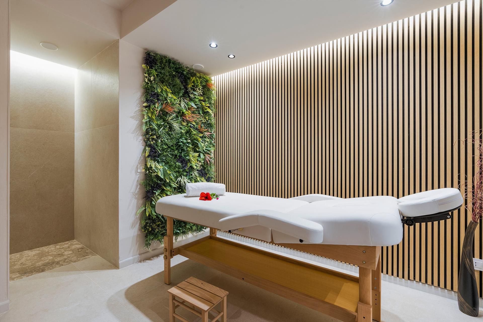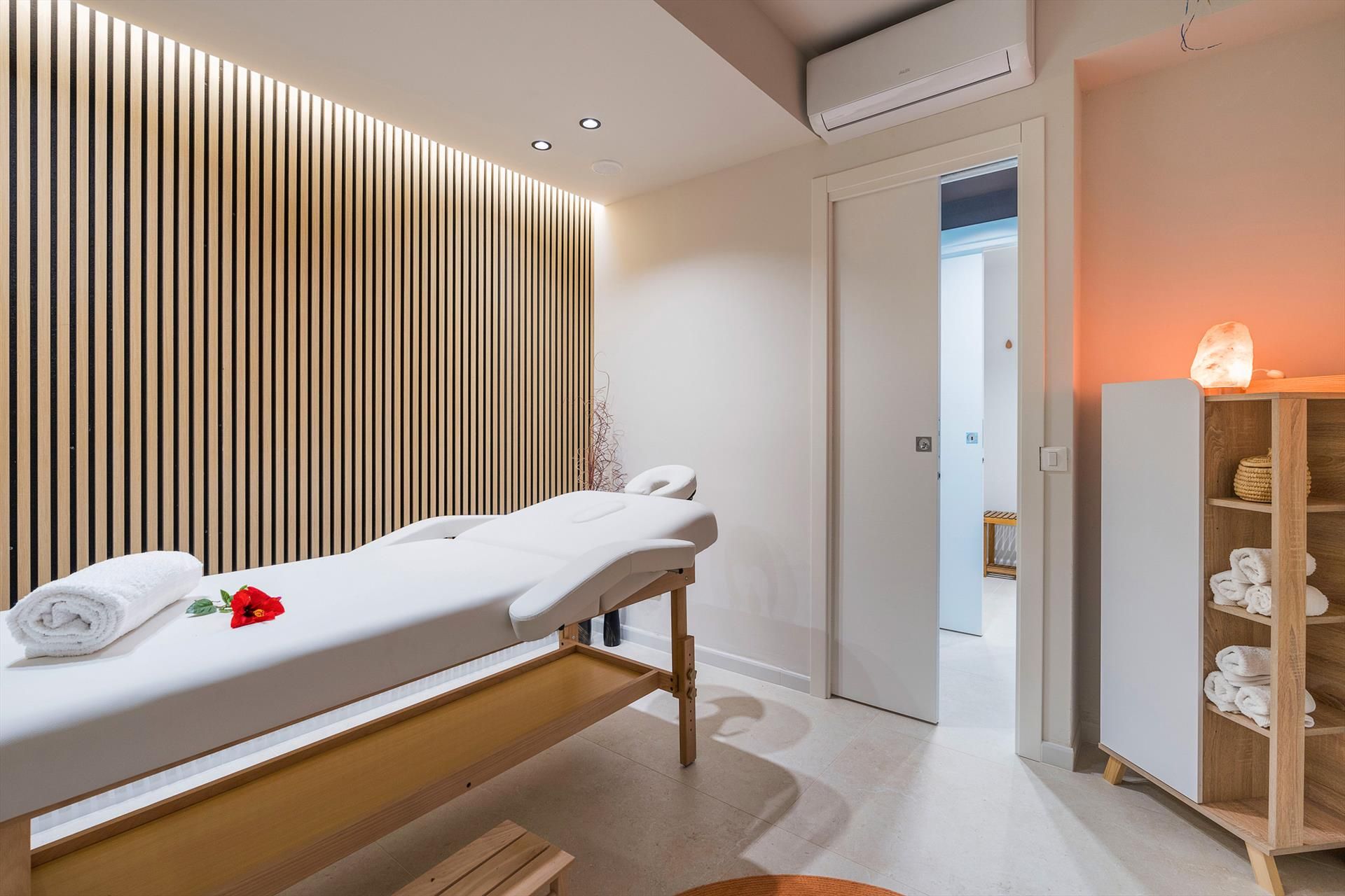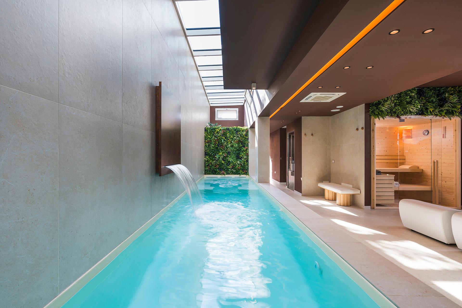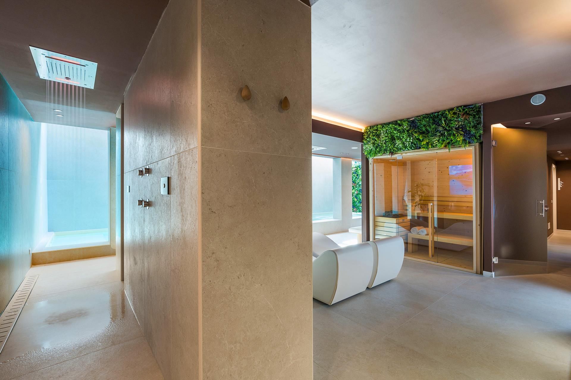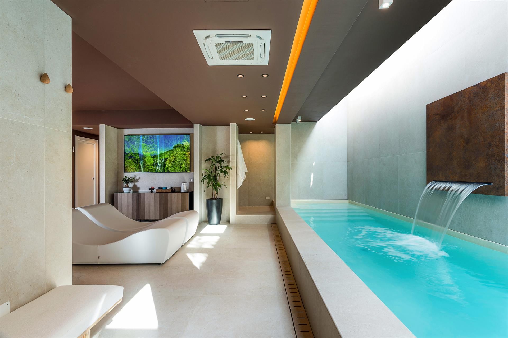 Die Villa, die sich über zwei Ebenen erstreckt, besticht durch ihre einladenden, gut aufgeteilten Innenräume, die mit besonderer Sorgfalt und Liebe zu den Materialien und Oberflächen ausgestattet sind. Das Hochparterre umfasst einen geräumigen Wohnbereich mit Küche, ein Gästebad und zwei komfortable Doppelzimmer mit eigenem Duschbad. Die untere Etage beherbergt die beiden weiteren Schlafzimmer, ebenfalls mit eigenem Duschbad, sowie den exklusiven Wellnessbereich. Dieser verfügt über einen beheizten Innenpool mit Wasserfall und Hydromassage-Ecke, eine Sauna, ein türkisches Bad, eine Erlebnisdusche, eine Tee-Ecke, einen Ruhebereich, einen Massageraum und zwei Badezimmer.