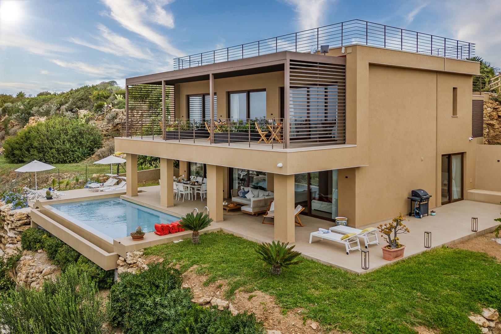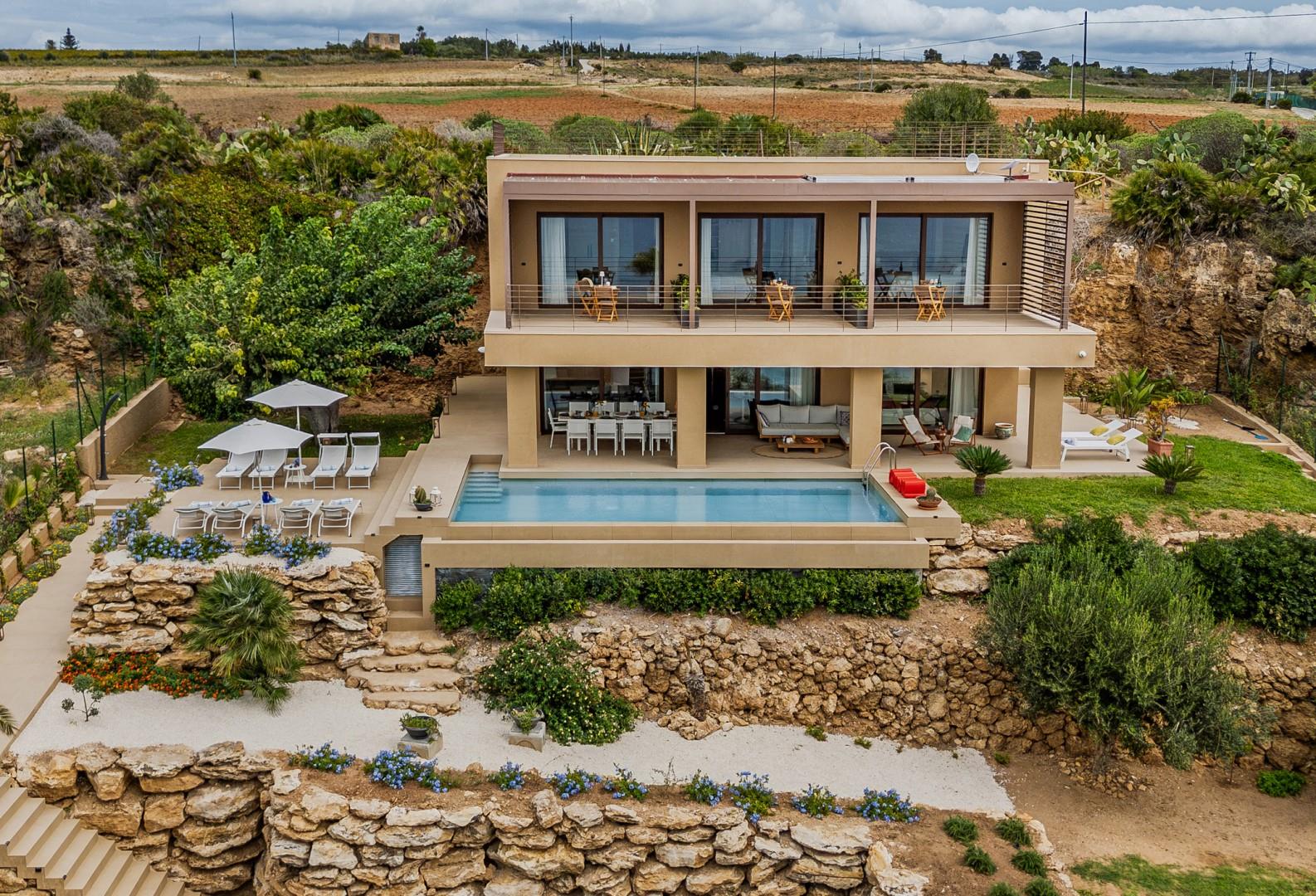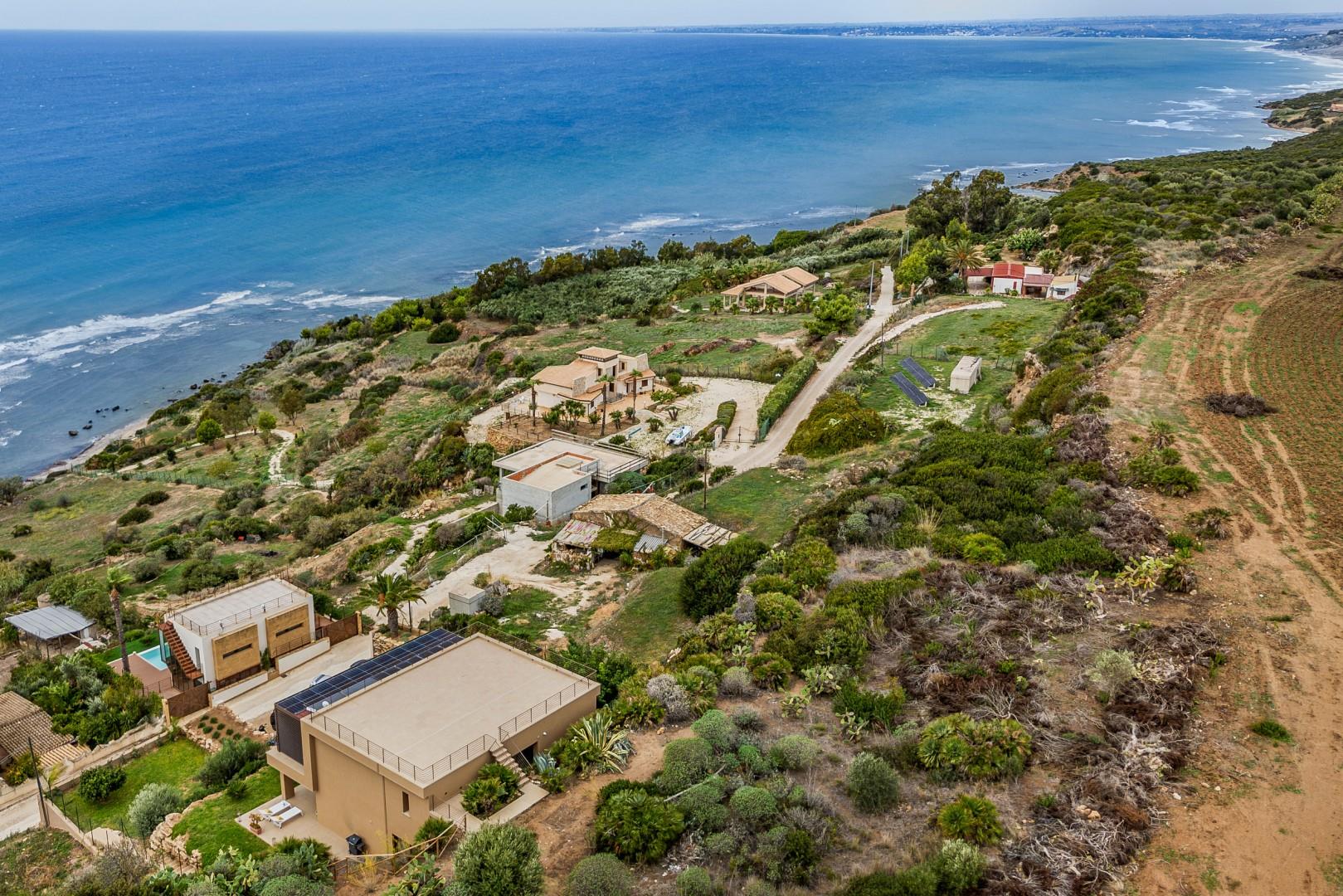Die Villa Tiche befindet sich nur wenige Autominuten von Sciacca entfernt, einer malerischen Küstenstadt, die für ihre wunderschönen Strände, den Hafen und das lebendige historische Zentrum mit engen mittelalterlichen Gassen, alten Kirchen und zahlreichen Lokalen, in denen Sie die lokale Küche genießen können, bekannt ist, einschließlich frischem Fisch, Olivenöl und den berühmten sizilianischen Weinen. Die Villa liegt in einem Wohngebiet, von dem aus Sie das Meer bequem zu Fuß erreichen können. Diese moderne, neu erbaute Villa liegt 50 Meter über dem Meeresspiegel und bietet auf zwei Etagen ca. 350 Quadratmeter Wohnfläche mit gemütlichen und geselligen Räumen, perfekt zum Entspannen oder Essen mit Freunden im Innen- und Außenbereich. Die Schlafzimmer sind geräumig und luftig, und die großen französischen Fenster, sowohl im Wohnzimmer als auch in den Schlafzimmern, schaffen eine harmonische Verbindung zwischen Innen- und Außenbereich. Der Poolbereich mit seinen klaren Linien ist das Herzstück der Villa, ideal zum Entspannen sowohl tagsüber als auch abends. Der terrassierte Garten rund um die Villa erstreckt sich über mehrere Ebenen mit gepflasterten Wegen und Terrassen, die hier und da durch Stufen verbunden sind. Von hier aus können Sie spektakuläre Sonnenuntergänge und atemberaubende Meerblicke genießen. Die Strände an der südwestlichen Küste Siziliens gehören zu den schönsten und abwechslungsreichsten der Insel, mit langen goldenen Sandstränden, versteckten Buchten und klarem Wasser. Für diejenigen, die es etwas ruhiger mögen, befindet sich nur wenige Gehminuten entfernt ein kleiner Strand zwischen den Felsen, der eine ruhige Atmosphäre bietet. Nur wenige Minuten weiter befindet sich der Sandstrand von San Marco mit Badeanstalten und Restaurants am Meer. Golfbegeisterte werden nicht enttäuscht sein, denn das Verdura Resort bietet zwei 18-Loch-Plätze, die in die natürliche Landschaft integriert sind, mit spektakulären Ausblicken auf das Meer und die umliegenden Hügel.