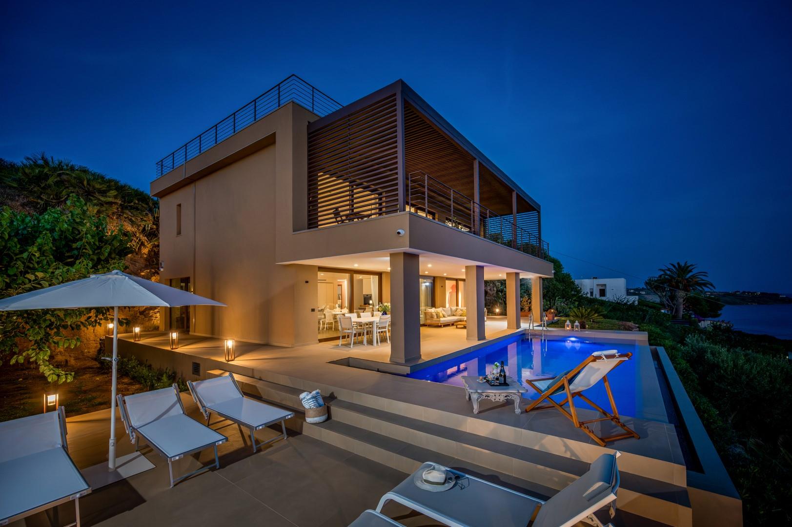 Der Infinity-Pool befindet sich im Erdgeschoss, direkt gegenüber der Veranda, und bietet einen herrlichen Meerblick. Er wirkt wie eine natürliche Erweiterung der Veranda und ist nur wenige Schritte vom Innenbereich entfernt leicht zugänglich. Der rechteckige Pool mit den Maßen 9 x 4,5 Meter und einer Tiefe von 1,50 Meter ist mit Steinzeugfliesen ausgekleidet; er verfügt sowohl über römische Treppen als auch über eine seitliche Leiter. Ein kleiner Höhenunterschied von zwei Stufen trennt den Pool vom Solarium-Bereich von etwa 15 Quadratmetern, der mit Sonnenliegen und Sonnenschirmen ausgestattet ist. In geringer Entfernung befindet sich die Außendusche. Der mit Salz desinfizierte Pool kann dank Innen- und Außenbeleuchtung auch nachts genutzt werden. Geöffnet vom letzten Samstag im April bis zum ersten Samstag im Oktober