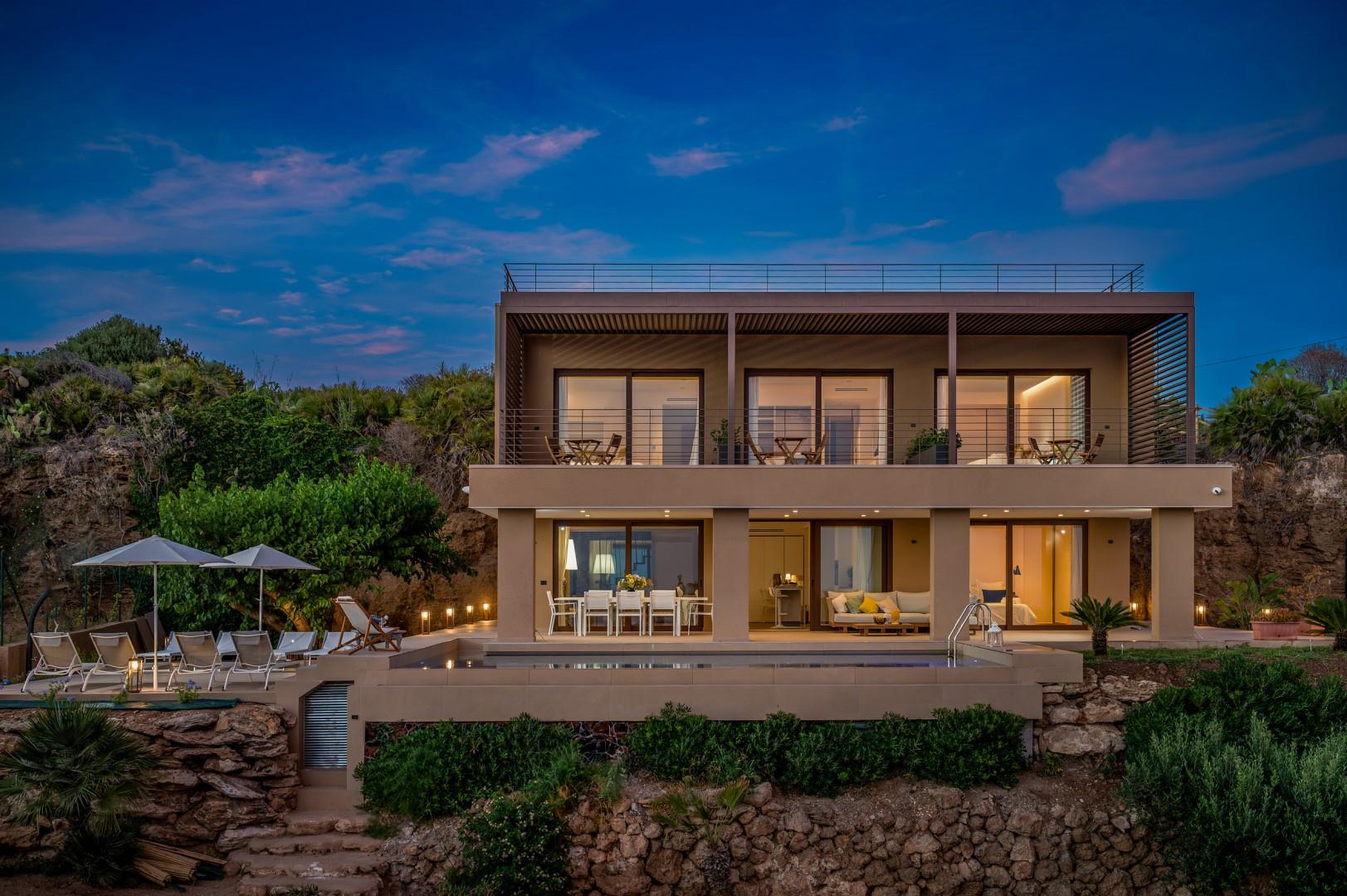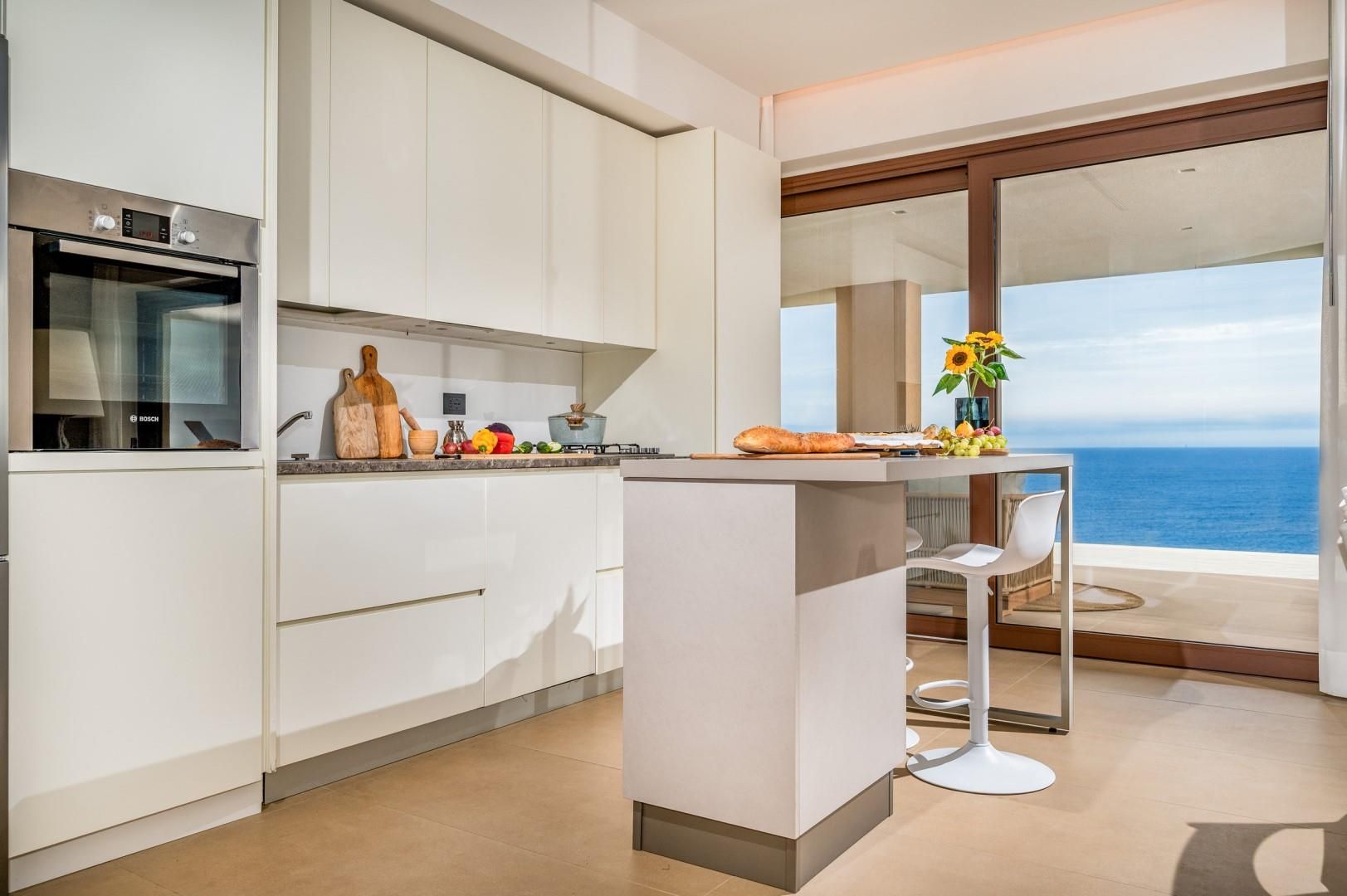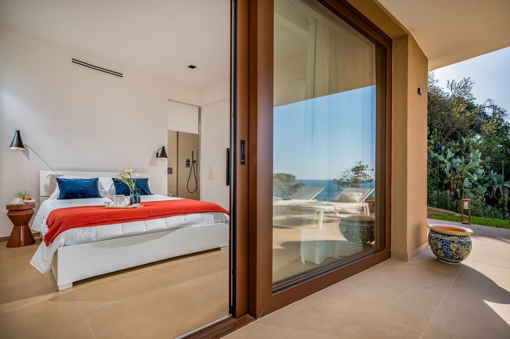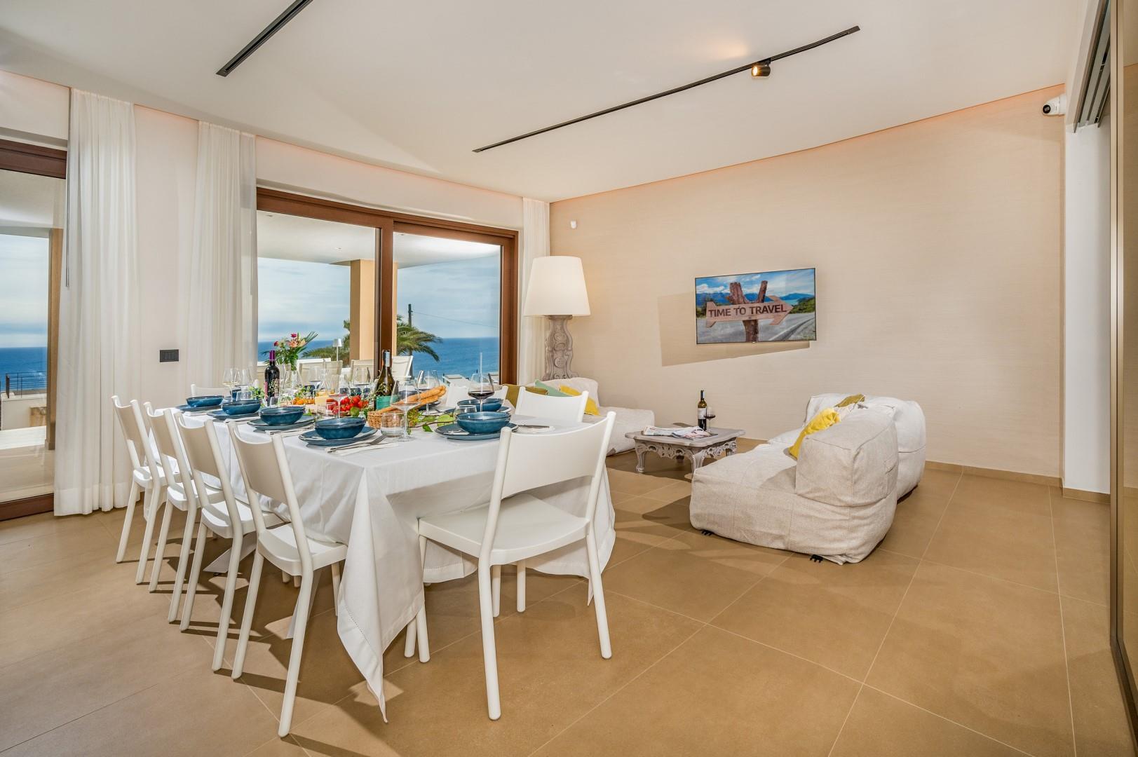 Der Haupteingang befindet sich an der Seite der Villa und öffnet sich zu einem gemütlichen Flur, in dem eine kleine Sitzecke mit zwei originalen Sesseln geschaffen wurde, der Kreuzungspunkt zwischen dem Wohnbereich, der durch eine Schiebetür getrennt ist, und der eisernen Treppe, die in den oberen Stock führt. Der luftige, offene Raum beherbergt eine bequeme Sitzecke mit modularen Sofas und einem Flachbildfernseher. Zwischen der modernen Küche mit Kochinsel und dem Wohnzimmer befindet sich der Essbereich mit einem Tisch für bis zu 10 Personen. Die Helligkeit des Raumes wird durch die raumhohe französische Tür gewährleistet, die Zugang zur Veranda bietet. Die Küche führt in den Schlafbereich im Erdgeschoss, wo sich die ersten beiden Doppelzimmer befinden, jedes mit begehbarem Kleiderschrank und eigenem Bad mit Dusche. Beide Zimmer haben direkten Zugang nach draußen. Im Schlafbereich befindet sich auch eine kleine, aber gut organisierte Waschküche. Zurück im Eingangsbereich führt die Designer-Stahltreppe in den oberen Stock, wo sich drei weitere Doppelzimmer befinden, jedes mit eigenem Bad mit Dusche. Jedes Zimmer verfügt über einen privaten Teil einer möblierten Terrasse mit Meerblick und ist mit einem Schreibtisch ausgestattet; eines der Zimmer bietet auch eine Sitzecke mit Sofa. Eine Außentreppe führt vom Treppenabsatz im Obergeschoss in den hinteren Garten. Hinweis: Die Villa hat einige Stufen ohne Handlauf, daher ist Vorsicht geboten.