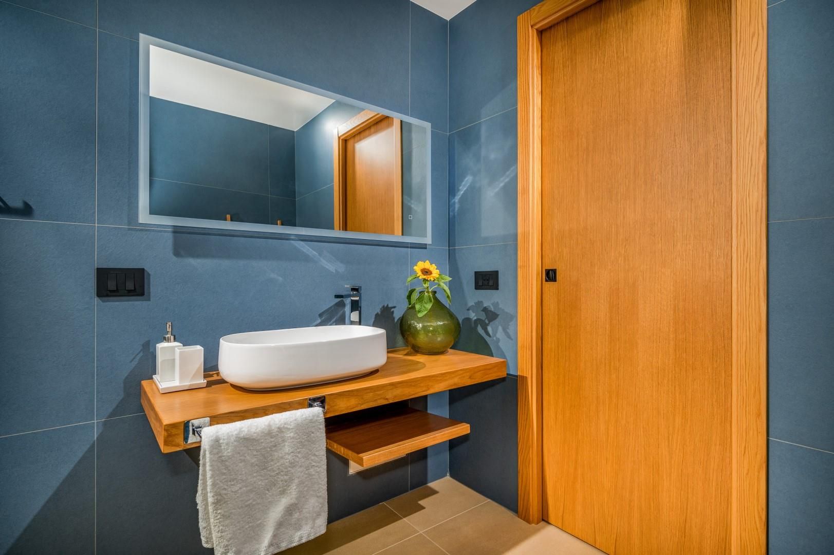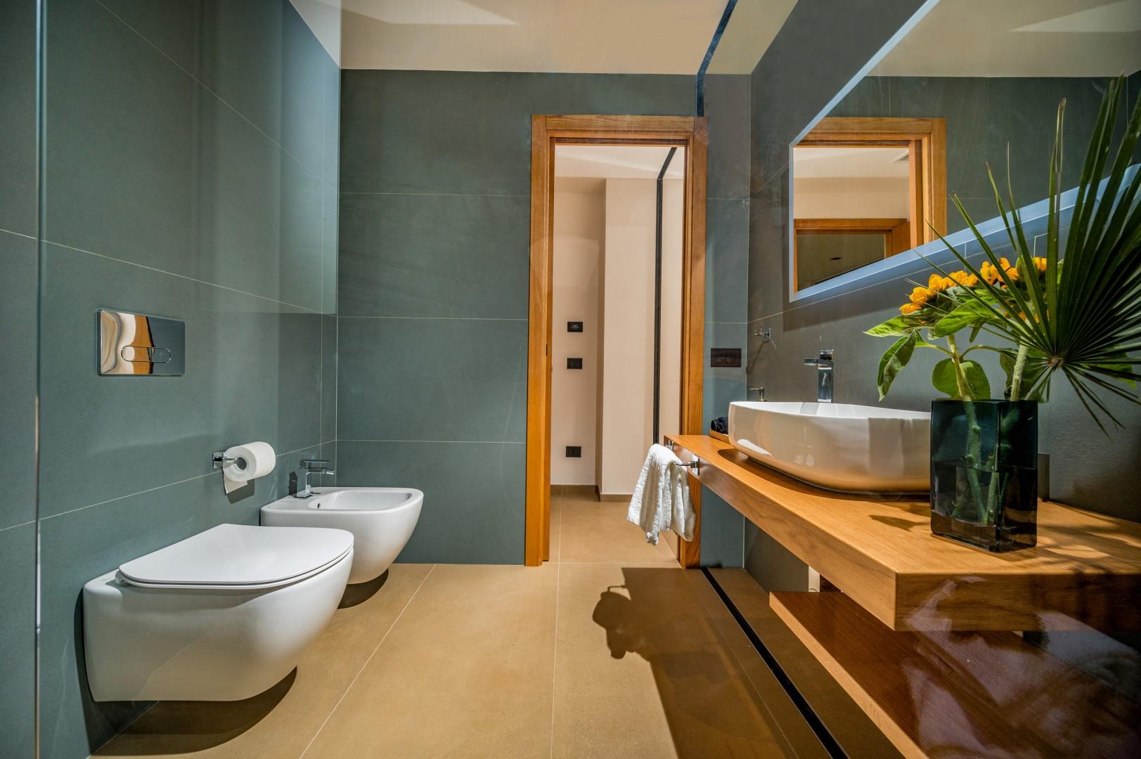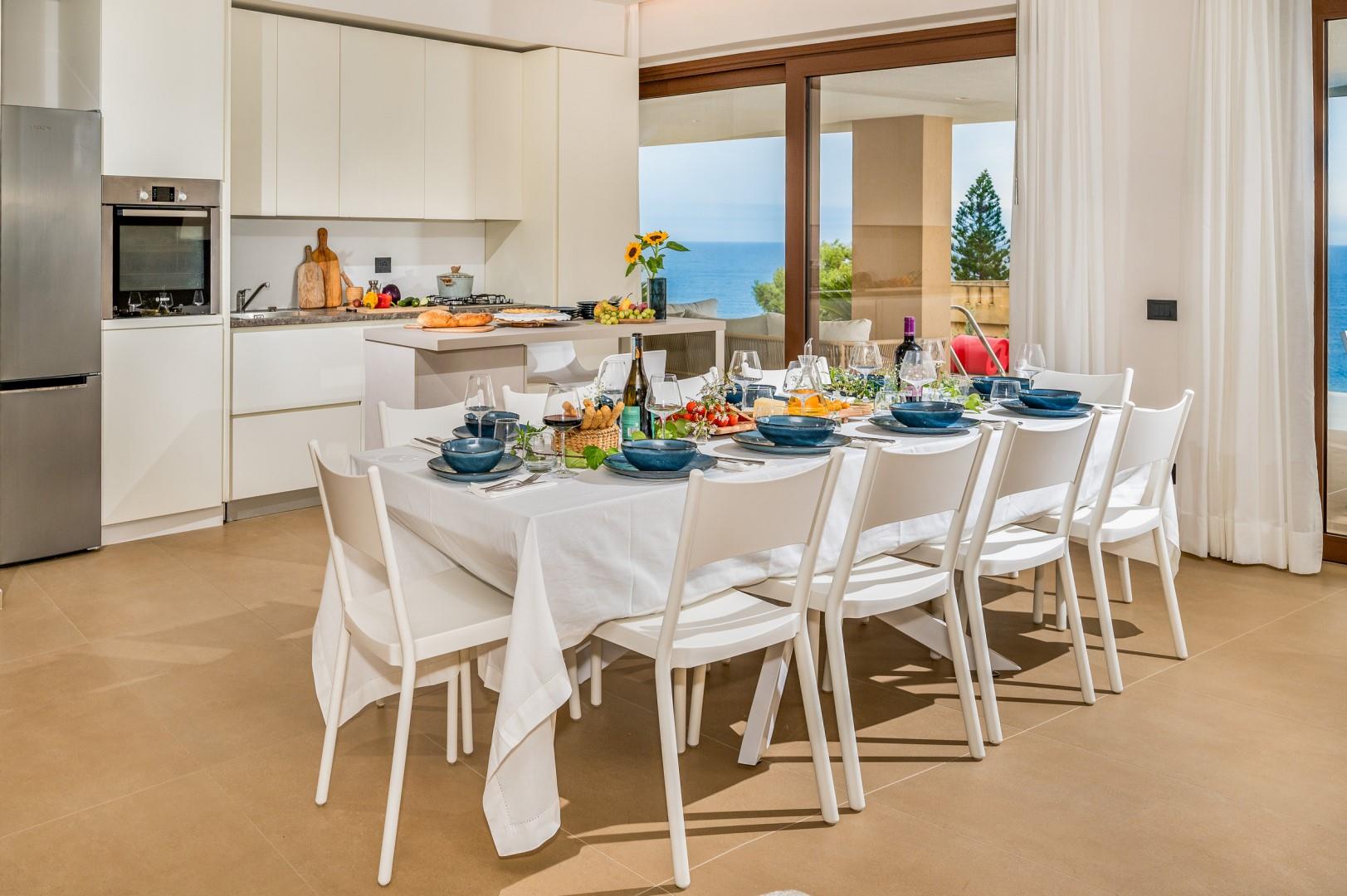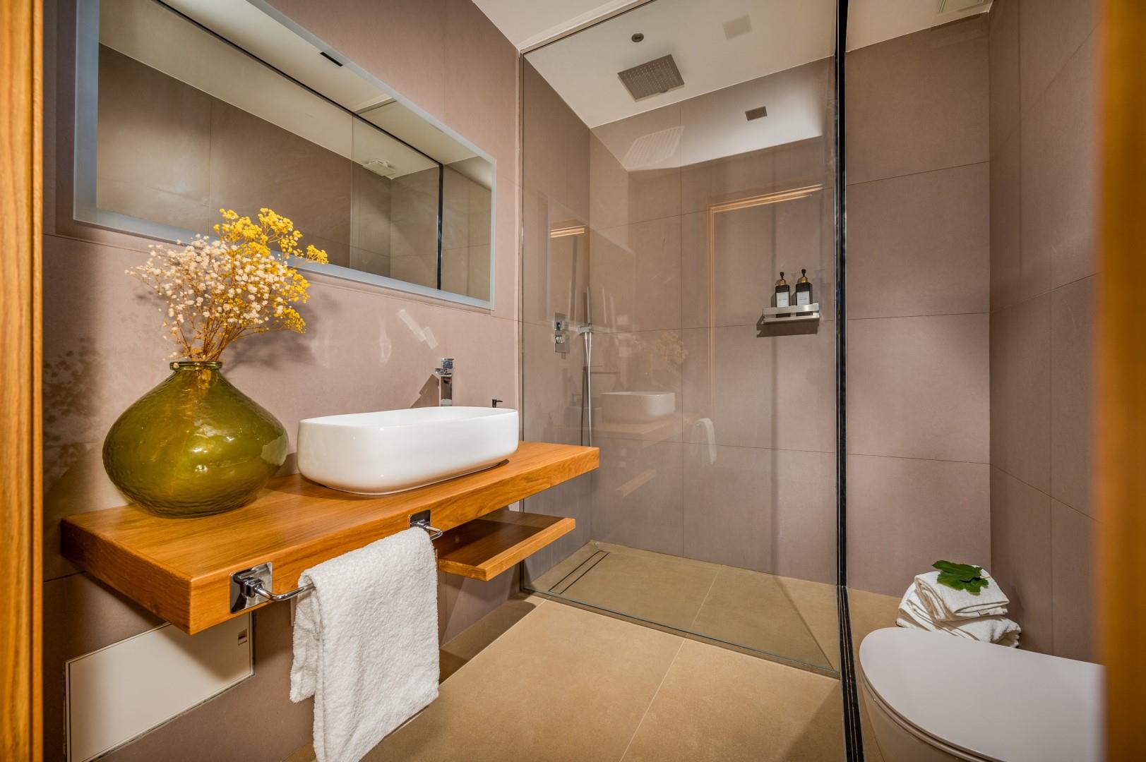Der Haupteingang befindet sich an der Seite der Villa und öffnet sich zu einem gemütlichen Flur, in dem eine kleine Sitzecke mit zwei originalen Sesseln geschaffen wurde, der Kreuzungspunkt zwischen dem Wohnbereich, der durch eine Schiebetür getrennt ist, und der eisernen Treppe, die in den oberen Stock führt. Der luftige, offene Raum beherbergt eine bequeme Sitzecke mit modularen Sofas und einem Flachbildfernseher. Zwischen der modernen Küche mit Kochinsel und dem Wohnzimmer befindet sich der Essbereich mit einem Tisch für bis zu 10 Personen. Die Helligkeit des Raumes wird durch die raumhohe französische Tür gewährleistet, die Zugang zur Veranda bietet. Die Küche führt in den Schlafbereich im Erdgeschoss, wo sich die ersten beiden Doppelzimmer befinden, jedes mit begehbarem Kleiderschrank und eigenem Bad mit Dusche. Beide Zimmer haben direkten Zugang nach draußen. Im Schlafbereich befindet sich auch eine kleine, aber gut organisierte Waschküche. Zurück im Eingangsbereich führt die Designer-Stahltreppe in den oberen Stock, wo sich drei weitere Doppelzimmer befinden, jedes mit eigenem Bad mit Dusche. Jedes Zimmer verfügt über einen privaten Teil einer möblierten Terrasse mit Meerblick und ist mit einem Schreibtisch ausgestattet; eines der Zimmer bietet auch eine Sitzecke mit Sofa. Eine Außentreppe führt vom Treppenabsatz im Obergeschoss in den hinteren Garten. Hinweis: Die Villa hat einige Stufen ohne Handlauf, daher ist Vorsicht geboten.