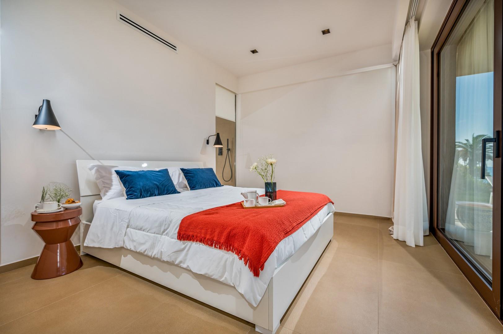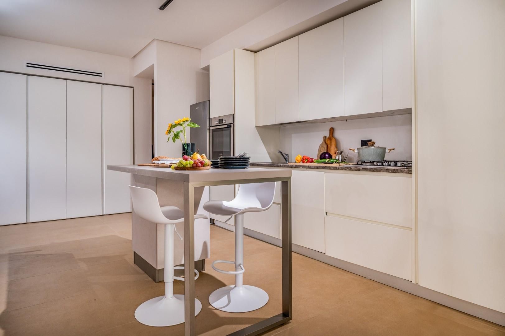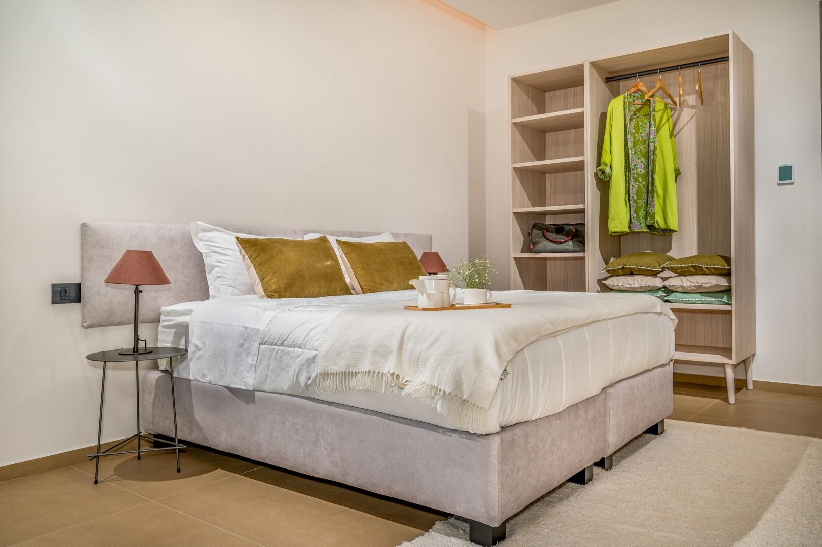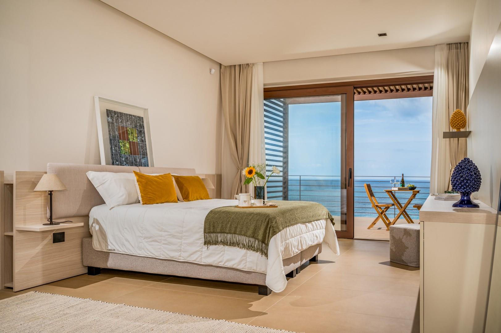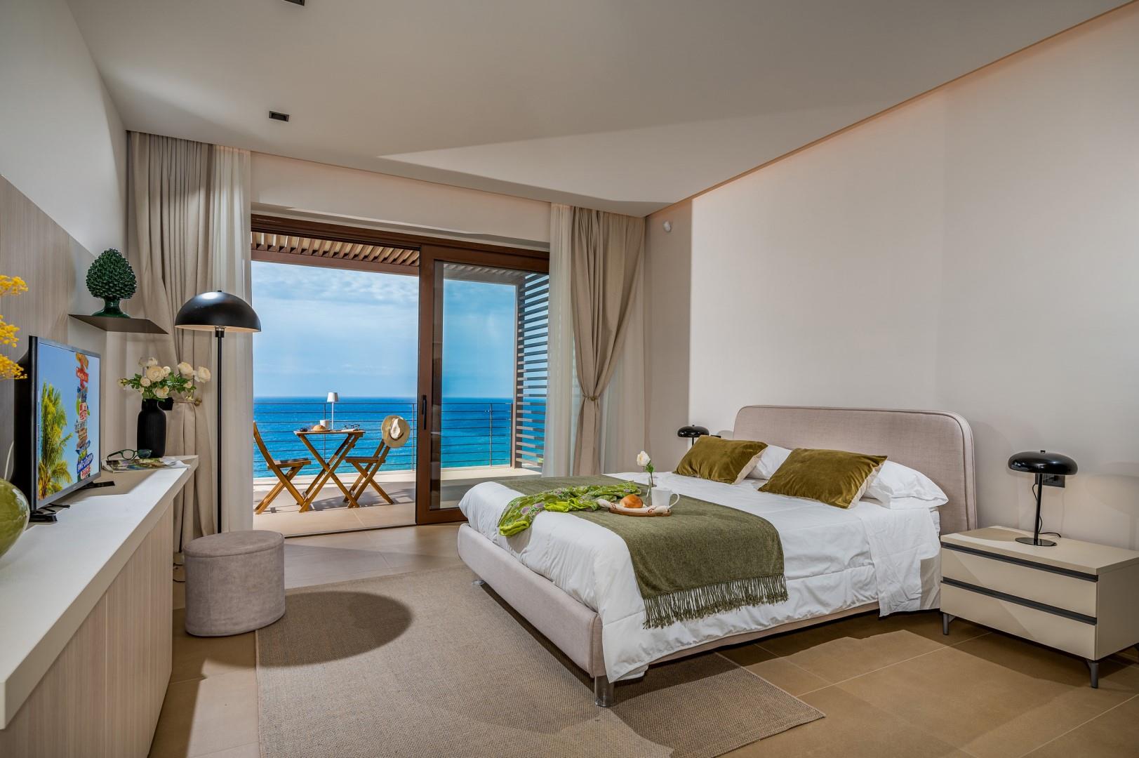 Der Haupteingang befindet sich an der Seite der Villa und öffnet sich zu einem gemütlichen Flur, in dem eine kleine Sitzecke mit zwei originalen Sesseln geschaffen wurde, der Kreuzungspunkt zwischen dem Wohnbereich, der durch eine Schiebetür getrennt ist, und der eisernen Treppe, die in den oberen Stock führt. Der luftige, offene Raum beherbergt eine bequeme Sitzecke mit modularen Sofas und einem Flachbildfernseher. Zwischen der modernen Küche mit Kochinsel und dem Wohnzimmer befindet sich der Essbereich mit einem Tisch für bis zu 10 Personen. Die Helligkeit des Raumes wird durch die raumhohe französische Tür gewährleistet, die Zugang zur Veranda bietet. Die Küche führt in den Schlafbereich im Erdgeschoss, wo sich die ersten beiden Doppelzimmer befinden, jedes mit begehbarem Kleiderschrank und eigenem Bad mit Dusche. Beide Zimmer haben direkten Zugang nach draußen. Im Schlafbereich befindet sich auch eine kleine, aber gut organisierte Waschküche. Zurück im Eingangsbereich führt die Designer-Stahltreppe in den oberen Stock, wo sich drei weitere Doppelzimmer befinden, jedes mit eigenem Bad mit Dusche. Jedes Zimmer verfügt über einen privaten Teil einer möblierten Terrasse mit Meerblick und ist mit einem Schreibtisch ausgestattet; eines der Zimmer bietet auch eine Sitzecke mit Sofa. Eine Außentreppe führt vom Treppenabsatz im Obergeschoss in den hinteren Garten. Hinweis: Die Villa hat einige Stufen ohne Handlauf, daher ist Vorsicht geboten.