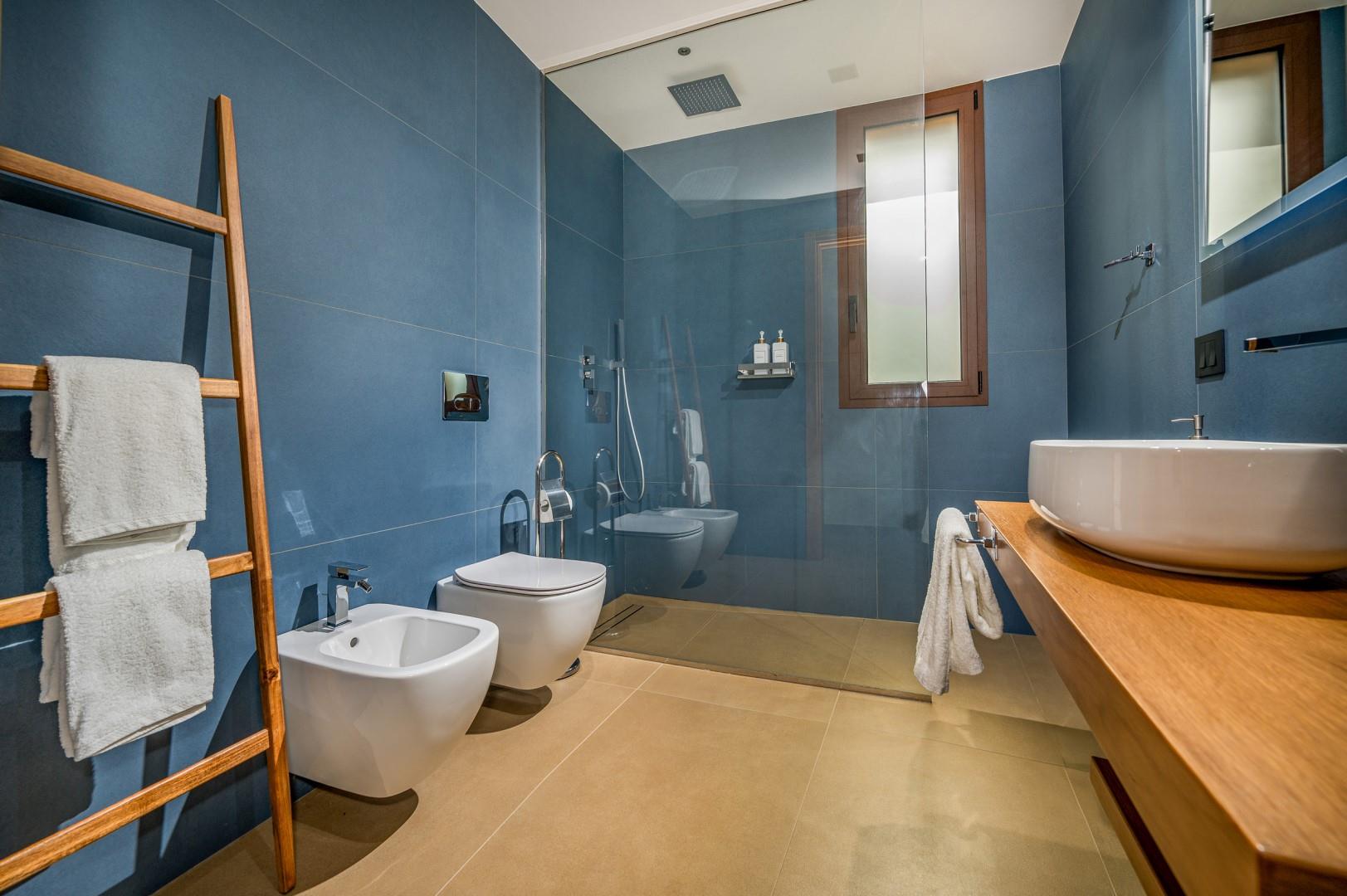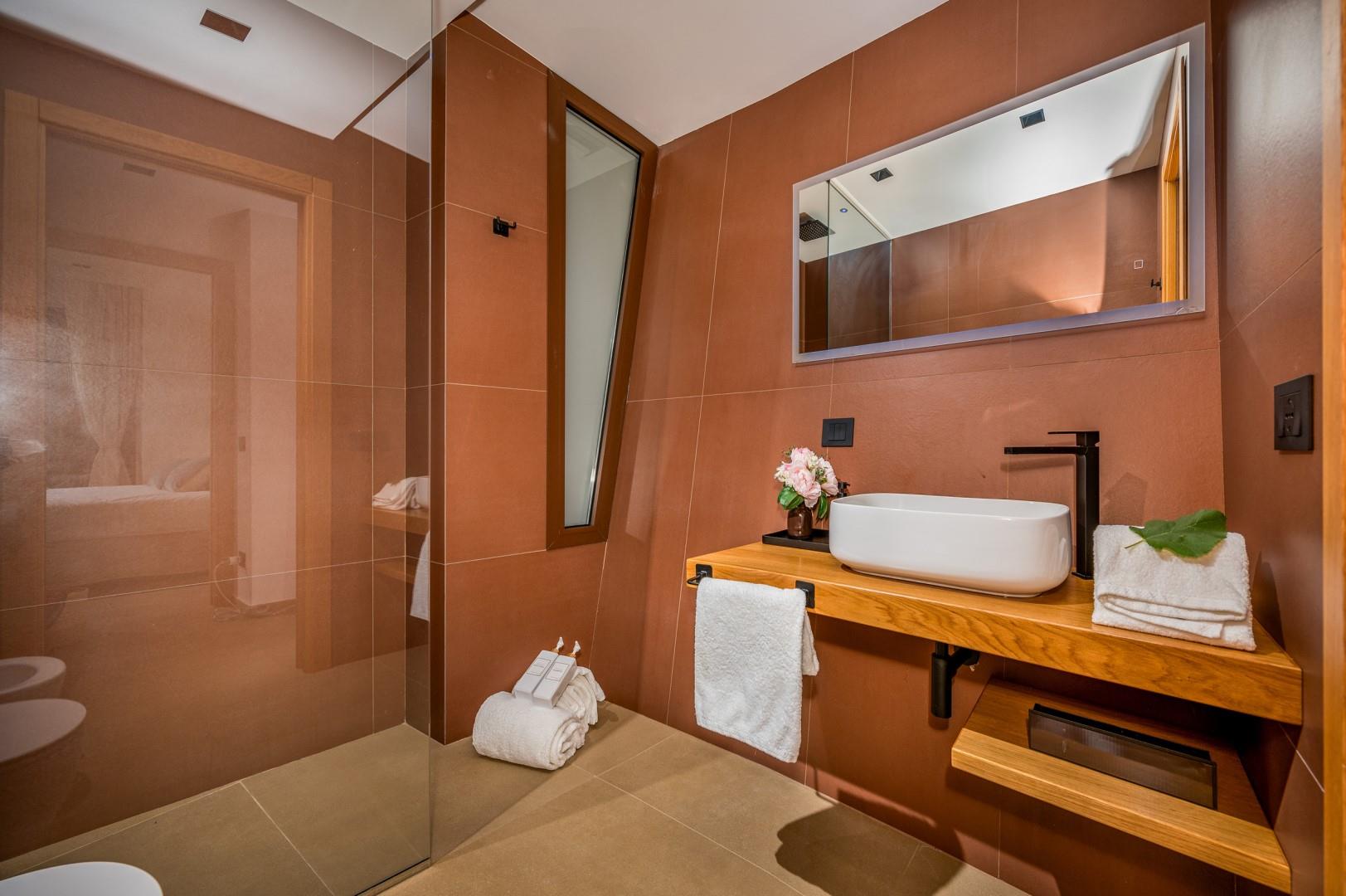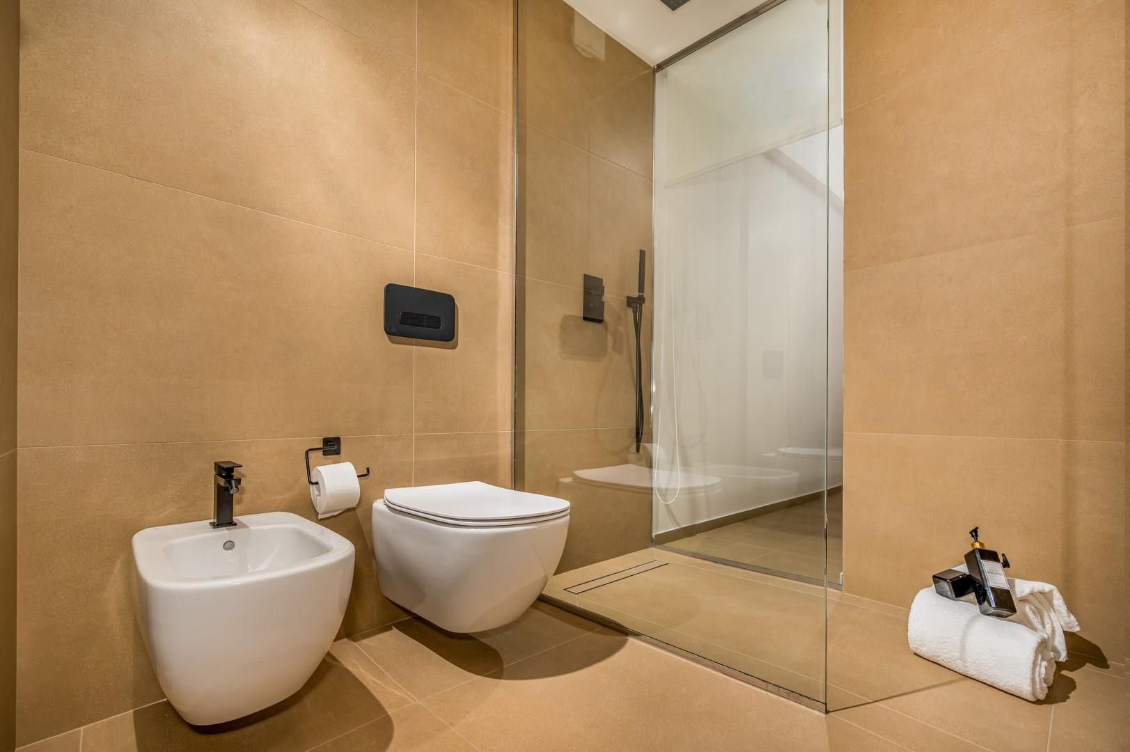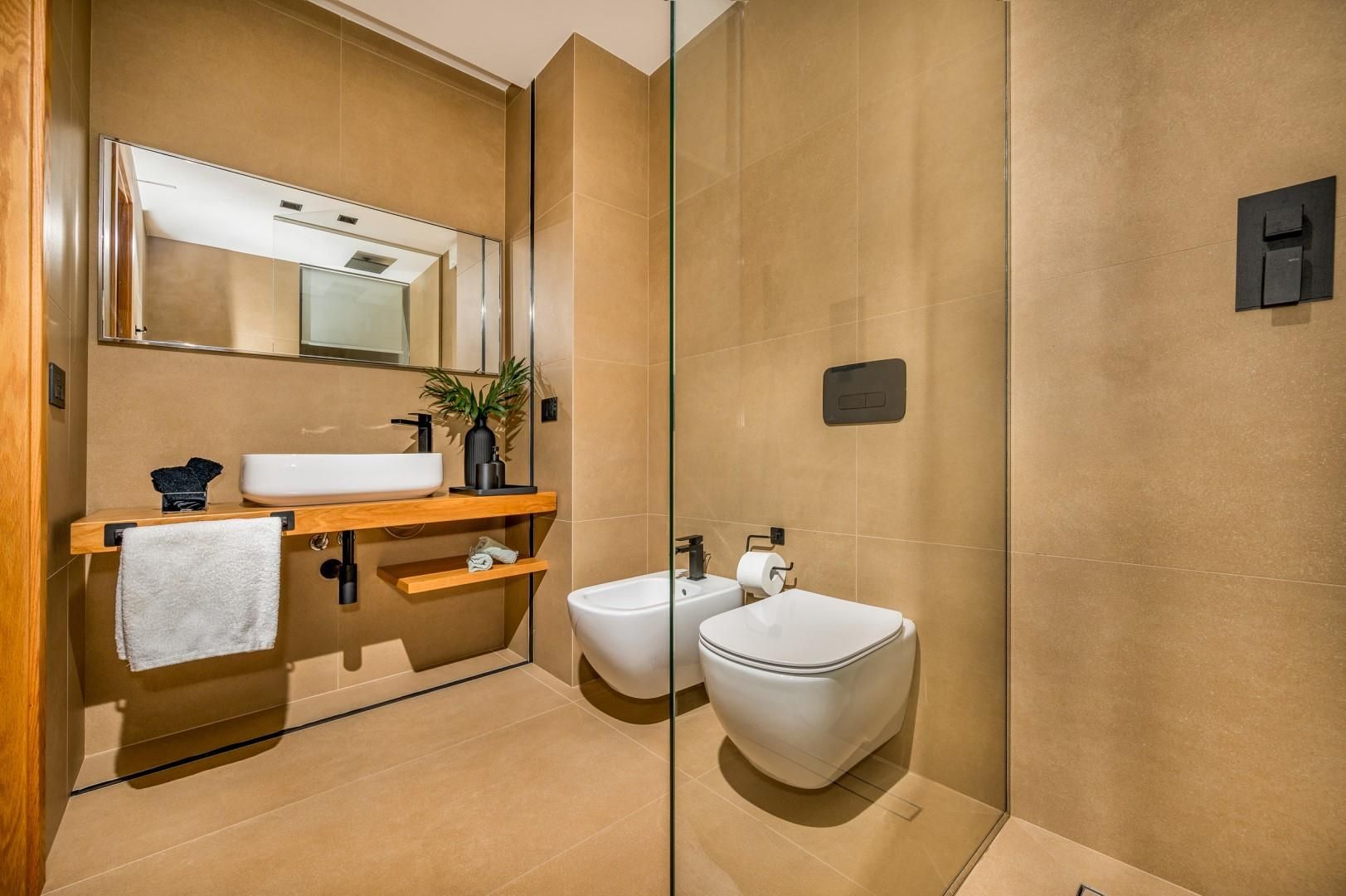 Der Haupteingang befindet sich an der Seite der Villa und öffnet sich zu einem gemütlichen Flur, in dem eine kleine Sitzecke mit zwei originalen Sesseln geschaffen wurde, der Kreuzungspunkt zwischen dem Wohnbereich, der durch eine Schiebetür getrennt ist, und der eisernen Treppe, die in den oberen Stock führt. Der luftige, offene Raum beherbergt eine bequeme Sitzecke mit modularen Sofas und einem Flachbildfernseher. Zwischen der modernen Küche mit Kochinsel und dem Wohnzimmer befindet sich der Essbereich mit einem Tisch für bis zu 10 Personen. Die Helligkeit des Raumes wird durch die raumhohe französische Tür gewährleistet, die Zugang zur Veranda bietet. Die Küche führt in den Schlafbereich im Erdgeschoss, wo sich die ersten beiden Doppelzimmer befinden, jedes mit begehbarem Kleiderschrank und eigenem Bad mit Dusche. Beide Zimmer haben direkten Zugang nach draußen. Im Schlafbereich befindet sich auch eine kleine, aber gut organisierte Waschküche. Zurück im Eingangsbereich führt die Designer-Stahltreppe in den oberen Stock, wo sich drei weitere Doppelzimmer befinden, jedes mit eigenem Bad mit Dusche. Jedes Zimmer verfügt über einen privaten Teil einer möblierten Terrasse mit Meerblick und ist mit einem Schreibtisch ausgestattet; eines der Zimmer bietet auch eine Sitzecke mit Sofa. Eine Außentreppe führt vom Treppenabsatz im Obergeschoss in den hinteren Garten. Hinweis: Die Villa hat einige Stufen ohne Handlauf, daher ist Vorsicht geboten.