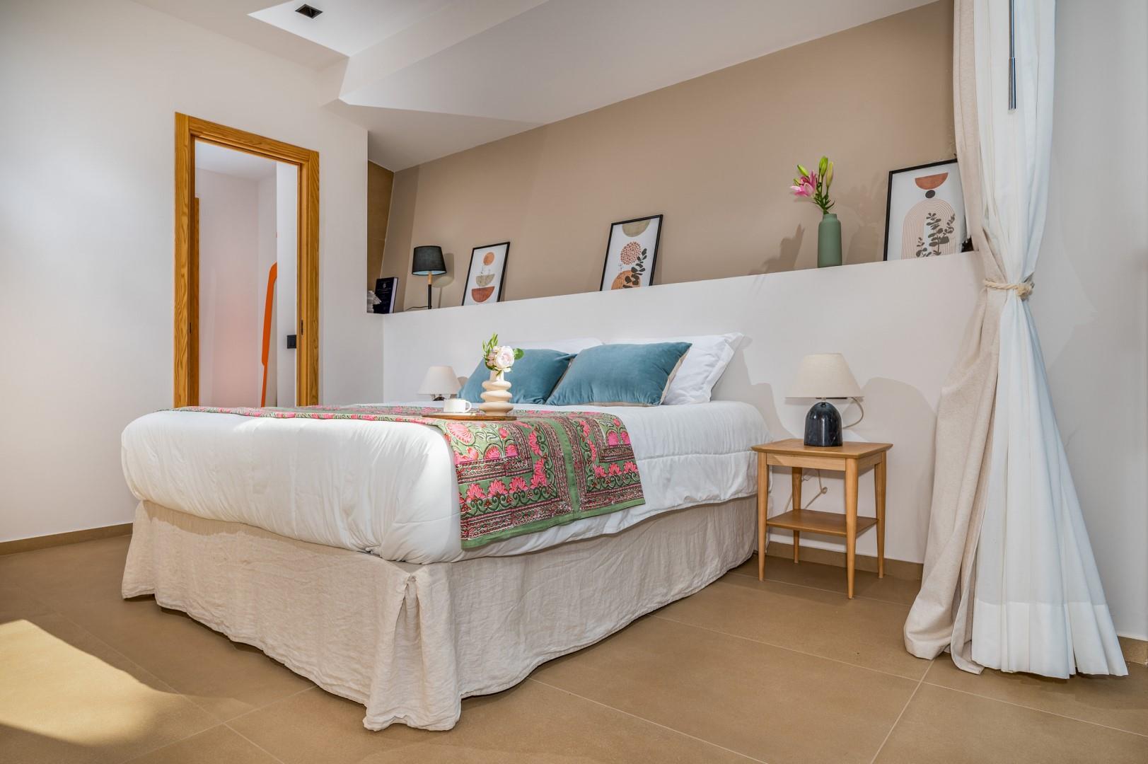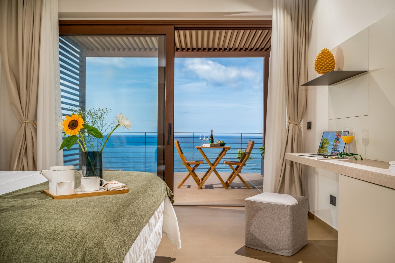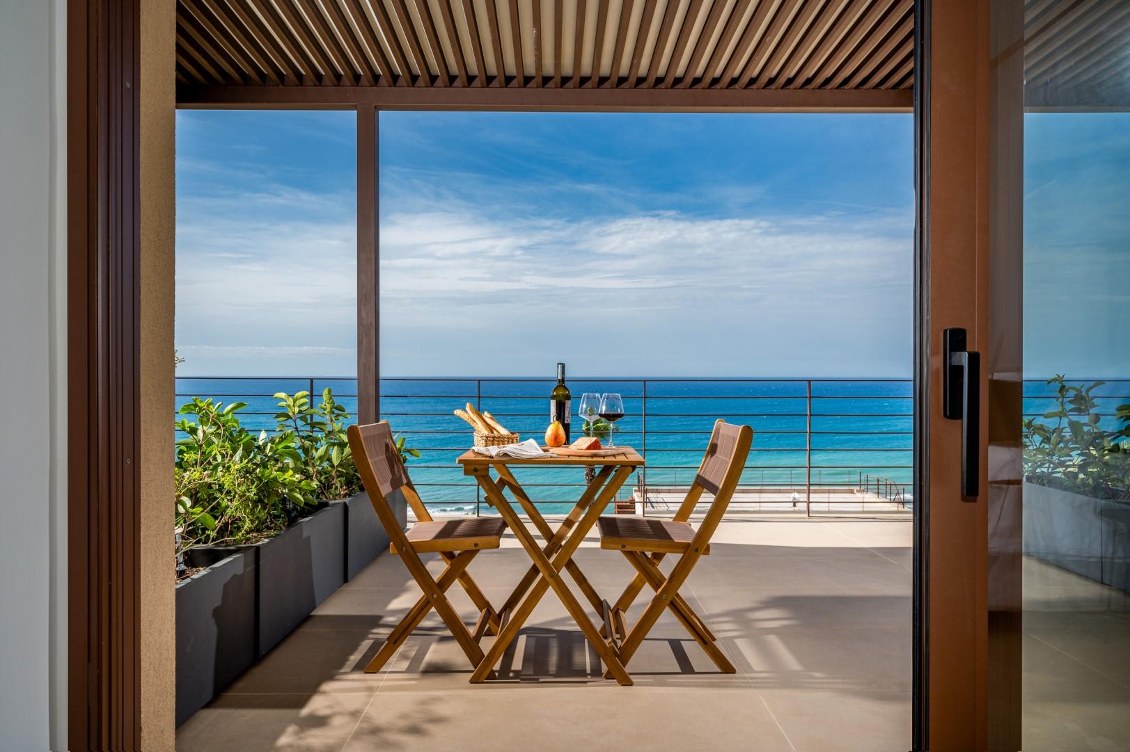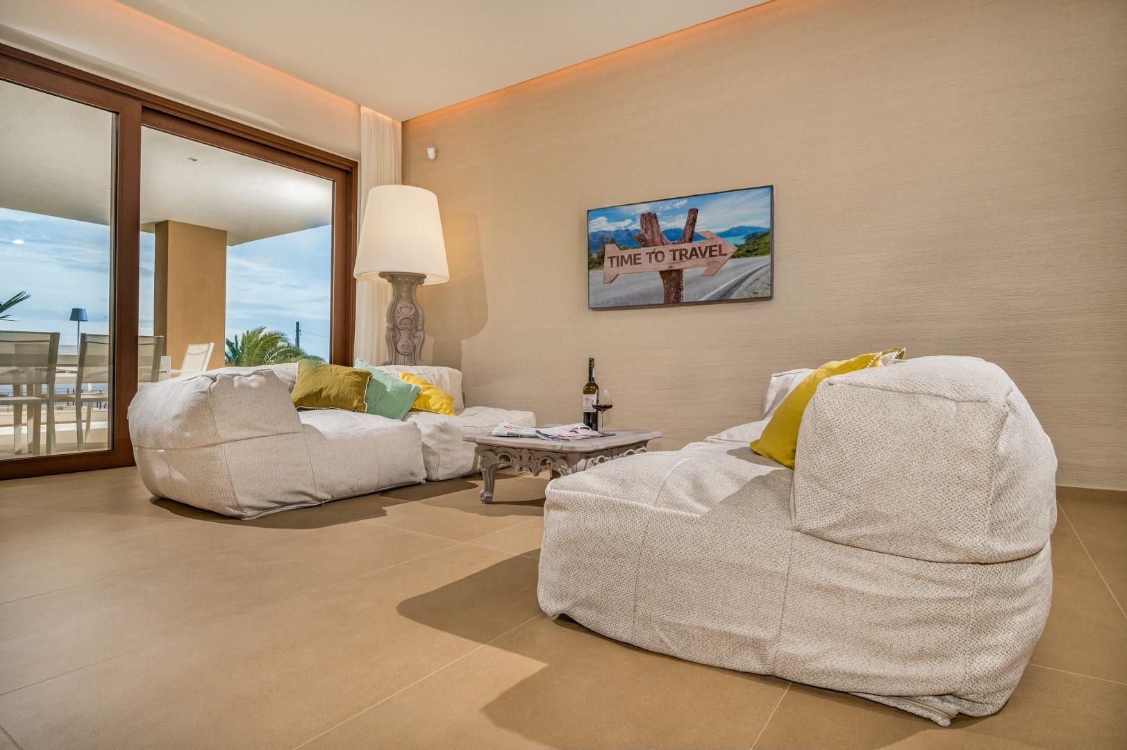 Der Haupteingang befindet sich an der Seite der Villa und öffnet sich zu einem gemütlichen Flur, in dem eine kleine Sitzecke mit zwei originalen Sesseln geschaffen wurde, der Kreuzungspunkt zwischen dem Wohnbereich, der durch eine Schiebetür getrennt ist, und der eisernen Treppe, die in den oberen Stock führt. Der luftige, offene Raum beherbergt eine bequeme Sitzecke mit modularen Sofas und einem Flachbildfernseher. Zwischen der modernen Küche mit Kochinsel und dem Wohnzimmer befindet sich der Essbereich mit einem Tisch für bis zu 10 Personen. Die Helligkeit des Raumes wird durch die raumhohe französische Tür gewährleistet, die Zugang zur Veranda bietet. Die Küche führt in den Schlafbereich im Erdgeschoss, wo sich die ersten beiden Doppelzimmer befinden, jedes mit begehbarem Kleiderschrank und eigenem Bad mit Dusche. Beide Zimmer haben direkten Zugang nach draußen. Im Schlafbereich befindet sich auch eine kleine, aber gut organisierte Waschküche. Zurück im Eingangsbereich führt die Designer-Stahltreppe in den oberen Stock, wo sich drei weitere Doppelzimmer befinden, jedes mit eigenem Bad mit Dusche. Jedes Zimmer verfügt über einen privaten Teil einer möblierten Terrasse mit Meerblick und ist mit einem Schreibtisch ausgestattet; eines der Zimmer bietet auch eine Sitzecke mit Sofa. Eine Außentreppe führt vom Treppenabsatz im Obergeschoss in den hinteren Garten. Hinweis: Die Villa hat einige Stufen ohne Handlauf, daher ist Vorsicht geboten.
