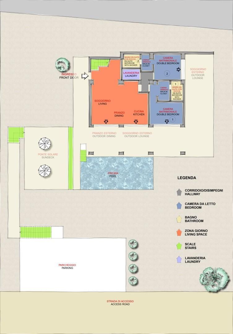 Die über 2.000 Quadratmeter große Anlage ist als terrassierter Garten auf mehreren Ebenen angelegt, wobei sich Rasenflächen, Wege und gepflasterte Plattformen abwechseln, die die verschiedenen Eingänge zum Haus verbinden und so verschiedene Ruhezonen schaffen. Es ist möglich, sich auf dem Rasen im Schatten eines großzügigen weißen Maulbeerbaums oder auf der Sitzbank am Fuße des Felsens zu entspannen. Im Hintergrund erstreckt sich die Hälfte des Grundstücks in seinem natürlichen, kargen Zustand, typisch für die mediterrane Macchia in dieser Gegend. Von der zur Villa führenden unbefestigten Straße befindet sich unmittelbar unterhalb der zur Villa führenden Stufen ein privater Parkplatz für zwei Autos. Hier wird man von einer Sonnenterrasse begrüßt, die über eine kleine Steigung zur Veranda führt, die mit einem Ess- und Wohnbereich ausgestattet ist, der von einem Baldachin beschattet wird und einen Blick auf den Pool bietet, in natürlicher Kontinuität. In diesem Bereich befindet sich auch ein mobiler Grill.