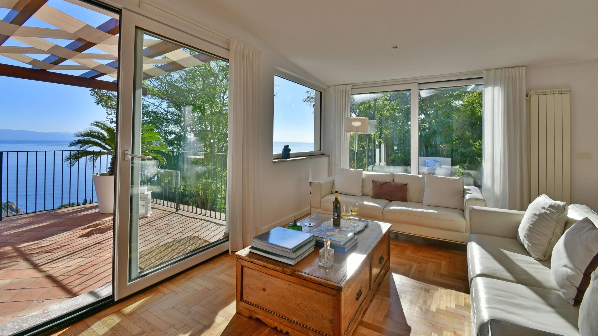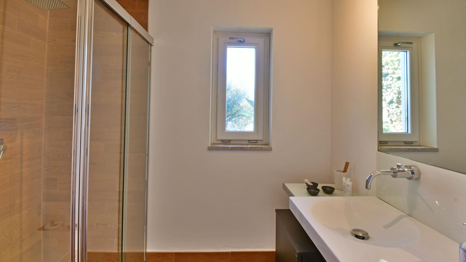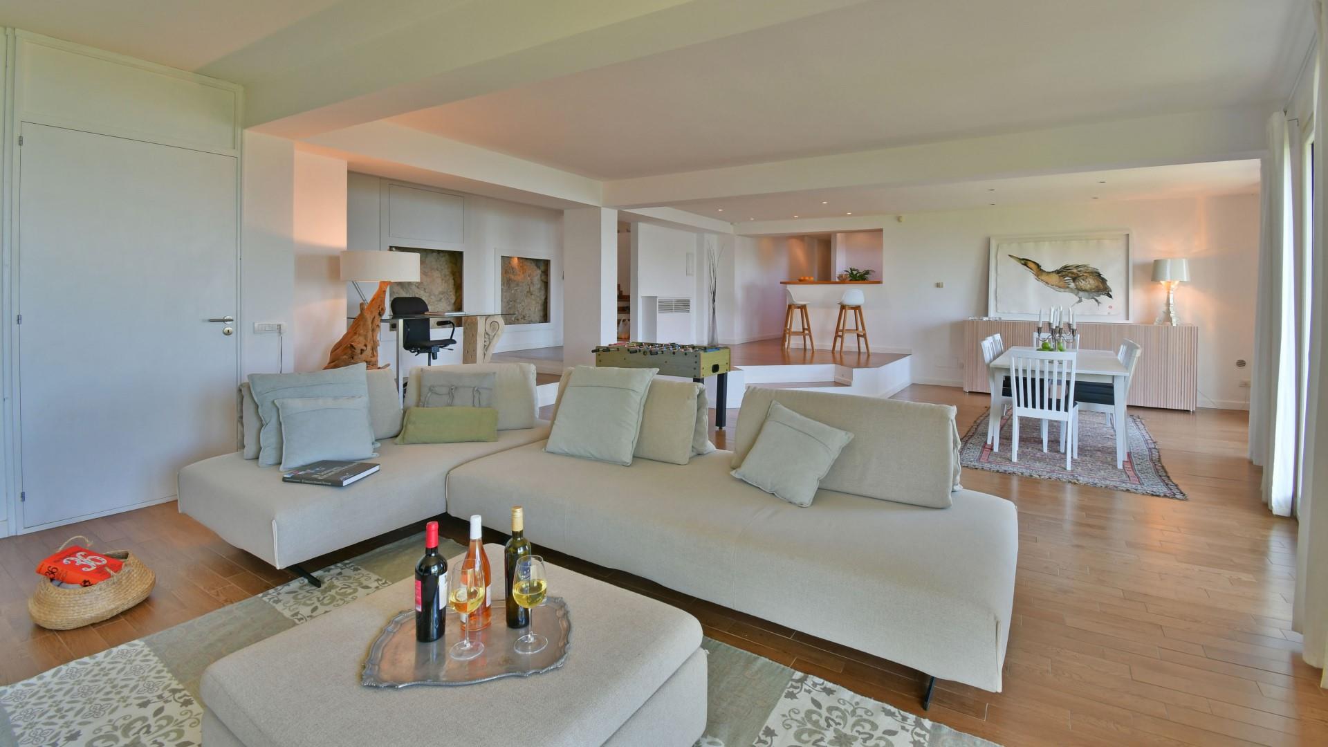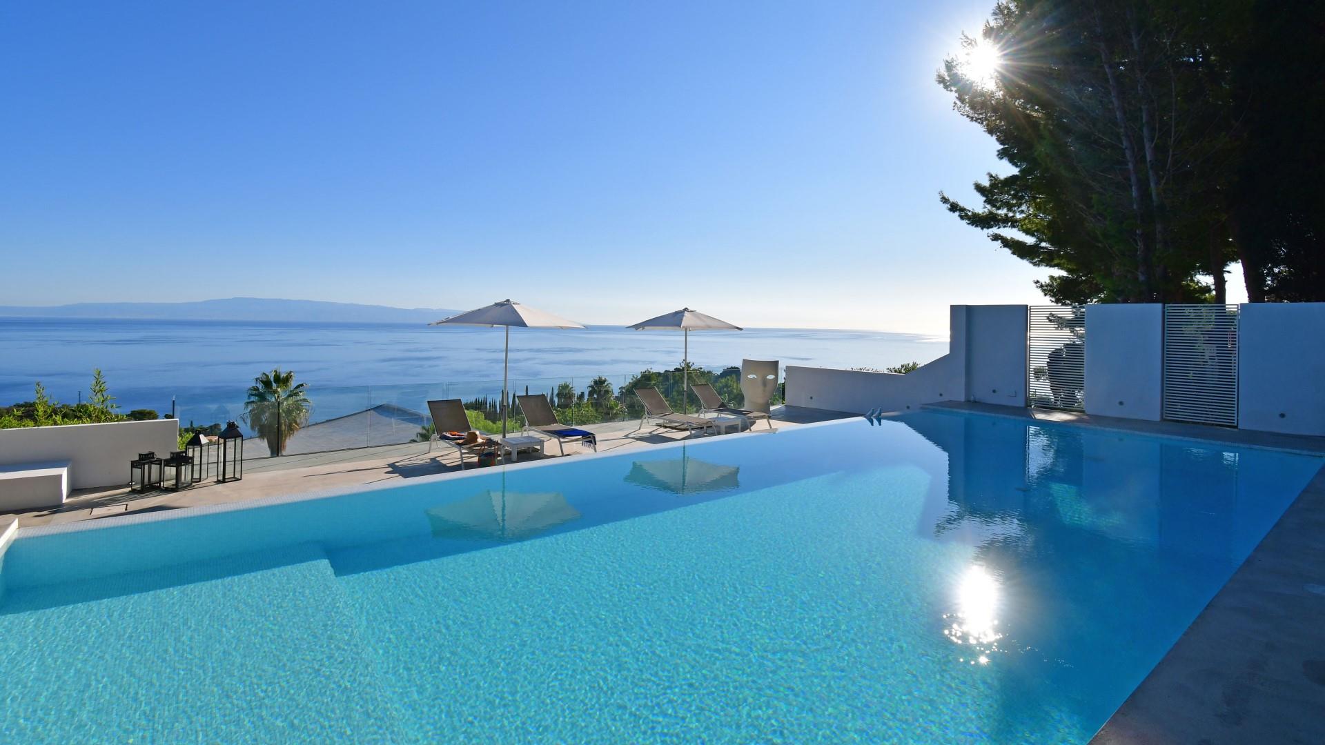 Das Interieur ist auf Komfort ausgelegt, mit einer attraktiven Mischung aus modernen Möbeln und einer Kombination aus großen Fenstern und hellem Parkett, die die Räume hell und luftig machen, die großzügigen Räume bieten Privatsphäre. Auf der oberen Ebene ist der geräumige Wohnbereich, der sich auf die Terrasse mit malerischem Meerblick erstreckt, der Ort für gesellige Zusammenkünfte. Auf einer noch tieferen Ebene lädt der große Infinity-Pool zu einem unvergesslichen Blick aufs Meer ein, und die Liegewiese ist so angelegt, dass man sich dank des romantischen Baldachins und eines attraktiven Designersessels im Zeichen schlichter Eleganz vollkommen entspannen kann. Wem die vielen Treppen nicht genügen, um sich fit zu halten, der wird den kleinen Fitnessraum auf der unteren Ebene sicher zu schätzen wissen.