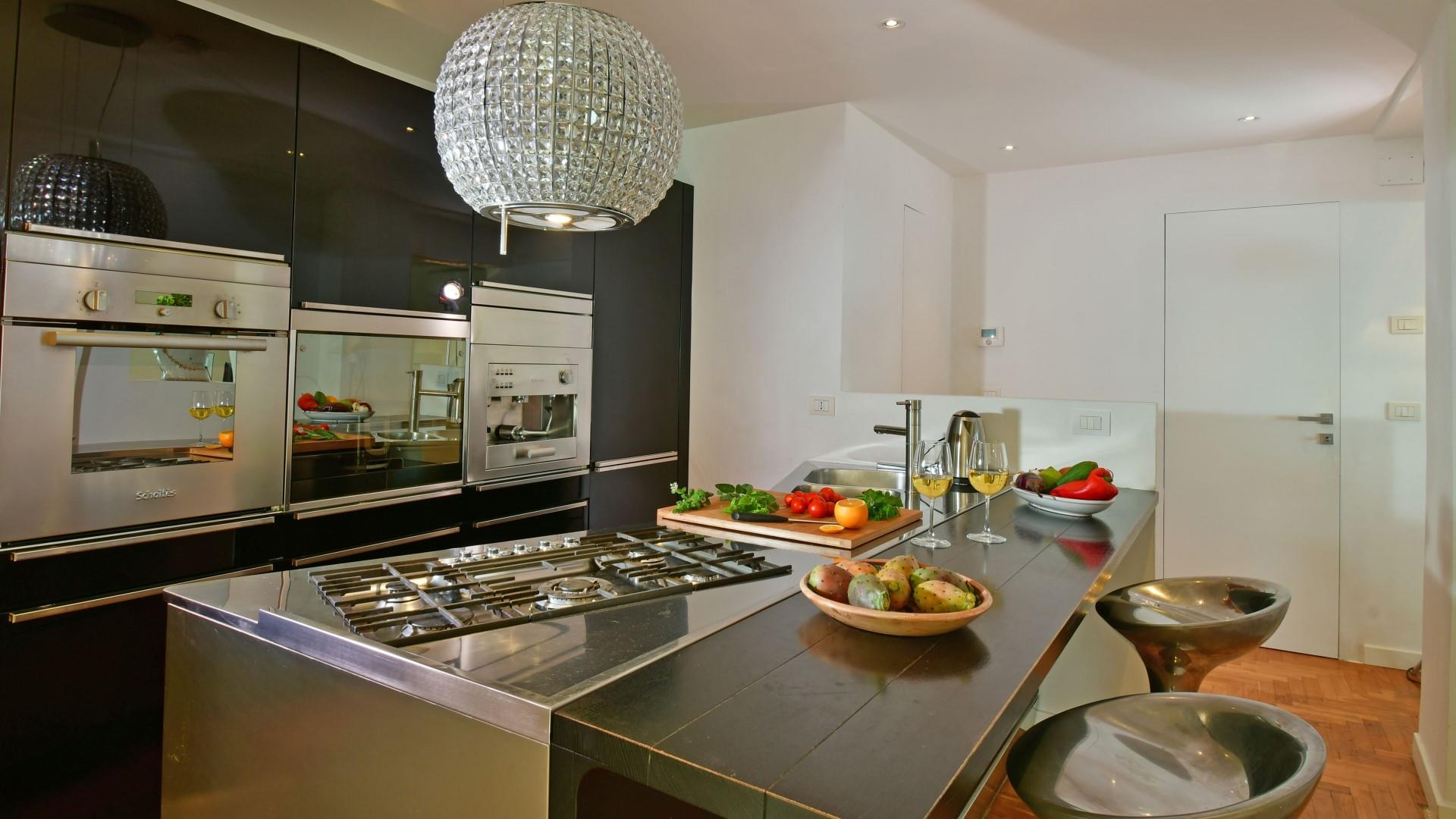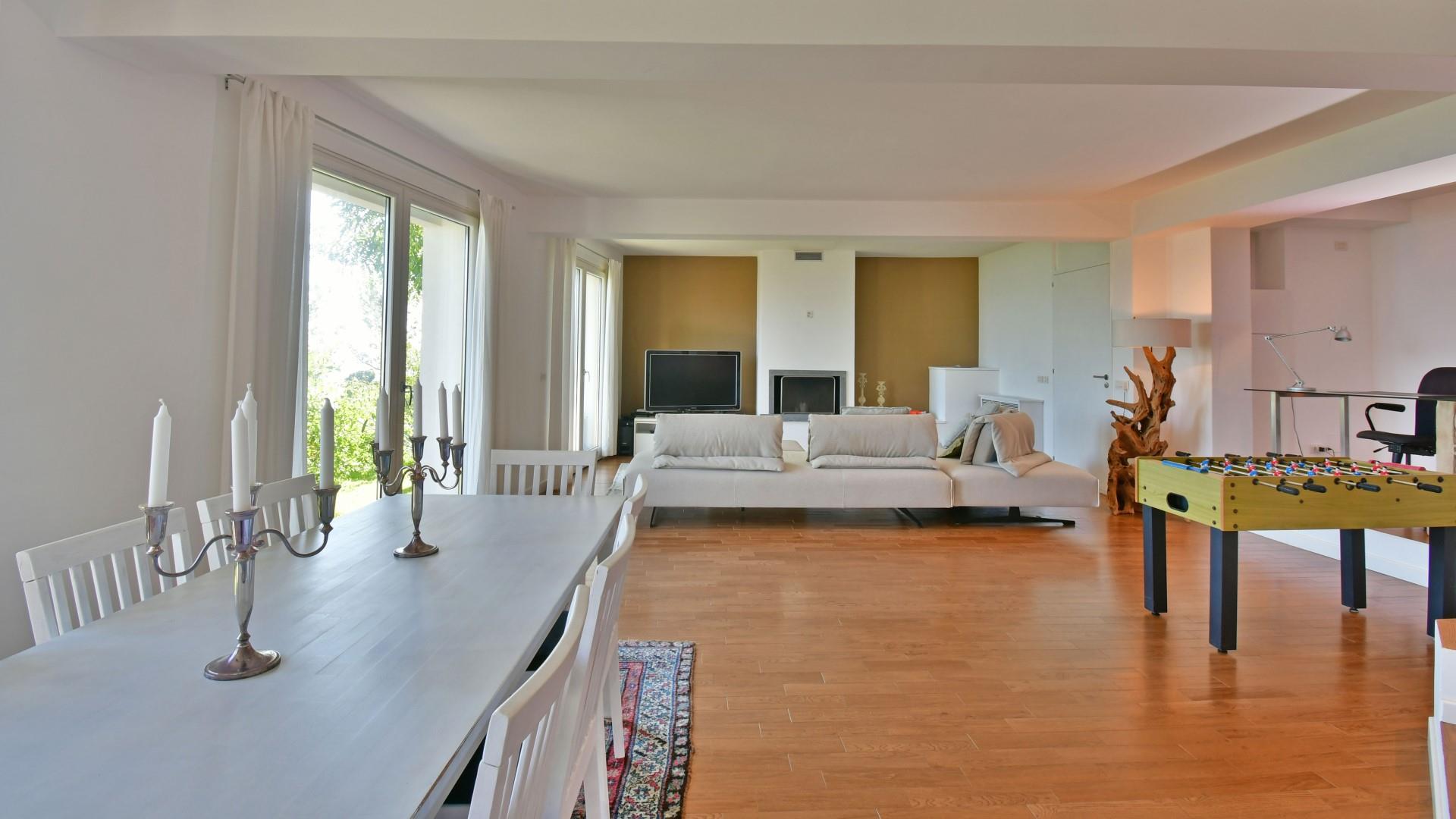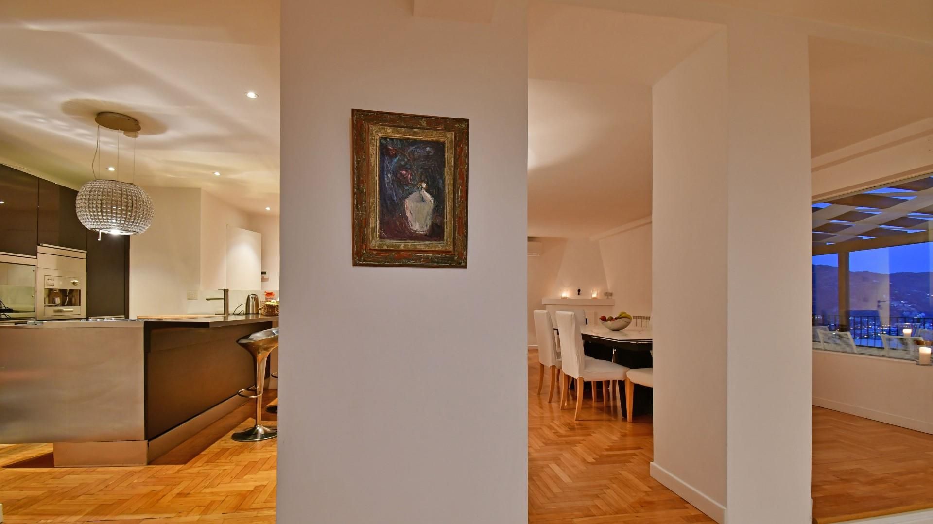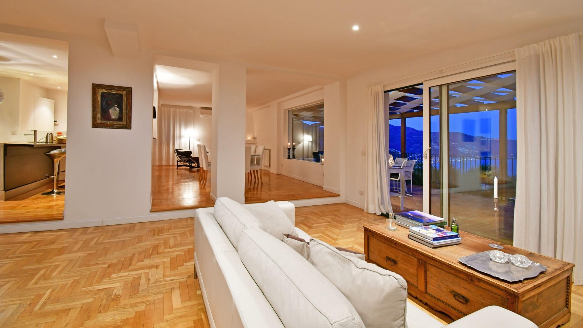 Das Interieur ist auf Komfort ausgelegt, mit einer attraktiven Mischung aus modernen Möbeln und einer Kombination aus großen Fenstern und hellem Parkett, die die Räume hell und luftig machen, die großzügigen Räume bieten Privatsphäre. Auf der oberen Ebene ist der geräumige Wohnbereich, der sich auf die Terrasse mit malerischem Meerblick erstreckt, der Ort für gesellige Zusammenkünfte. Auf einer noch tieferen Ebene lädt der große Infinity-Pool zu einem unvergesslichen Blick aufs Meer ein, und die Liegewiese ist so angelegt, dass man sich dank des romantischen Baldachins und eines attraktiven Designersessels im Zeichen schlichter Eleganz vollkommen entspannen kann. Wem die vielen Treppen nicht genügen, um sich fit zu halten, der wird den kleinen Fitnessraum auf der unteren Ebene sicher zu schätzen wissen.