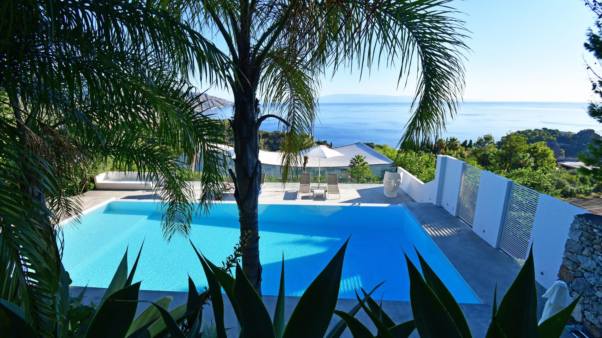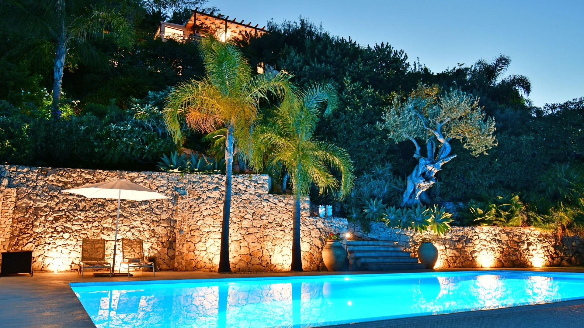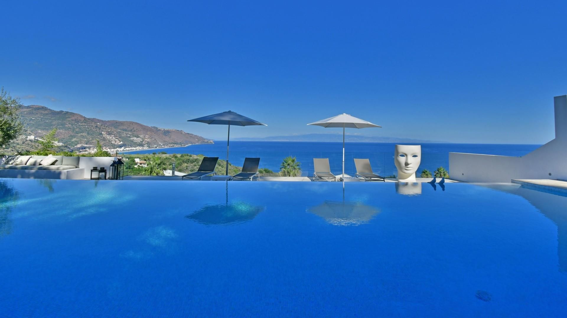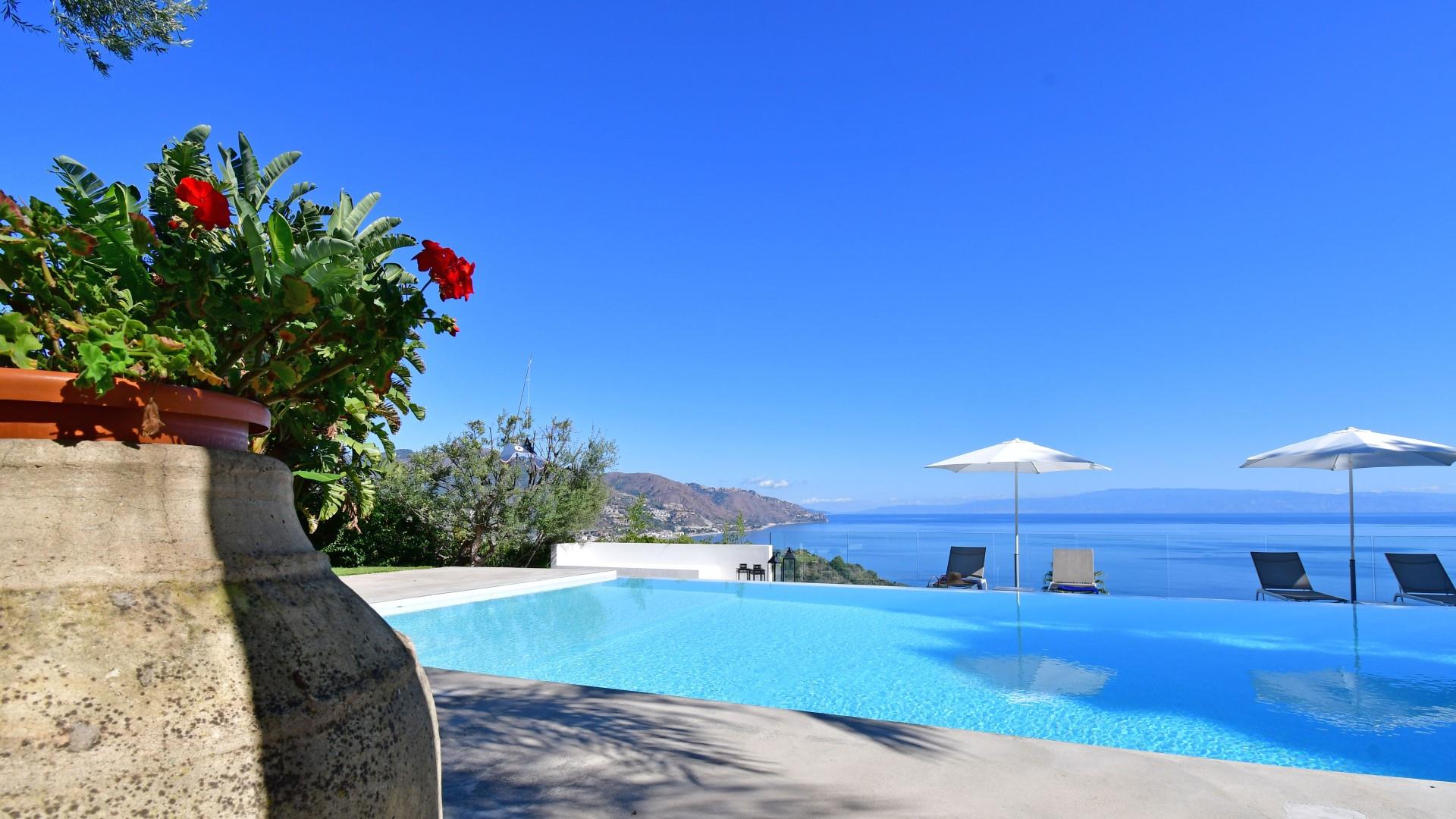 Der Poolbereich befindet sich auf einer unteren Ebene des Hauses und ist über einen ca. 150 m langen Weg bergab zu erreichen, teilweise über einen Pfad und teilweise über 20 Stufen. Der Infinity-Pool befindet sich auf der letzten Terrasse dieses großen Gartens und die Aussicht bleibt dank des Glasgeländers intakt. Von hier aus kann man die Küste von Taormina bis hin nach Kalabrien bewundern.