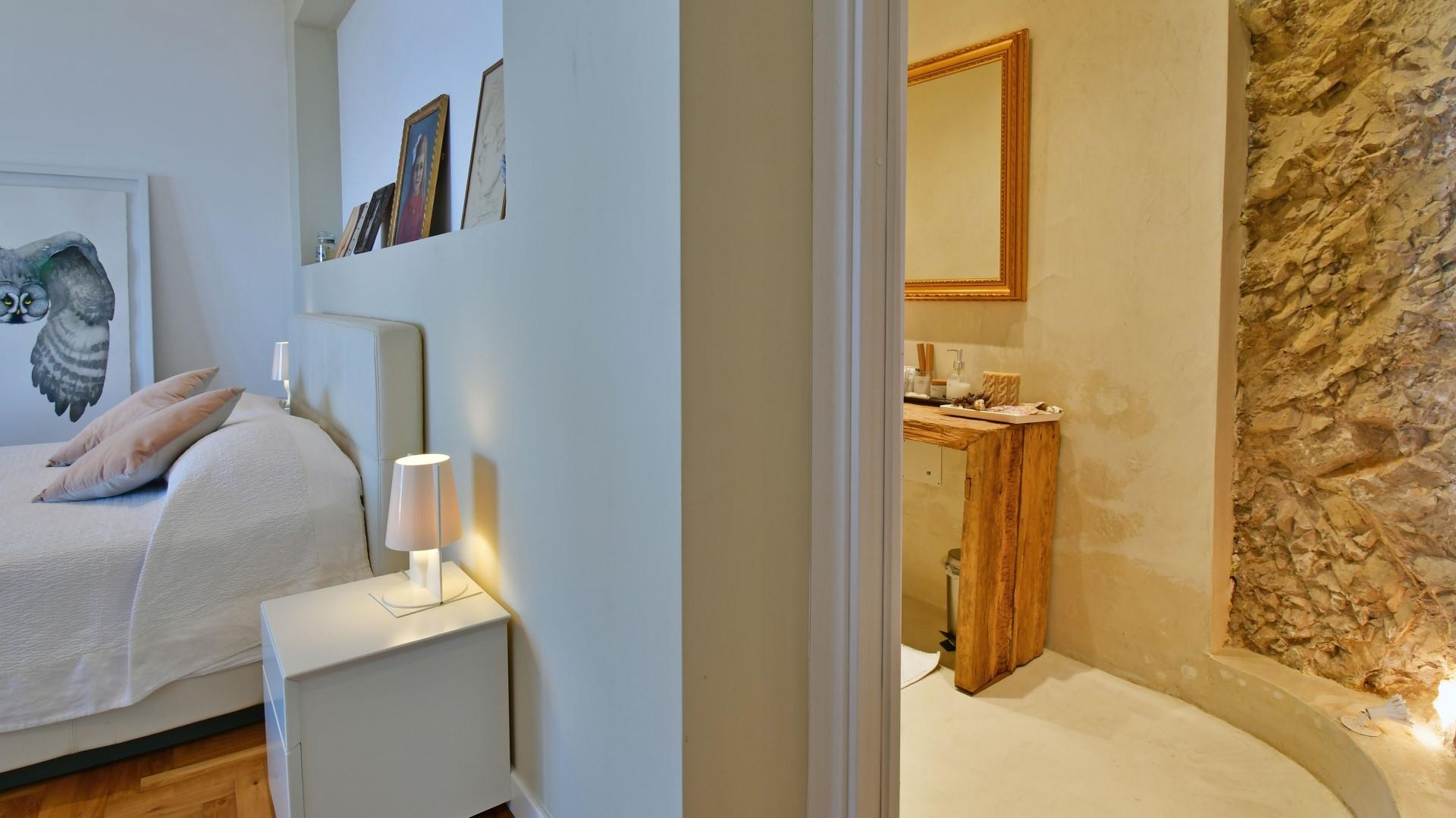 Über eine Treppe gelangt man in das Zwischengeschoss, wo sich die drei Schlafzimmer befinden. Das Hauptschlafzimmer hat ein eigenes Bad mit Dusche und eine Terrasse mit zwei Liegestühlen. Das Doppelschlafzimmer und das Einzelzimmer (1,40 m Bett) teilen sich ein geräumiges Badezimmer mit separater Badewanne und Dusche.