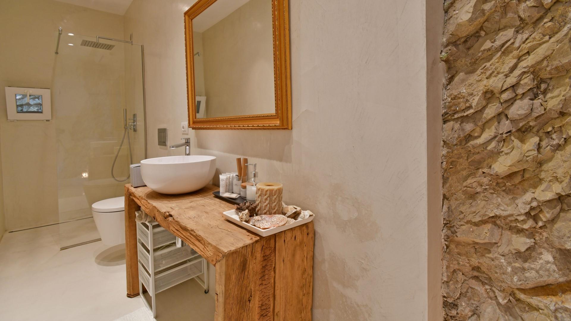Im Obergeschoss befindet sich eine Terrasse zum Entspannen, die sich perfekt für Aperitifs eignet. Auf der großen, schattigen Terrasse, die sich auf einer Ebene mit dem Wohnbereich befindet, können zahlreiche Mahlzeiten an einem großen Tisch eingenommen werden. Das Hauptschlafzimmer in der mittleren Etage hat eine eigene Terrasse, auf der man sich auf Sonnenliegen entspannen kann. Auf der unteren Etage befindet sich eine Rasenfläche, die ideal für Kinderspiele oder ein Picknick ist.