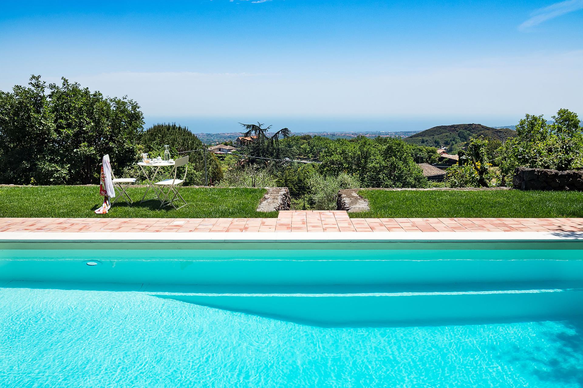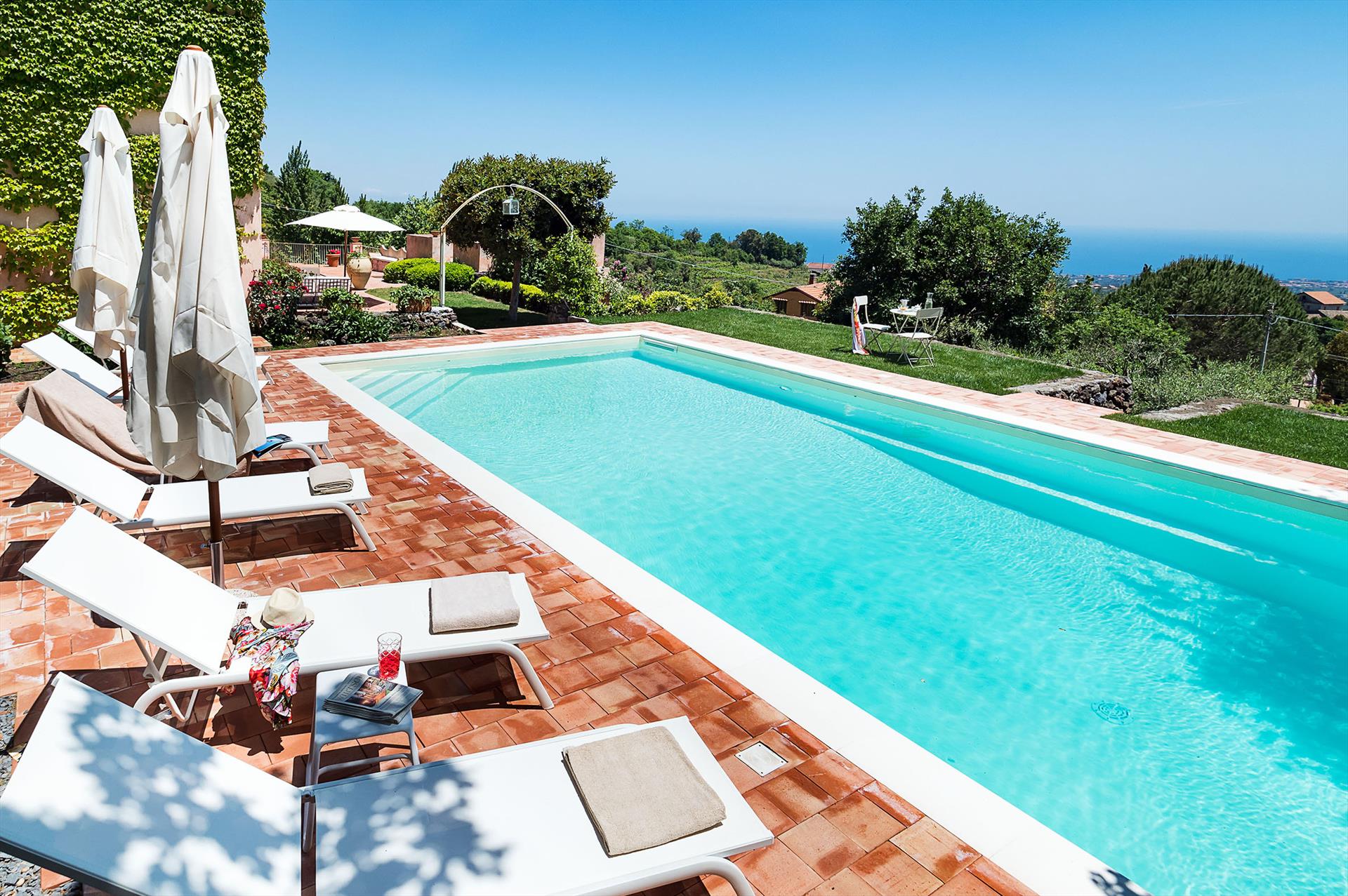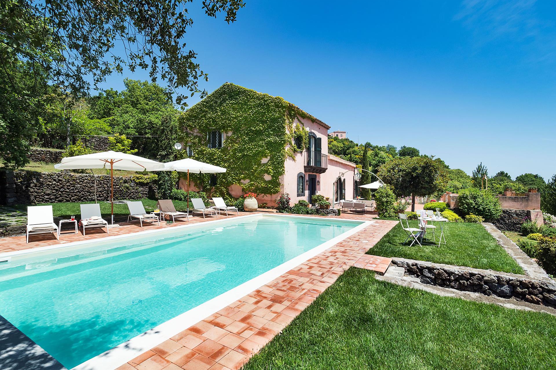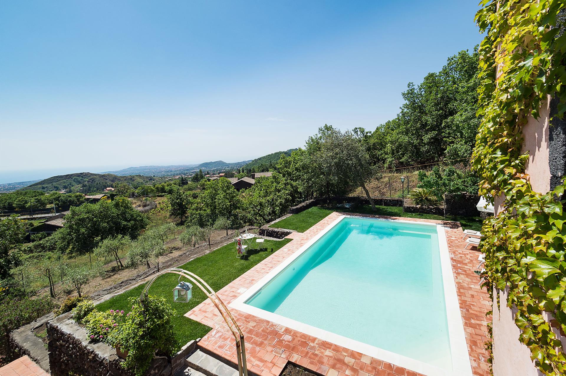 Villa Bellini ist eine herrliche Villa mit Schwimmbad an den Hängen des Ätna, zwischen den charakteristischen Dörfern Zafferana Etnea und Trecastagni. In ruhiger, sonniger Panoramalage gelegen, genießt das Anwesen einen bezaubernden Blick auf den Berg Ilice, der sich hinter ihm erhebt, während sich vor ihm der Blick über die Landschaft und das Meer erstreckt. Umgeben von einem gepflegten Garten, der das schöne, mit Salz gereinigte (chlorfreie) Schwimmbad und die großzügigen, ausgestatteten Terrassen umschließt, ist Villa Bellini der ideale Aufenthaltsort für alle, die Ruhe und direkten Kontakt zur Natur suchen. Die gemütlichen Innenräume der Villa, die sich durch eine romantische und raffinierte Atmosphäre auszeichnen, bestehen im Erdgeschoss aus einem großen Wohn-Esszimmer mit Küche, einem Doppelzimmer, einem Schlafzimmer mit französischem Bett, einem Einzelzimmer und zwei Badezimmern, von denen eines mit einer Dusche ausgestattet ist. Im Obergeschoss befindet sich das Hauptschlafzimmer mit einem Badezimmer mit Badewanne und Dusche. Die Villa ist auch mit Wi-Fi, Sat-TV, Waschmaschine und Geschirrspüler ausgestattet. Von der Villa aus sind neben der Naturlandschaft und den Dörfern des Ätna-Parks auch die interessantesten Orte der ionischen Küste wie Taormina, Catania und Syrakus in wenigen Kilometern zu erreichen.