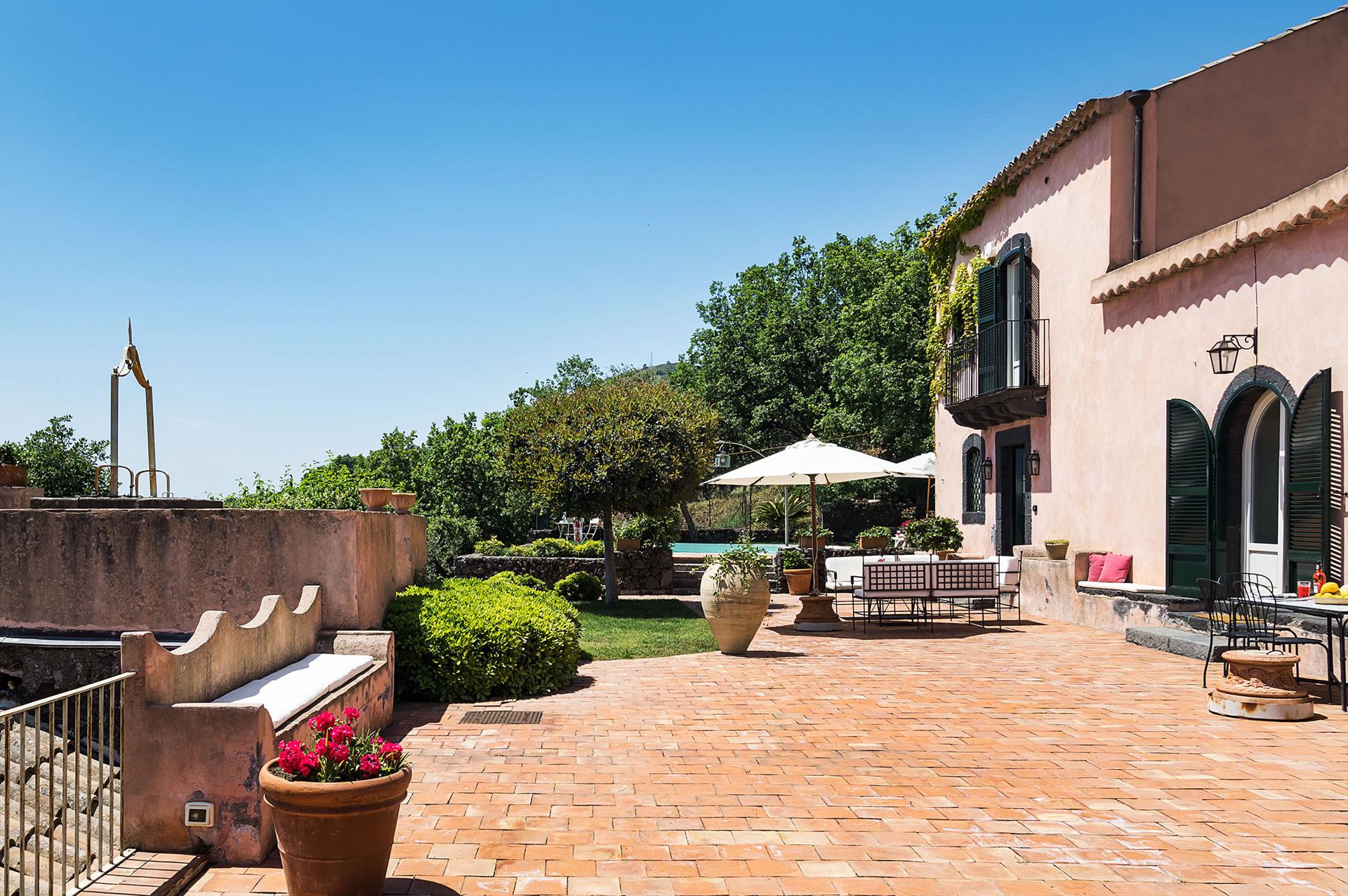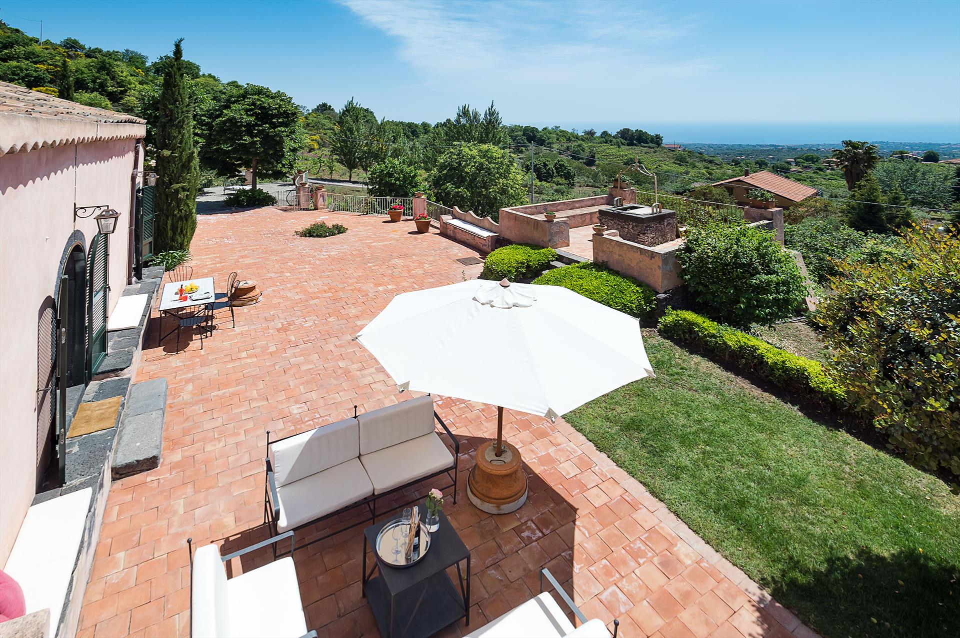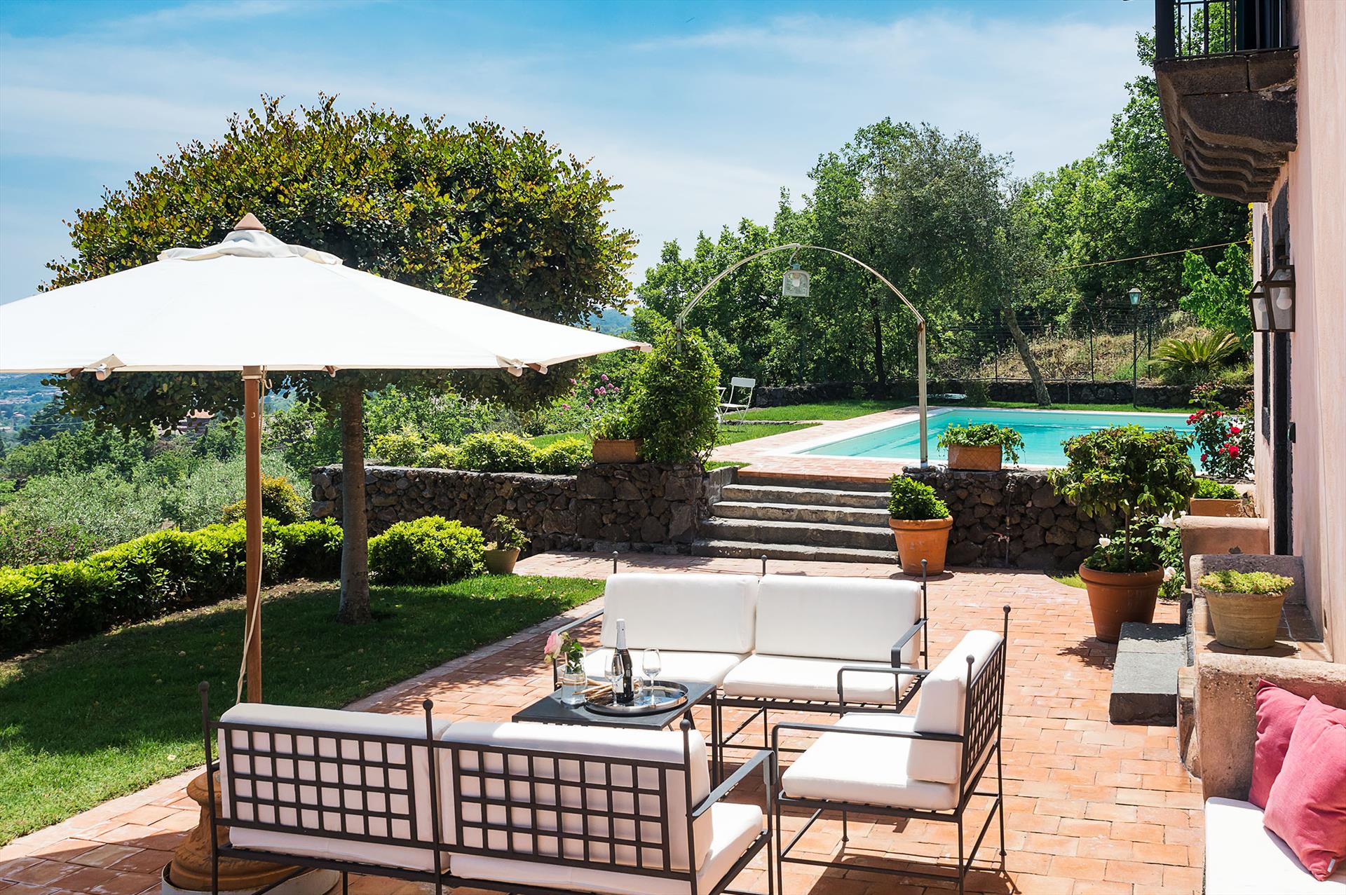 Villa Bellini ist eine herrliche Villa mit Schwimmbad an den Hängen des Ätna, zwischen den charakteristischen Dörfern Zafferana Etnea und Trecastagni. In ruhiger, sonniger Panoramalage gelegen, genießt das Anwesen einen bezaubernden Blick auf den Berg Ilice, der sich hinter ihm erhebt, während sich vor ihm der Blick über die Landschaft und das Meer erstreckt. Umgeben von einem gepflegten Garten, der das schöne, mit Salz gereinigte (chlorfreie) Schwimmbad und die großzügigen, ausgestatteten Terrassen umschließt, ist Villa Bellini der ideale Aufenthaltsort für alle, die Ruhe und direkten Kontakt zur Natur suchen. Die gemütlichen Innenräume der Villa, die sich durch eine romantische und raffinierte Atmosphäre auszeichnen, bestehen im Erdgeschoss aus einem großen Wohn-Esszimmer mit Küche, einem Doppelzimmer, einem Schlafzimmer mit französischem Bett, einem Einzelzimmer und zwei Badezimmern, von denen eines mit einer Dusche ausgestattet ist. Im Obergeschoss befindet sich das Hauptschlafzimmer mit einem Badezimmer mit Badewanne und Dusche. Die Villa ist auch mit Wi-Fi, Sat-TV, Waschmaschine und Geschirrspüler ausgestattet. Von der Villa aus sind neben der Naturlandschaft und den Dörfern des Ätna-Parks auch die interessantesten Orte der ionischen Küste wie Taormina, Catania und Syrakus in wenigen Kilometern zu erreichen.